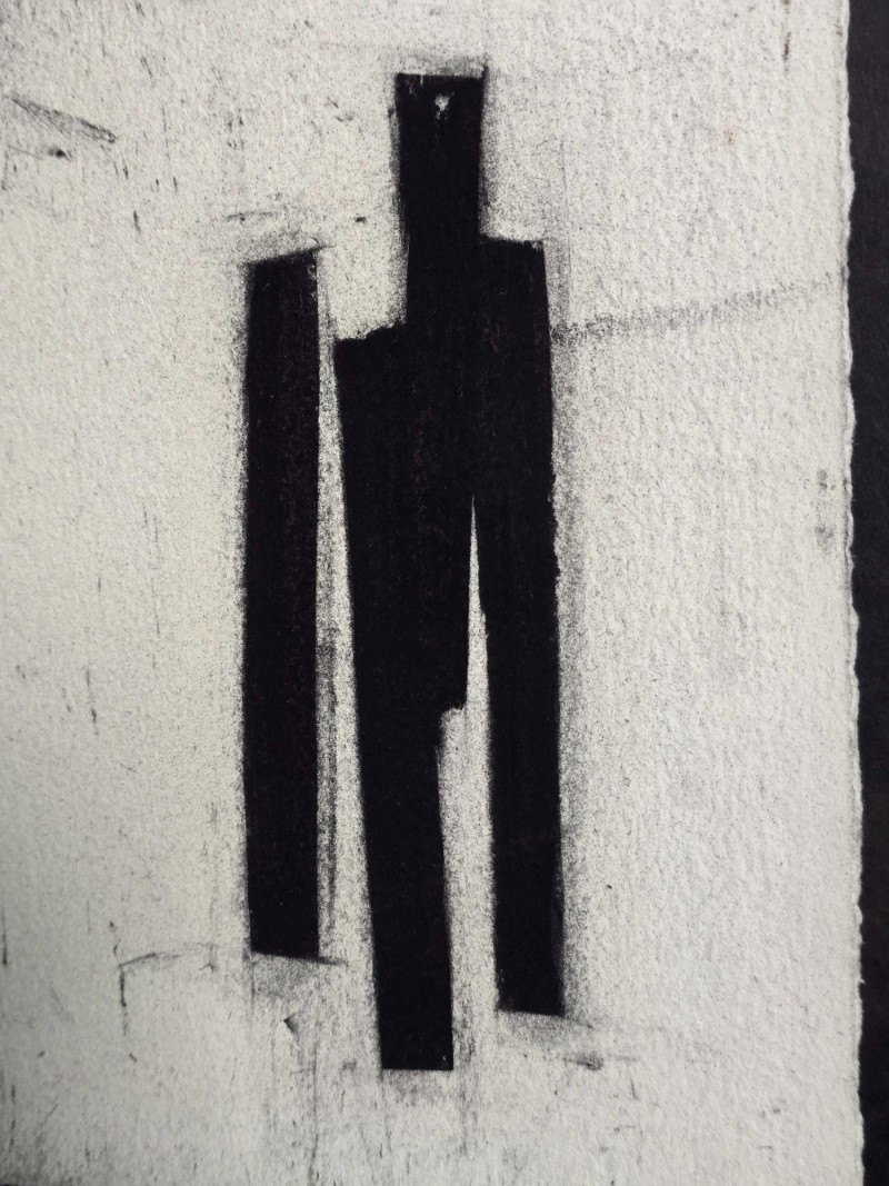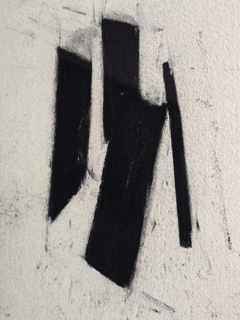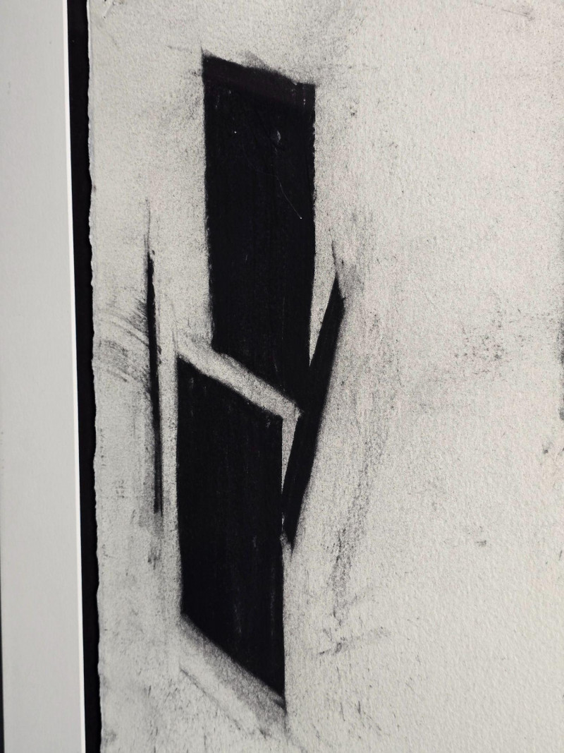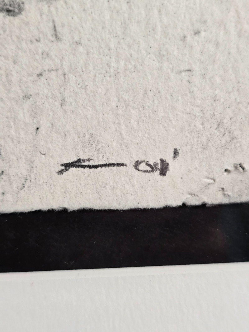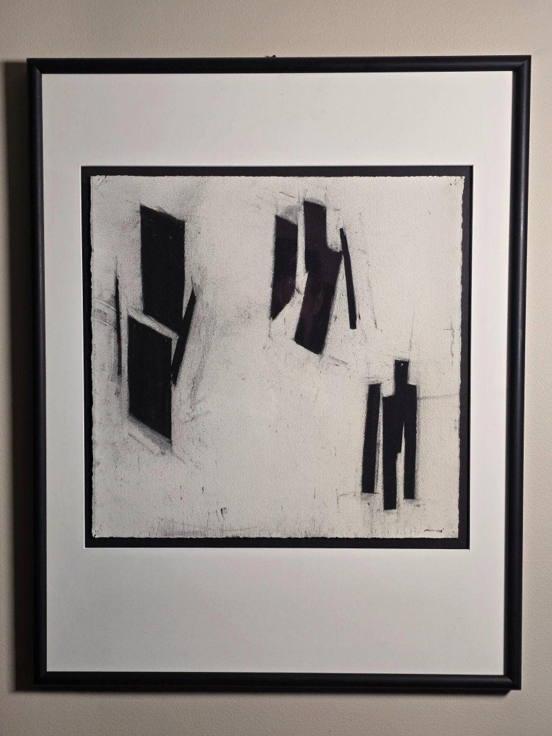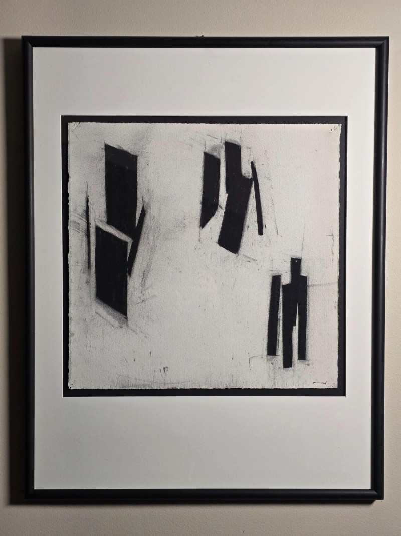 Original black and white abstract artwork by Karlis Rekevics, signed and dated either ’01 or ’04. This piece was purchased directly from the artist during his time living and working in Seattle. Strong linear movement and tonal contrast characteristic of Rekevics’ early 2000s practice. Presented in its existing frame as acquired. Karlis Rekevics (b. 1970) is an American sculptor and visual artist known for his explorations of urban form, industrial materials, and the tension between structure and impermanence. His work often incorporates cast concrete, wood, and steel, translating architectural fragments into sculptural studies of memory, environment, and spatial disruption. Before establishing his studio practice in New York, Rekevics spent time in Seattle, where he produced a series of drawings and monochrome abstractions that informed his later sculptural vocabulary. His work has been exhibited nationally and internationally, with pieces held in private and institutional collections.Artist Bio