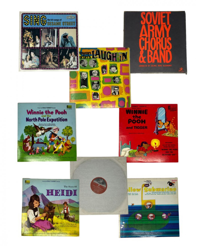 Collection of eight vintage 12" vinyl records spanning children’s storybook albums, television tie‑ins, choral music, and classical performance. Titles include Yellow Submarine (Happy House), The Story of Heidi, Winnie the Pooh and the North Pole Expedition, Winnie the Pooh and Tigger, Rowan & Martin’s Laugh‑In, Sing: The Hit Songs of Sesame Street, Soviet Army Chorus & Band, and Brahms: Concerto No. 2 in B‑Flat Major, Op. 83 in a plain sleeve. Covers show expected age‑related wear; vinyl condition varies. Sold as found. Includes (8 total): Yellow Submarine – Happy House The Story of Heidi Winnie the Pooh and the North Pole Expedition Winnie the Pooh and Tigger Rowan & Martin’s Laugh‑In Sing: The Hit Songs of Sesame Street Soviet Army Chorus & Band Brahms: Concerto No. 2 in B‑Flat Major, Op. 83 – plain sleeve Notes: