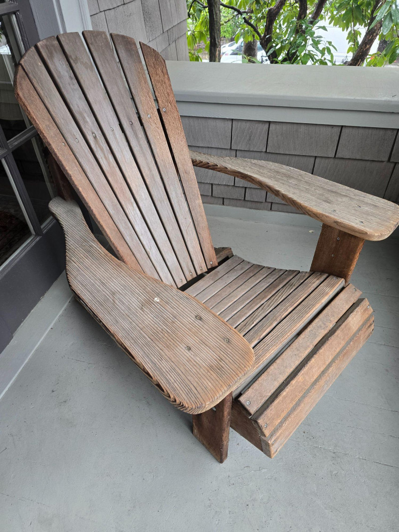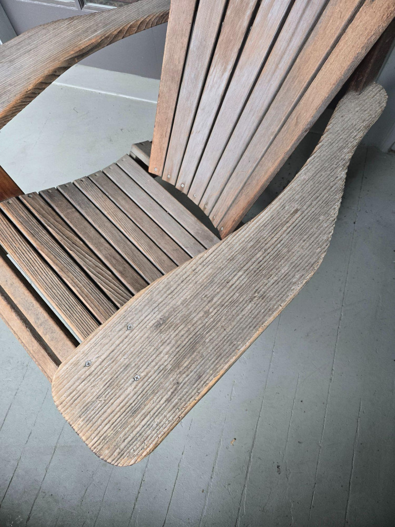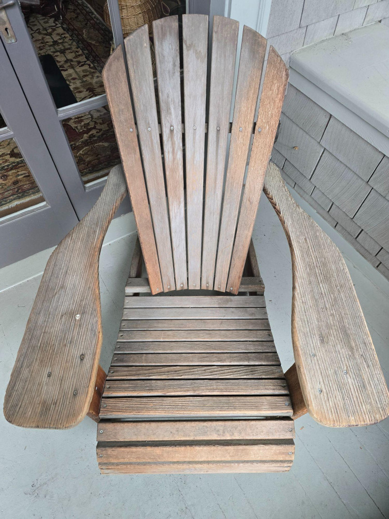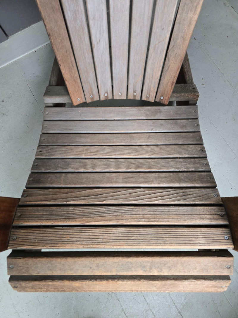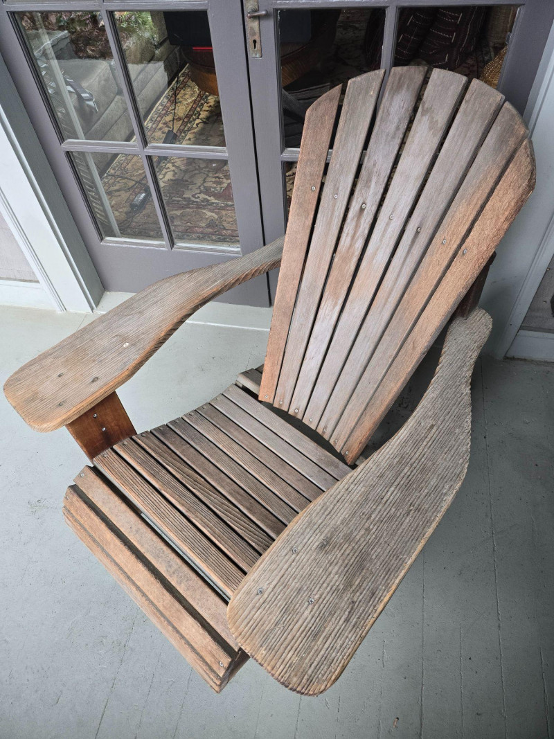 A timeless wooden Adirondack chair reflecting the classic American outdoor design that became widely popular from the 1930s through the mid‑20th century. This example features the hallmark elements of the period: a deeply angled seat, wide paddle‑style armrests, and a tall slatted back designed for relaxed porch or garden lounging. The construction and profile align with traditional cottage, lodge, and coastal styles that defined mid‑century outdoor furniture across lake cabins and summer homes. The wood shows the natural patina and weathering associated with age and outdoor use, giving it the warm, lived‑in character collectors and decorators appreciate in earlier Adirondack forms. The left side shows visible wear, photographed clearly for review. Overall, the chair retains its sturdy, functional build and the iconic silhouette that has made this design a lasting staple of American leisure culture. Condition Solid and functional with surface wear consistent with age and outdoor exposure. Notable wear on the left side, as shown in photos. Please review all images for details.