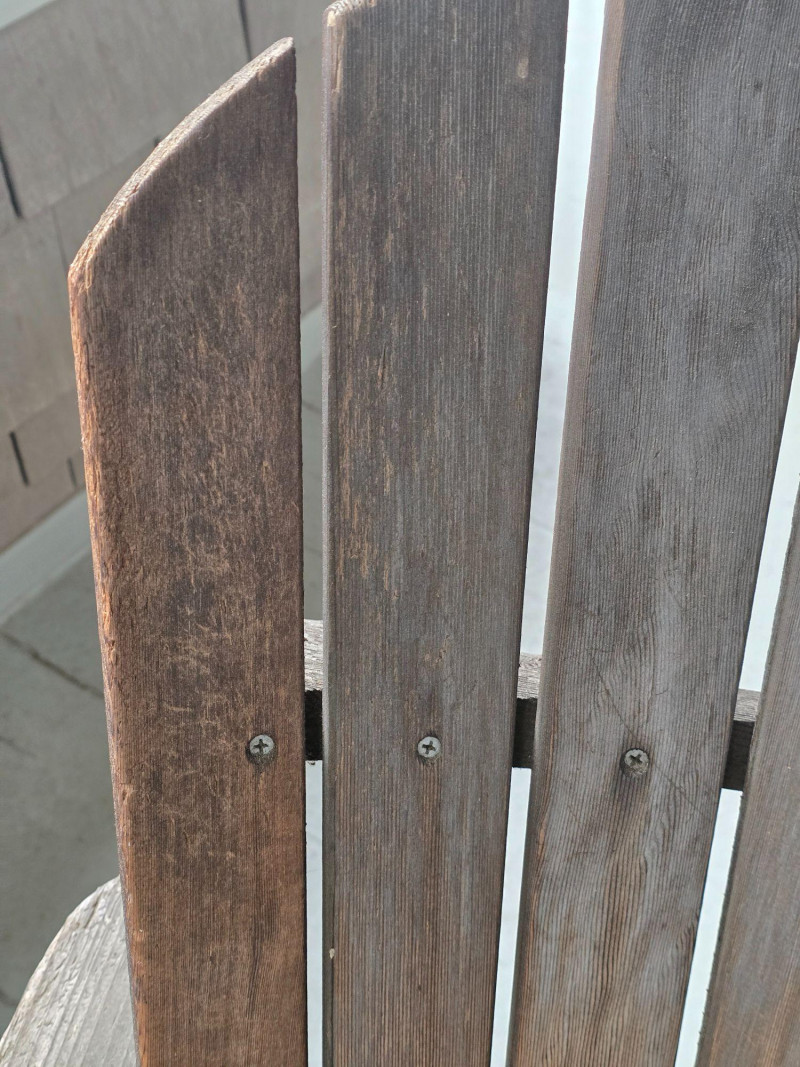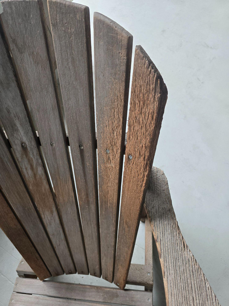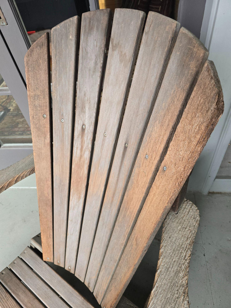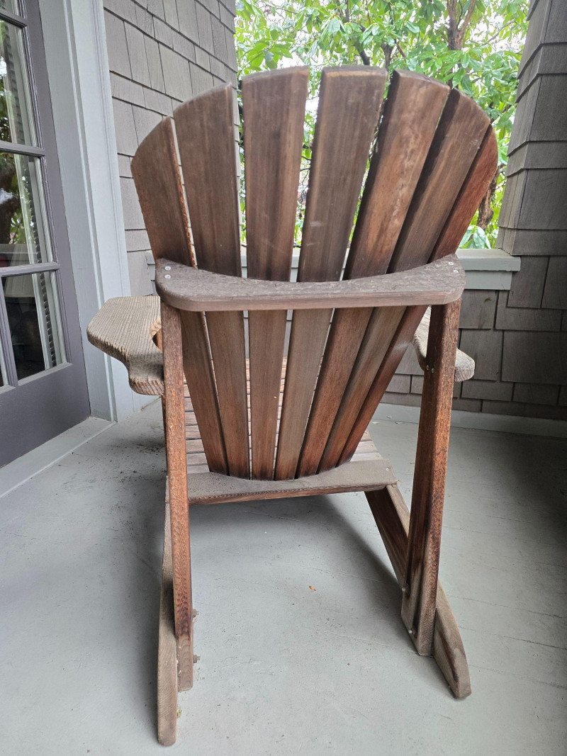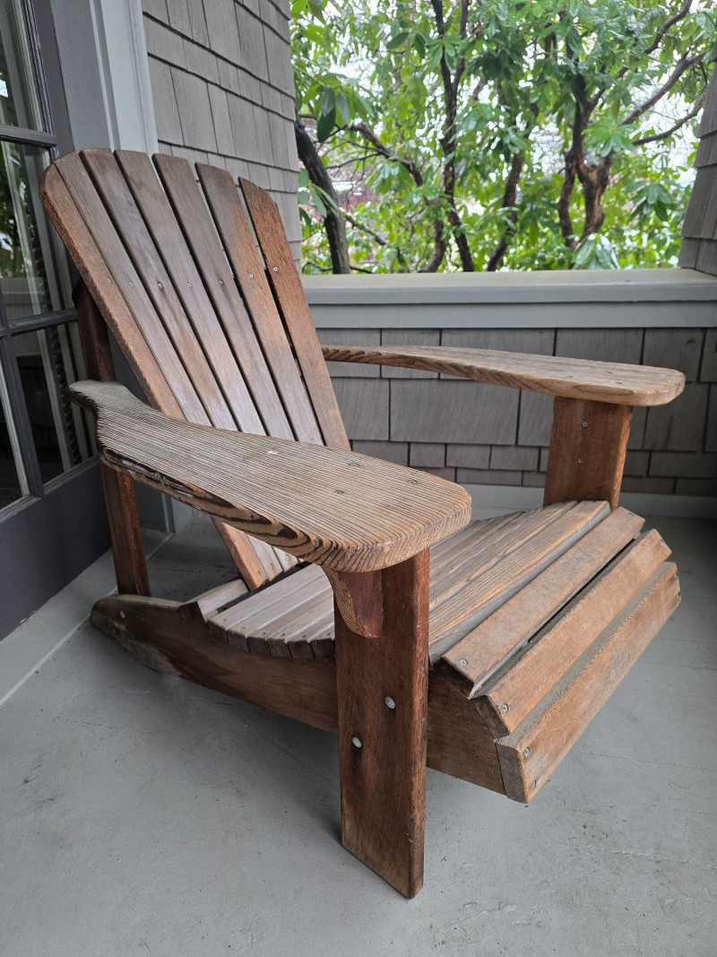 A timeless wooden Adirondack chair reflecting the classic American outdoor design that became widely popular from the 1930s through the mid‑20th century. This example features the hallmark elements of the period: a deeply angled seat, wide paddle‑style armrests, and a tall slatted back designed for relaxed porch or garden lounging. The construction and profile align with traditional cottage, lodge, and coastal styles that defined mid‑century outdoor furniture across lake cabins and summer homes. The wood shows the natural patina and weathering associated with age and outdoor use, giving it the warm, lived‑in character collectors and decorators appreciate in earlier Adirondack forms. The left side shows visible wear, photographed clearly for review. Overall, the chair retains its sturdy, functional build and the iconic silhouette that has made this design a lasting staple of American leisure culture. Condition Solid and functional with surface wear consistent with age and outdoor exposure. Notable wear on the left side, as shown in photos. Please review all images for details.