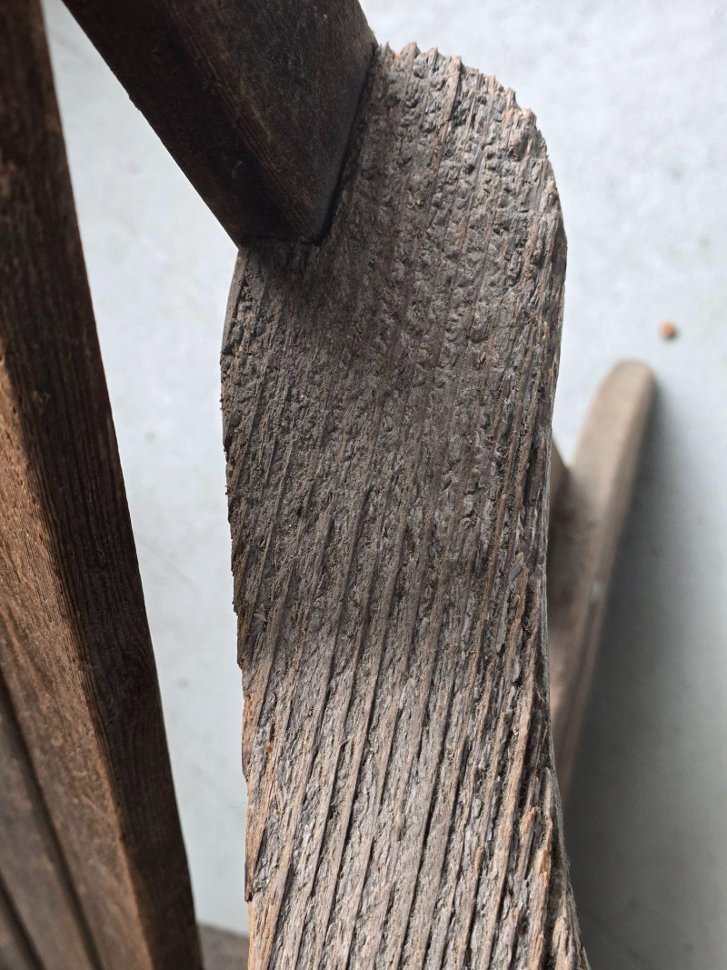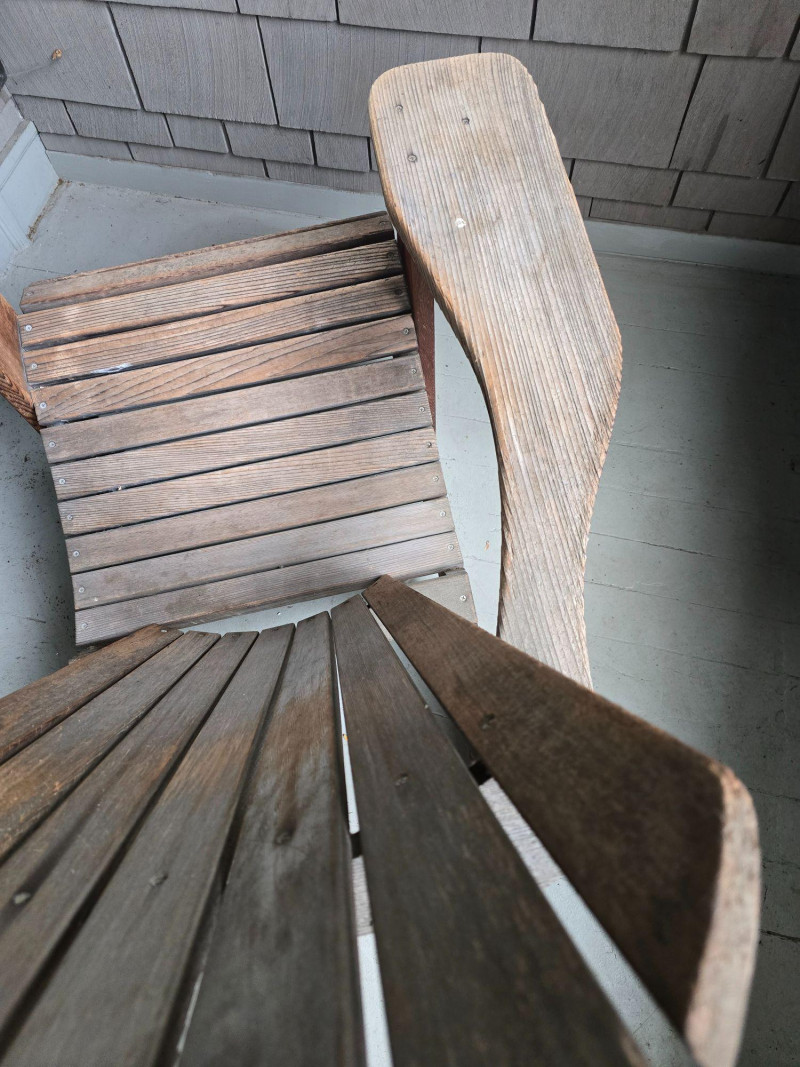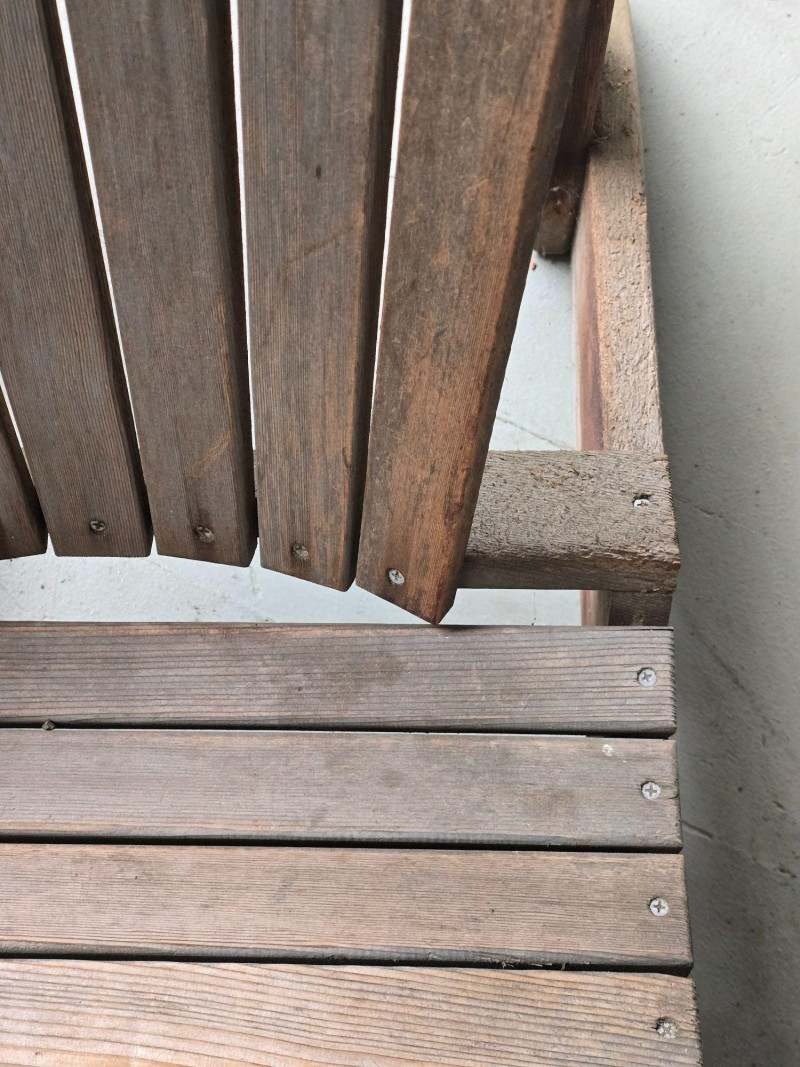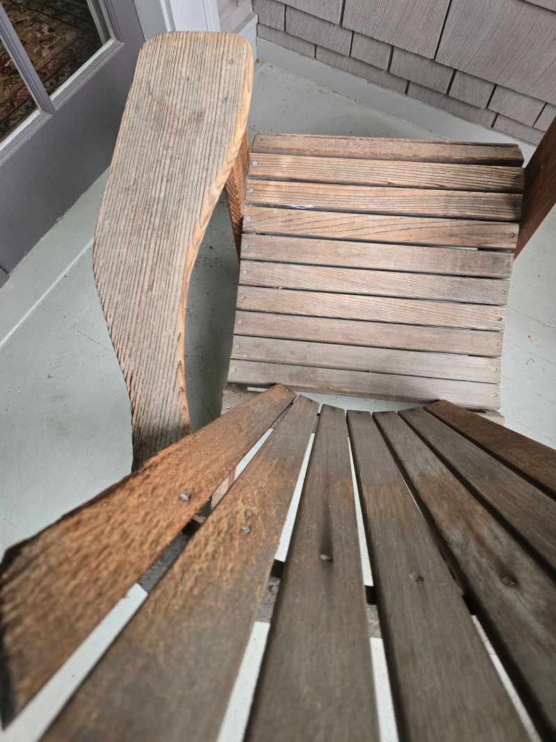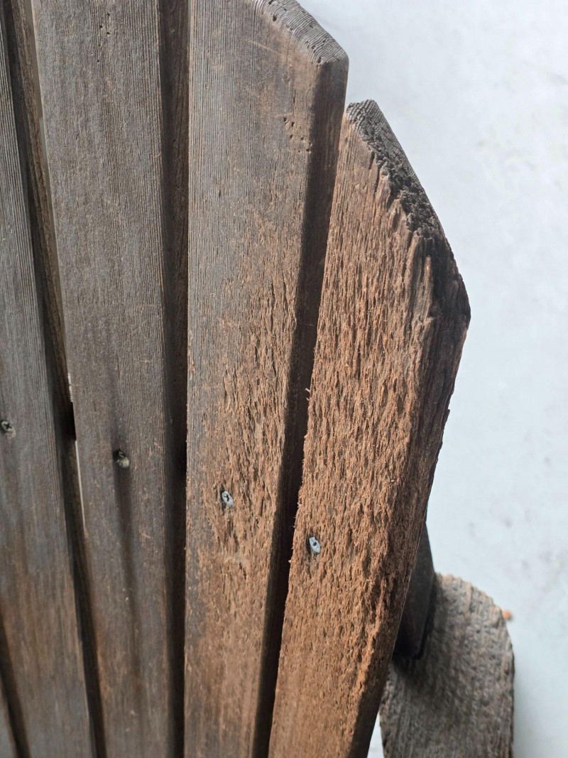 A timeless wooden Adirondack chair reflecting the classic American outdoor design that became widely popular from the 1930s through the mid‑20th century. This example features the hallmark elements of the period: a deeply angled seat, wide paddle‑style armrests, and a tall slatted back designed for relaxed porch or garden lounging. The construction and profile align with traditional cottage, lodge, and coastal styles that defined mid‑century outdoor furniture across lake cabins and summer homes. The wood shows the natural patina and weathering associated with age and outdoor use, giving it the warm, lived‑in character collectors and decorators appreciate in earlier Adirondack forms. The left side shows visible wear, photographed clearly for review. Overall, the chair retains its sturdy, functional build and the iconic silhouette that has made this design a lasting staple of American leisure culture. Condition Solid and functional with surface wear consistent with age and outdoor exposure. Notable wear on the left side, as shown in photos. Please review all images for details.