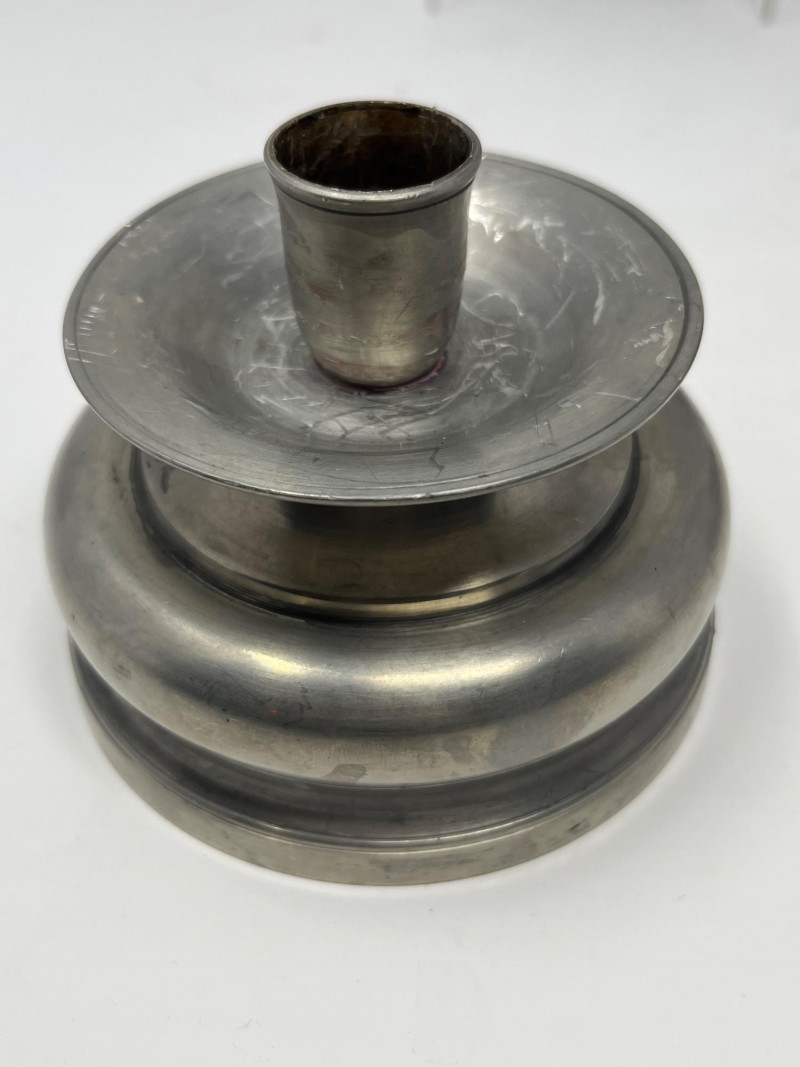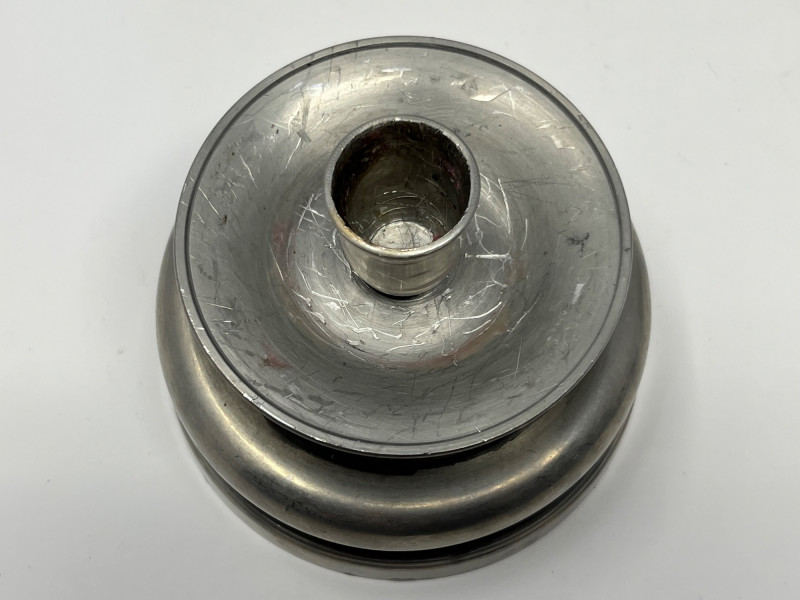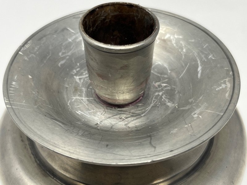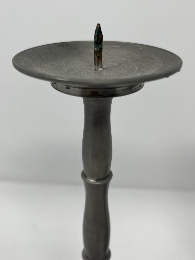 Offered is a set of five vintage pewter candlesticks, including two tall forms and three shorter matching pieces. Each features classic turned silhouettes, wide 4.5" bases, and a soft pewter patina consistent with age. A small signature or maker’s mark is present on the underside rim of the candlesticks. The mark is faint but visible upon close inspection. Condition varies across the group. Some components show surface wear, scratches, or assembly inconsistencies, and several pieces have been photographed with red indicators to show areas of concern. No major cracks or structural breaks observed. Please review all photos carefully. A versatile decorative lot suitable for display, restoration, or repurposing. Dimensions: