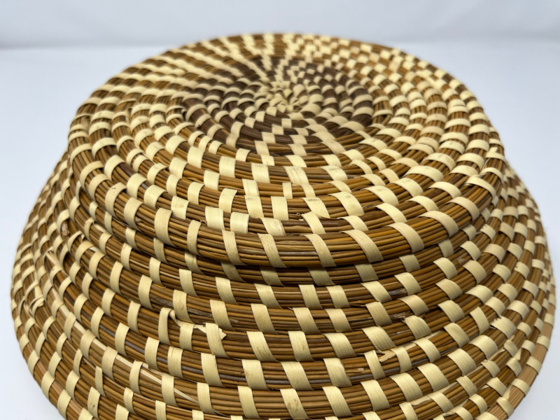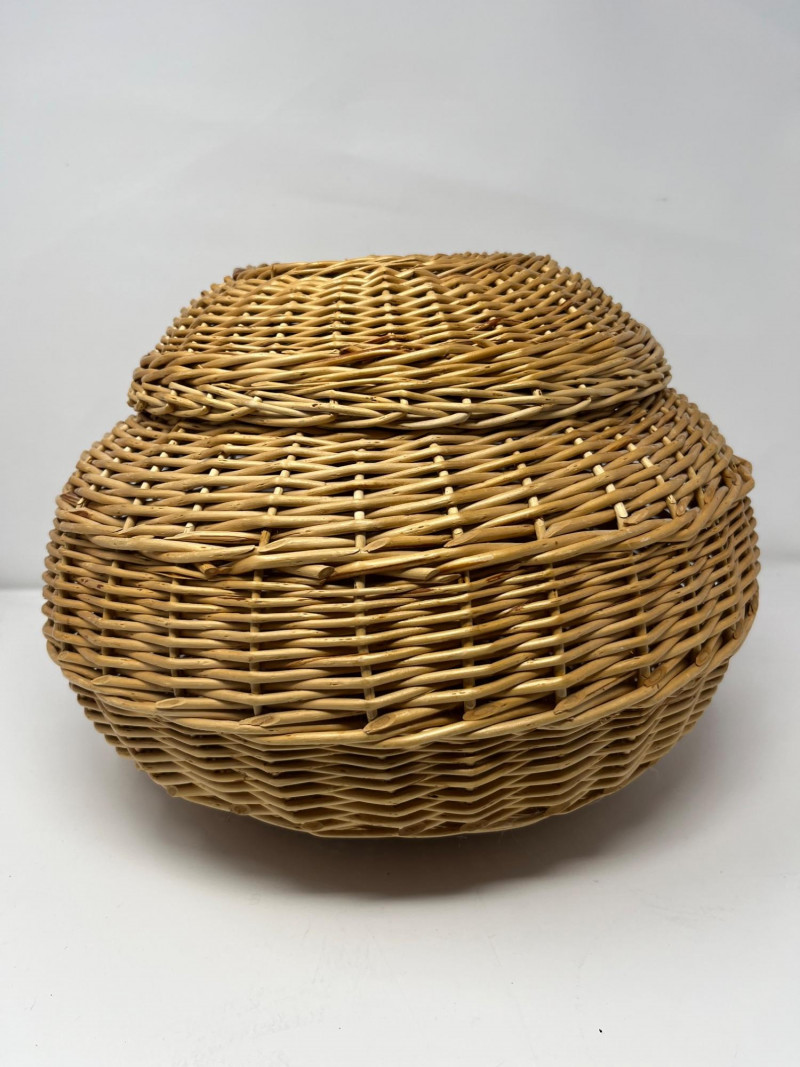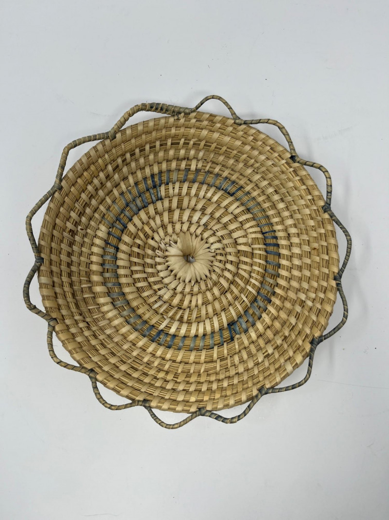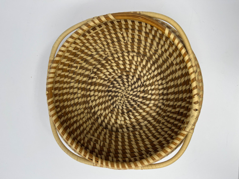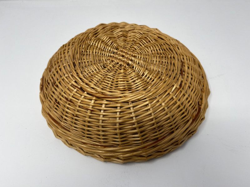 Collection of ten woven baskets in a variety of forms, weaving styles, and natural fiber materials. The lot includes round, oval, lidded, handled, and shallow tray-style pieces, each showcasing different construction techniques and patterns. Colors range from natural neutrals to select pieces with dyed accent weaving. Ideal for décor, storage, display, or prop use. Light surface wear consistent with age and handling. A versatile group for home styling or craft applications. NOTES