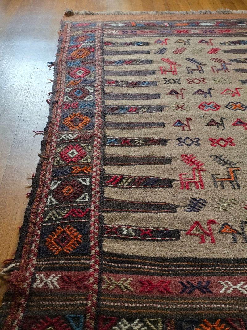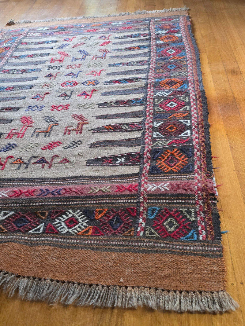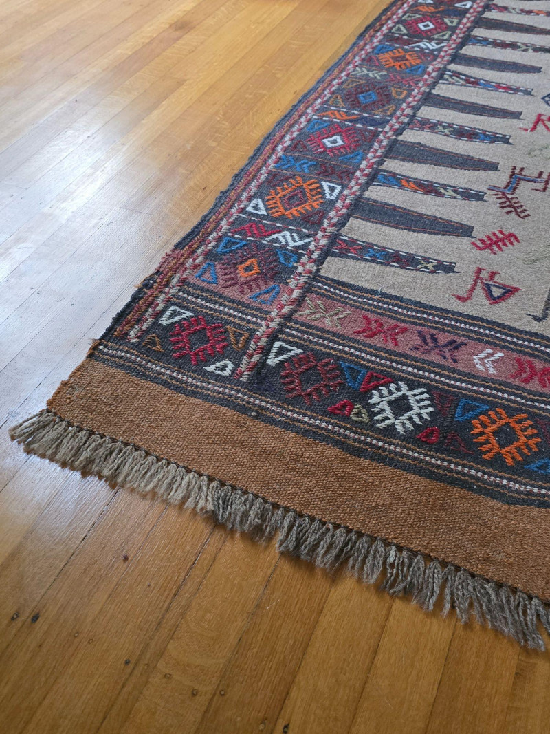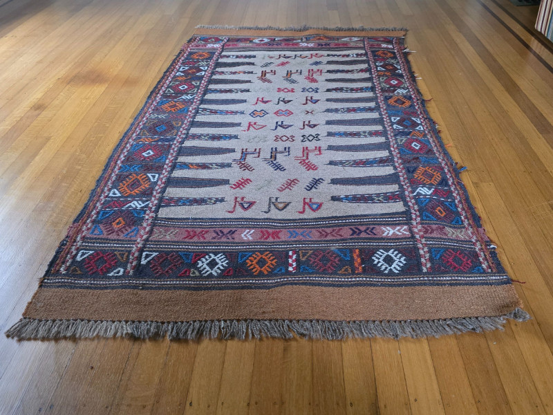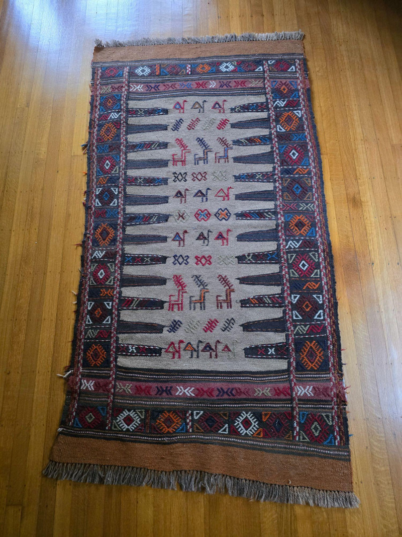 A beautifully handwoven vintage rug featuring classic tribal and geometric motifs in a warm, earthy palette. The design showcases a central medallion structure framed by intricate borders, with stylized symbols and colorwork characteristic of mid‑20th‑century weaving traditions. The wool pile displays natural tonal variation and crisp pattern definition, offering both visual depth and authentic handmade character. The reverse shows a traditional flatwoven foundation, and the included rug pad provides added stability and comfort. A versatile piece suited for collectors, textile enthusiasts, and décor settings seeking vintage warmth and global influence. Condition consistent with age and use. Rug pad included.