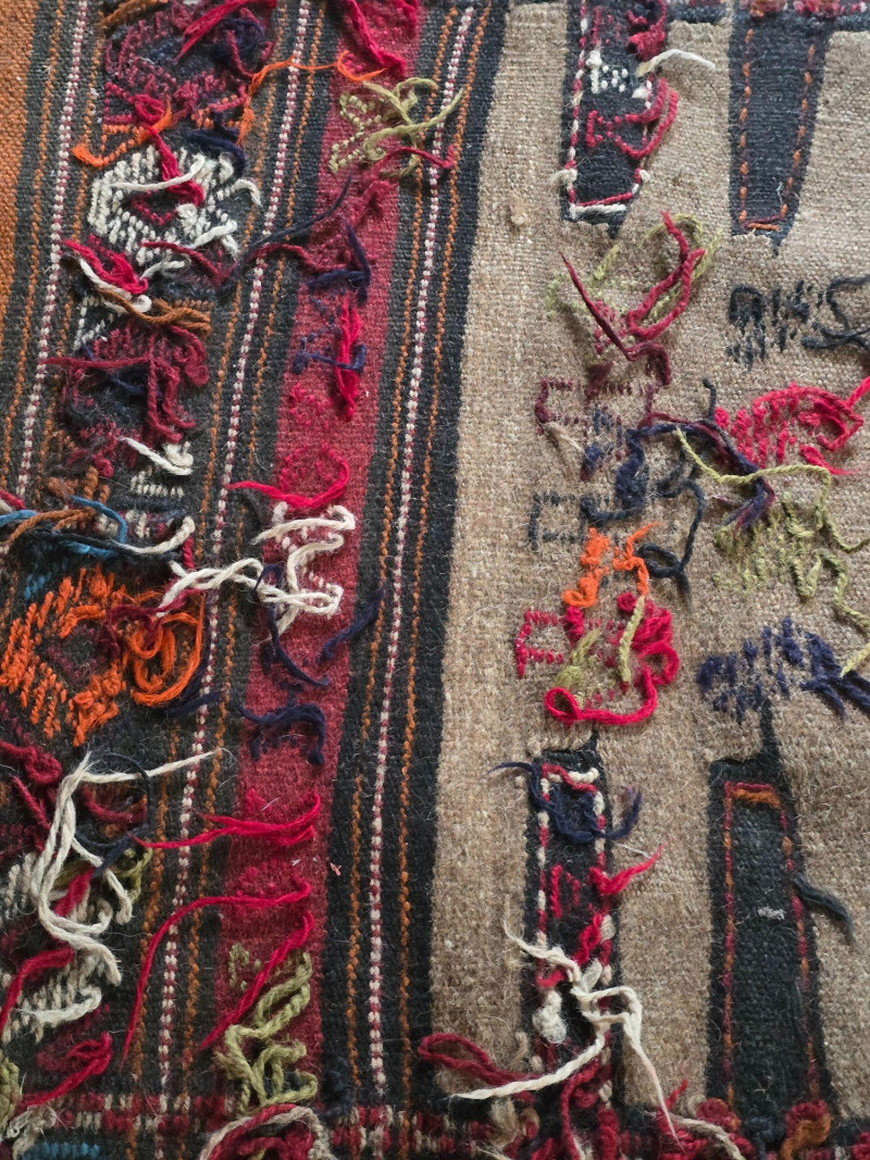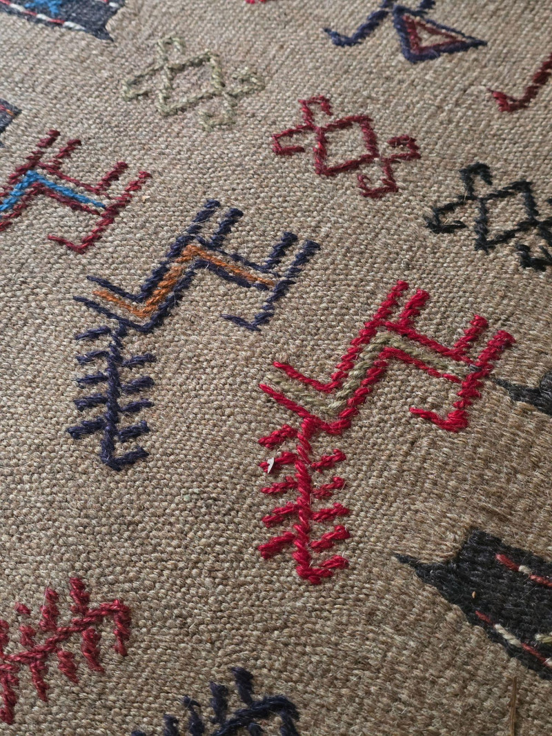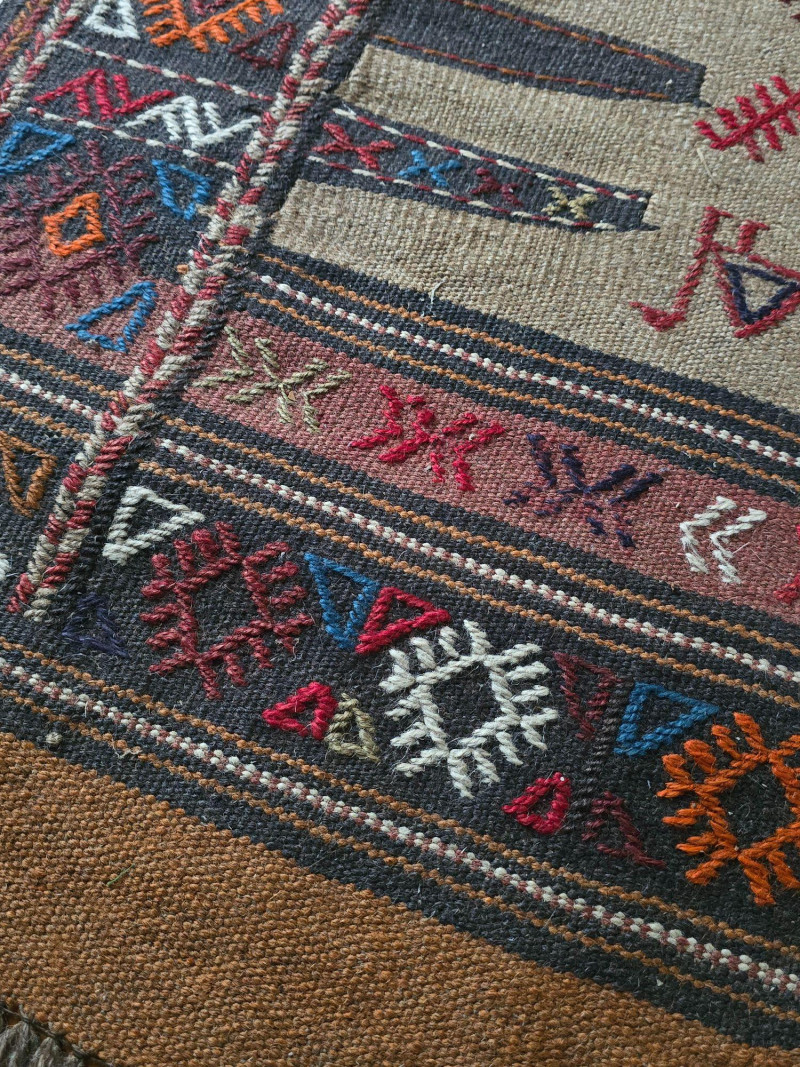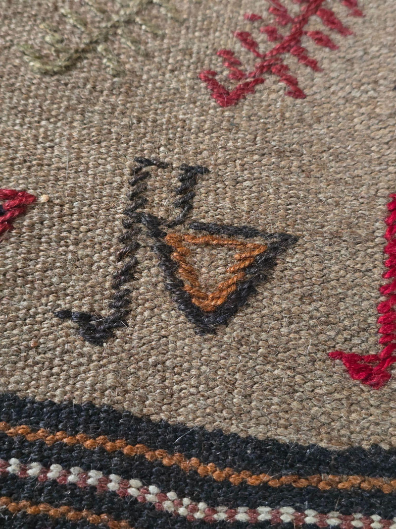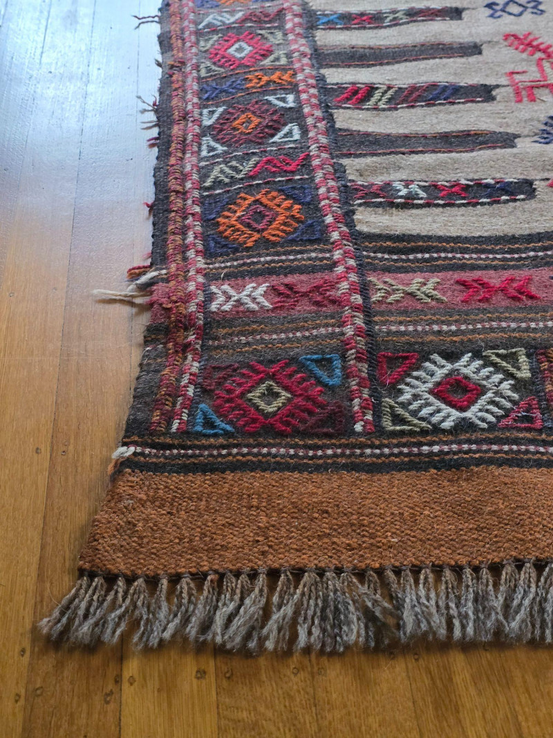 A beautifully handwoven vintage rug featuring classic tribal and geometric motifs in a warm, earthy palette. The design showcases a central medallion structure framed by intricate borders, with stylized symbols and colorwork characteristic of mid‑20th‑century weaving traditions. The wool pile displays natural tonal variation and crisp pattern definition, offering both visual depth and authentic handmade character. The reverse shows a traditional flatwoven foundation, and the included rug pad provides added stability and comfort. A versatile piece suited for collectors, textile enthusiasts, and décor settings seeking vintage warmth and global influence. Condition consistent with age and use. Rug pad included.
