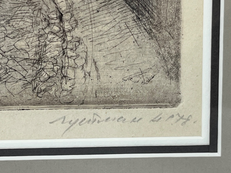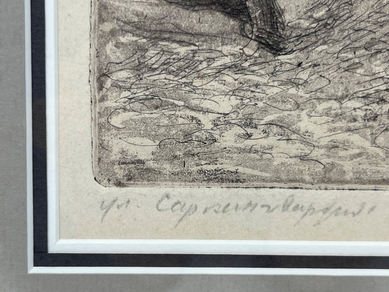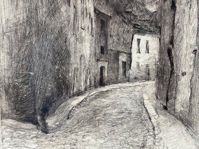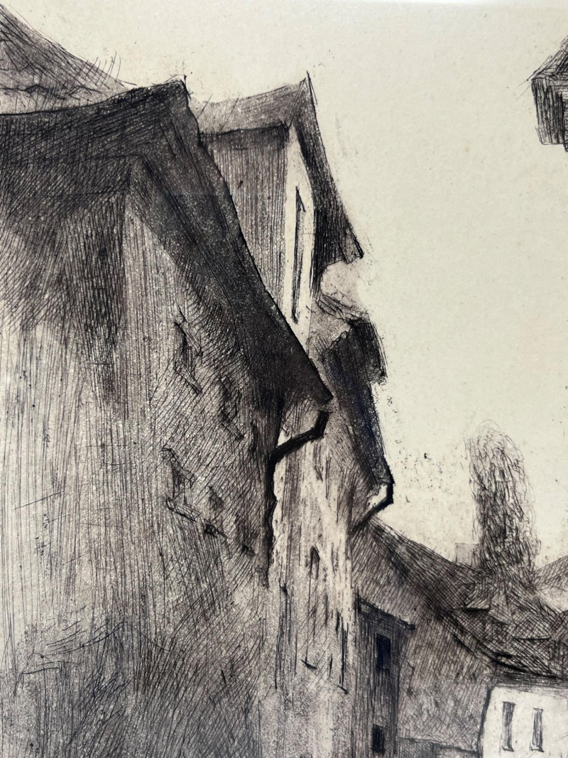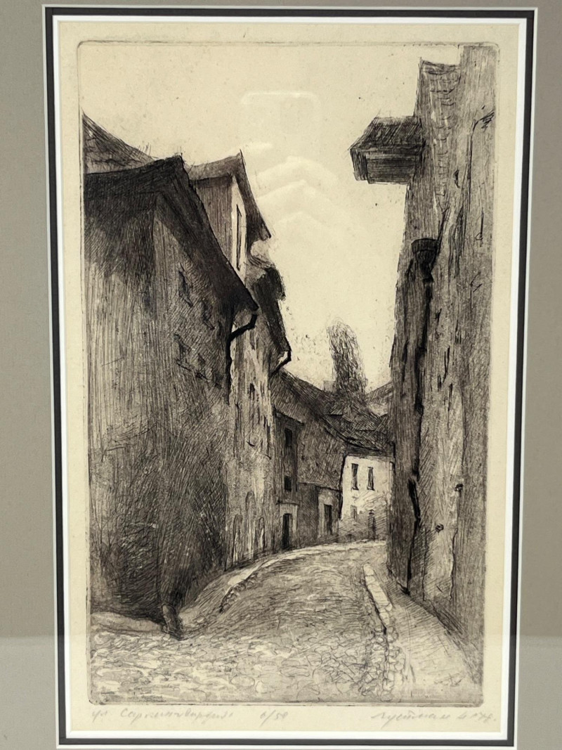Pencil drawing print depicting the medieval architecture of Riga’s historic Old Town. Detailed linework captures the narrow streets, gabled rooftops, and characteristic stone structures of the Latvian capital’s oldest district. The piece is signed and titled by the artist, though the handwriting is not legible. Marked 6/50, indicating a limited edition print. Light age‑appropriate toning present. Frame shows minor surface wear consistent with display. A classic architectural study with strong regional interest and collectible appeal.