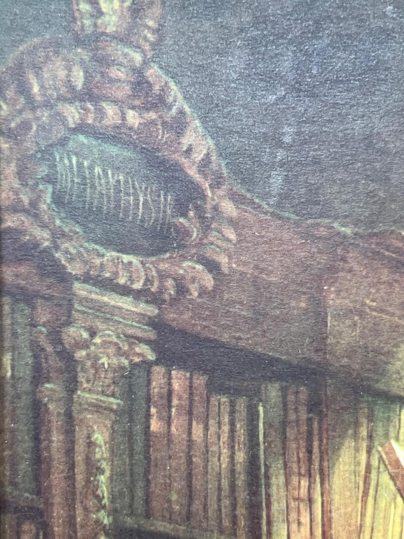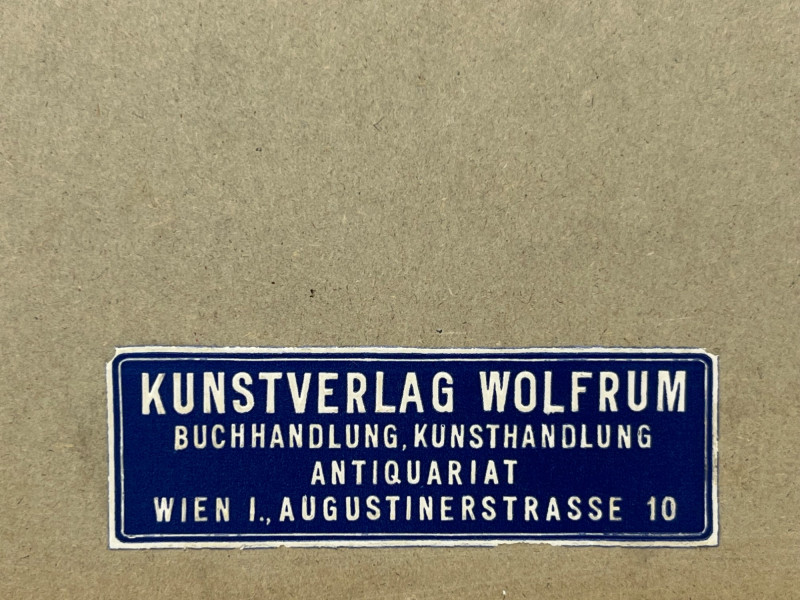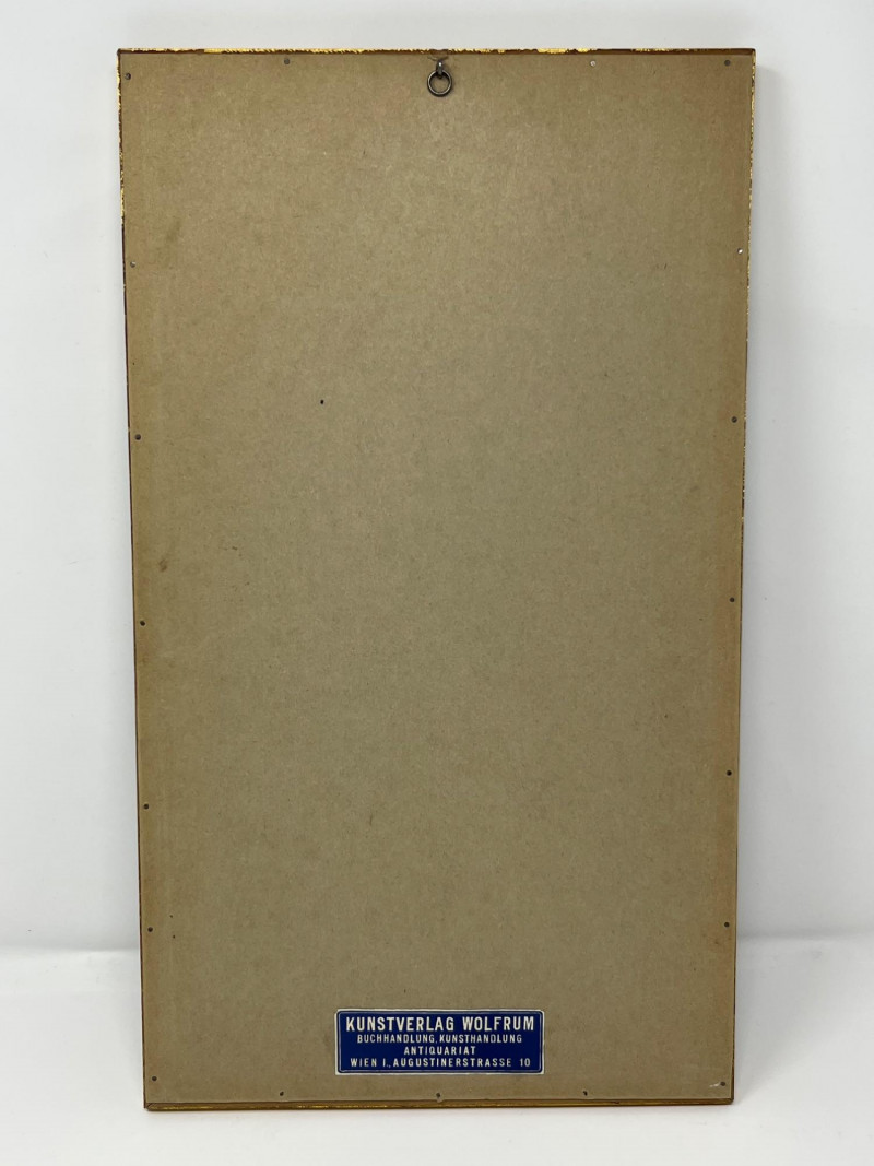 A richly detailed vintage print depicting an elderly scholar perched on a ladder in a grand classical library, fully absorbed in his reading. The scene is rendered with warm tonal depth and architectural precision, highlighting ornate columns, carved moldings, and floor‑to‑ceiling shelves filled with books. The composition captures the quiet drama of intellectual pursuit and the timeless atmosphere of historic European libraries. This piece is presented in a traditional frame with a paper backing and retains its original label from Kunstverlag Wolfrum, a noted Viennese book and art dealer located on Augustinerstrasse 10. The label supports its European origin and adds appealing provenance for collectors of literary‑themed artwork and vintage prints. Condition is consistent with age, with expected surface and frame wear visible upon close inspection. The artwork remains well‑preserved and displays beautifully. A strong decorative piece for study, office, library, or vintage‑inspired interiors, and an excellent addition for collectors of book‑themed art or European print houses.