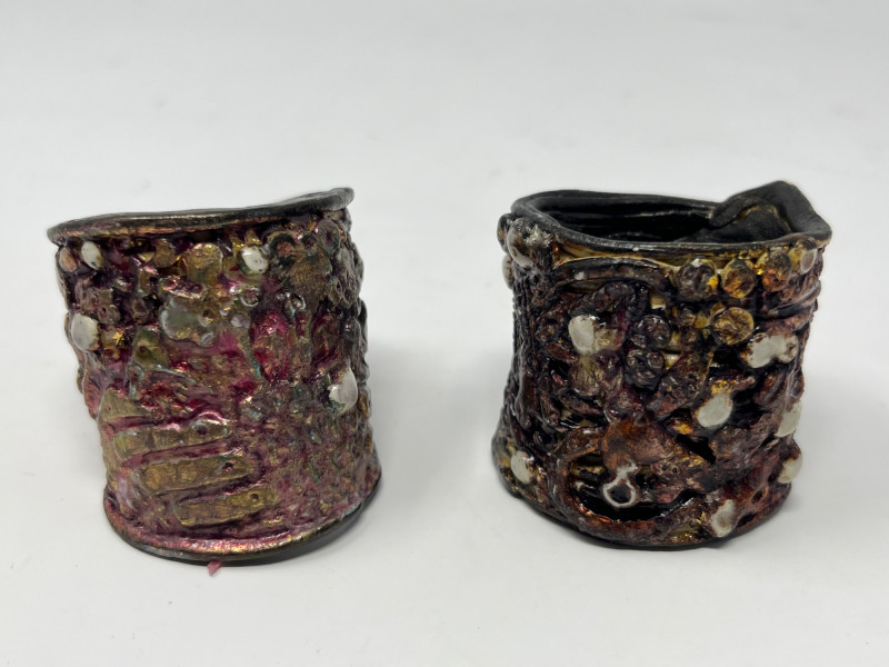 Offered here is a grouping of handcrafted ceramic napkin rings by Washington studio potter Gerald Gedekes, each piece signed with the Gedekes name on the interior. The set features varied glazes, textures, and hand‑formed details consistent with his broader body of work. One napkin ring has a small chip on the end, photographed clearly for bidder review. All other pieces show expected light wear from handling and display. Artist Information