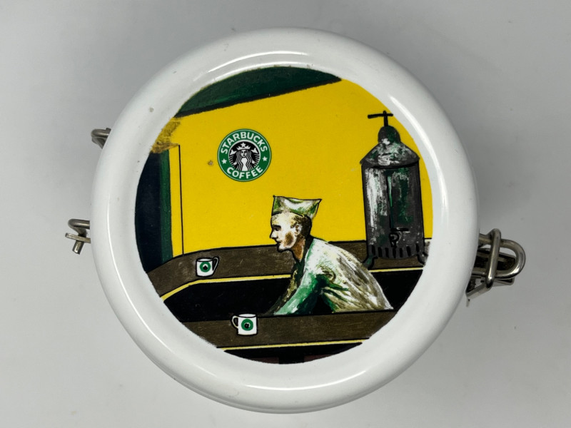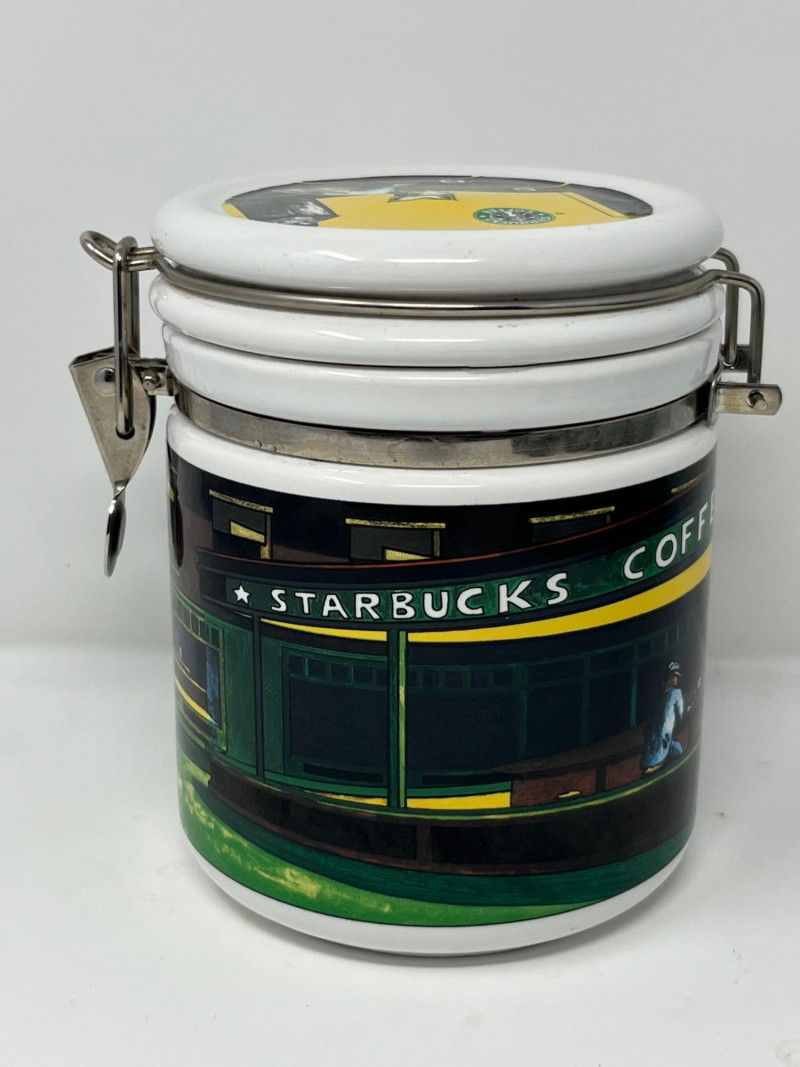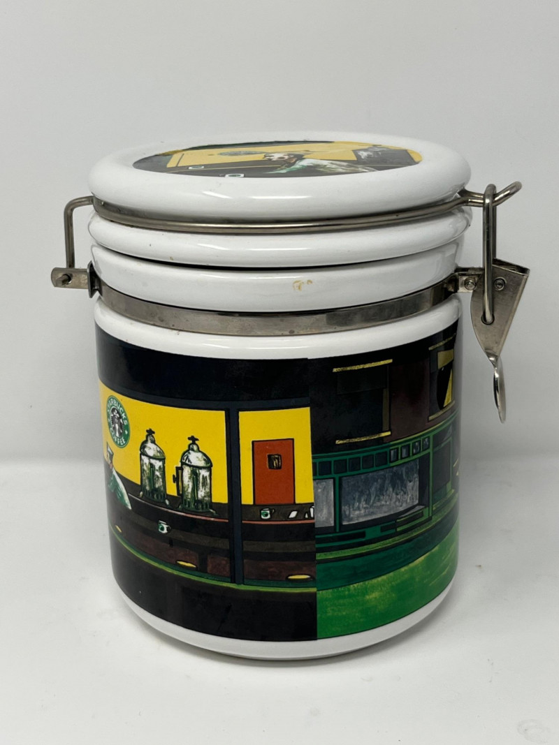 Charming 1990s Starbucks ceramic set featuring artwork inspired by Edward Hopper’s Nighthawks, produced exclusively for Starbucks by Chaleur. Includes one locking-lid canister, two mugs, and two miniature shot cups, each with matching café‑scene graphics. A great collectible set for Starbucks fans and lovers of retro café art. Includes: