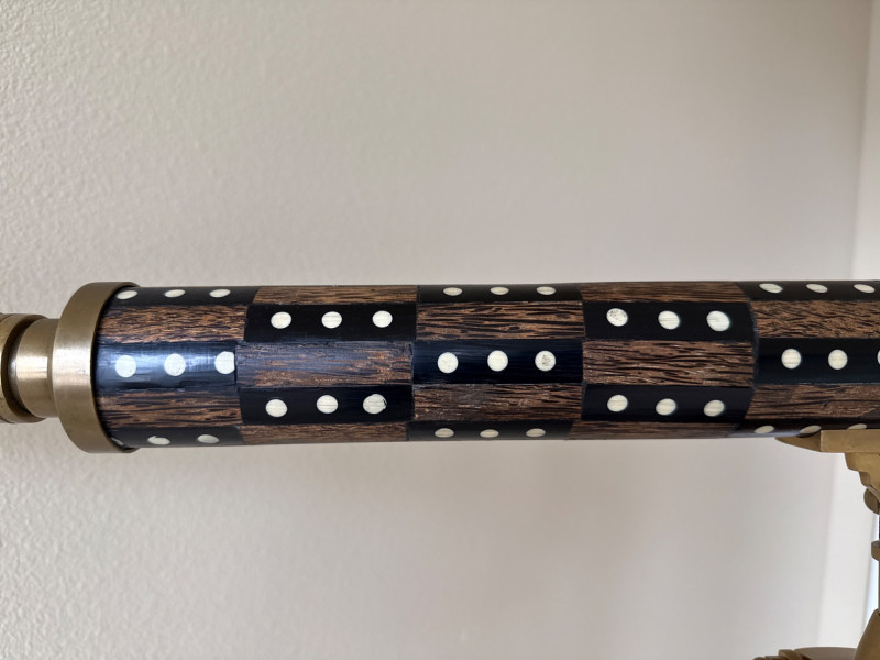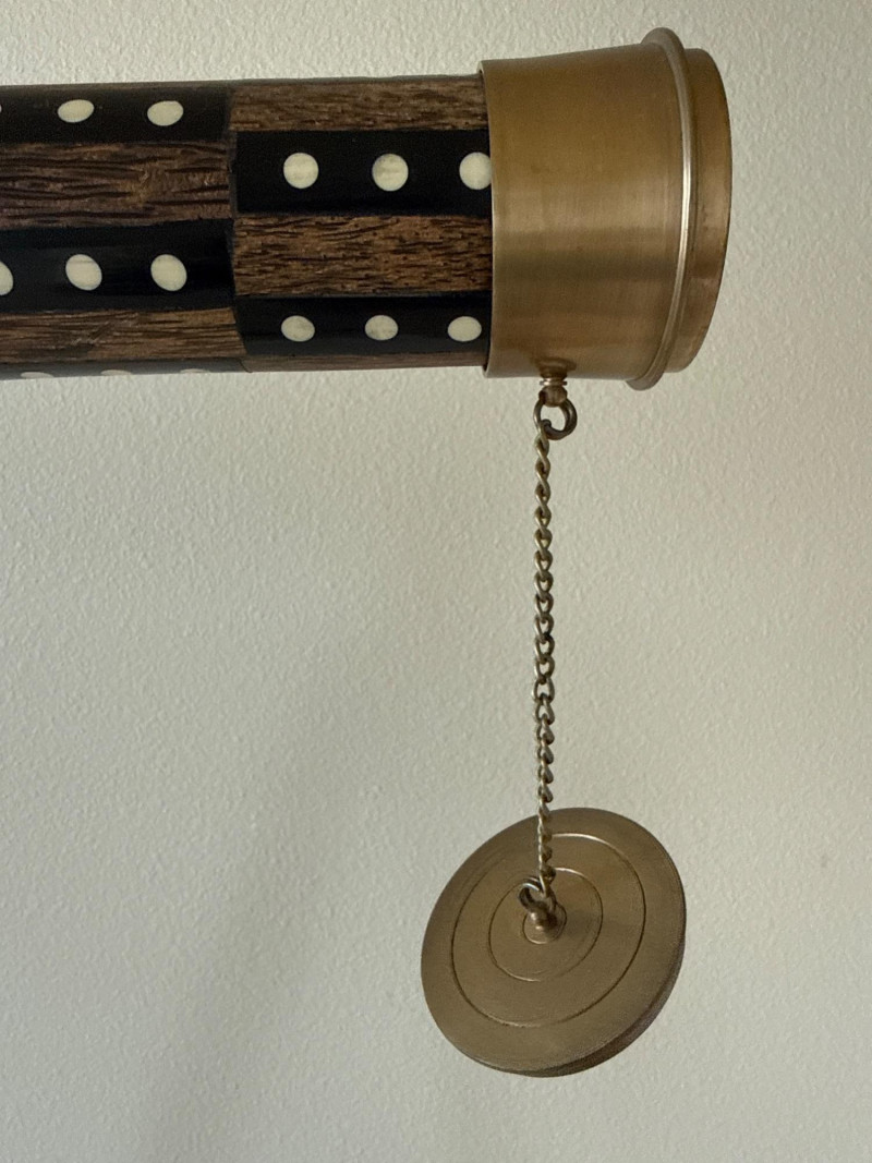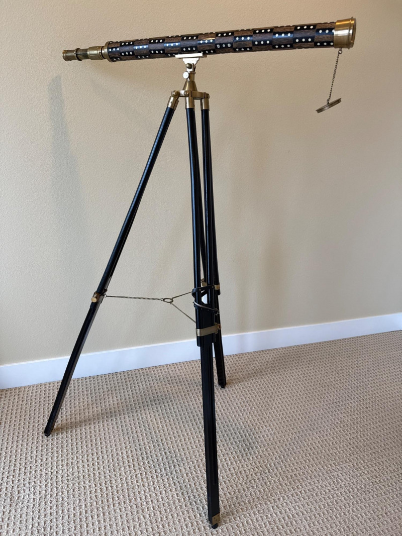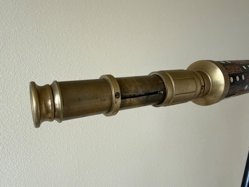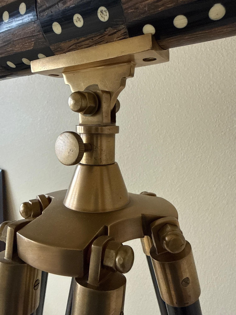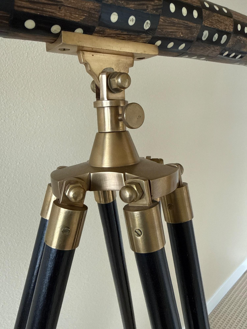 Vintage-style nautical brass and wood telescope mounted on a tripod stand, designed in the classic “Admiral” maritime spyglass style. Features a beautifully detailed barrel with inlaid patterned accents, brass fittings, and an adjustable tripod with chain support. The telescope includes a lens cap on chain and a pivoting mount for positioning. Constructed from brass and wood with a solid, substantial feel. The tripod legs are reinforced with metal hardware and spreader chain for stability.
