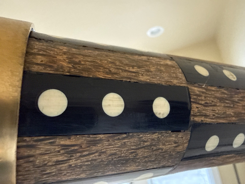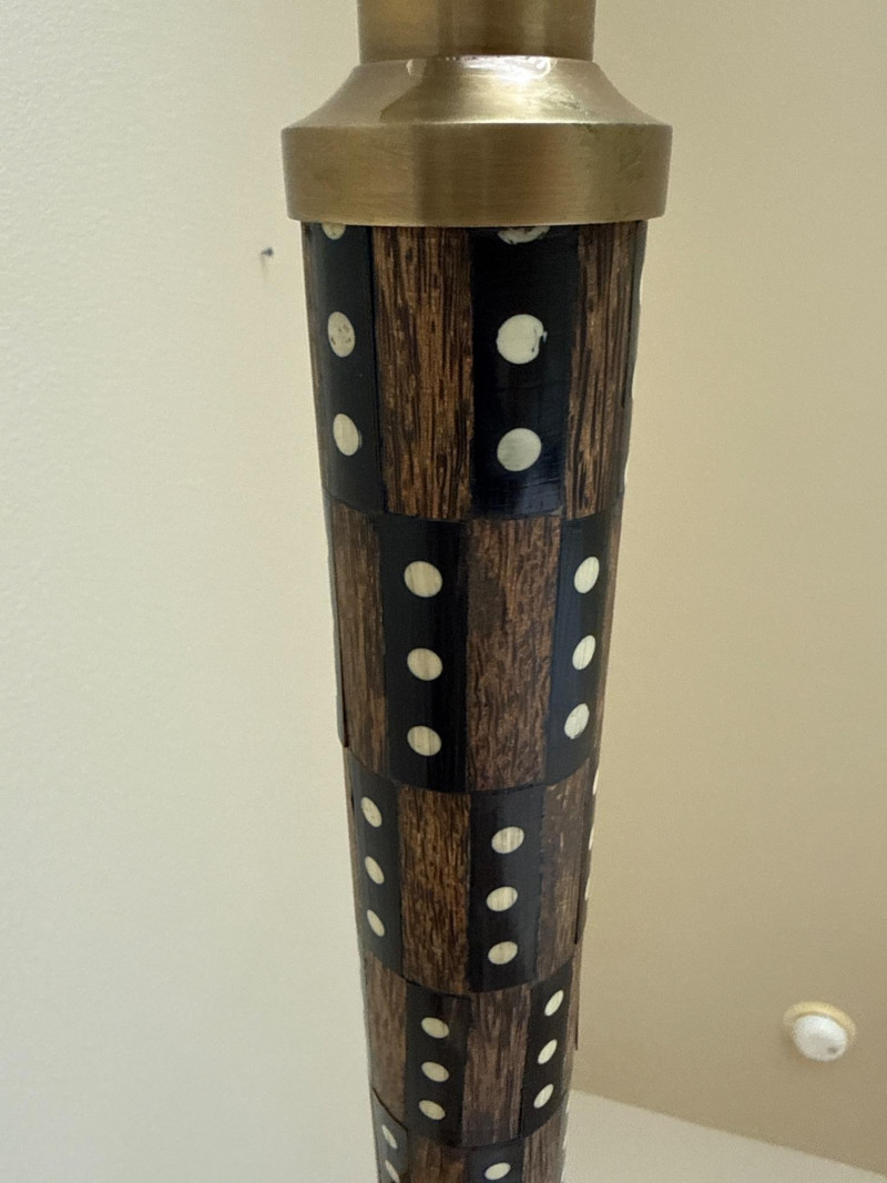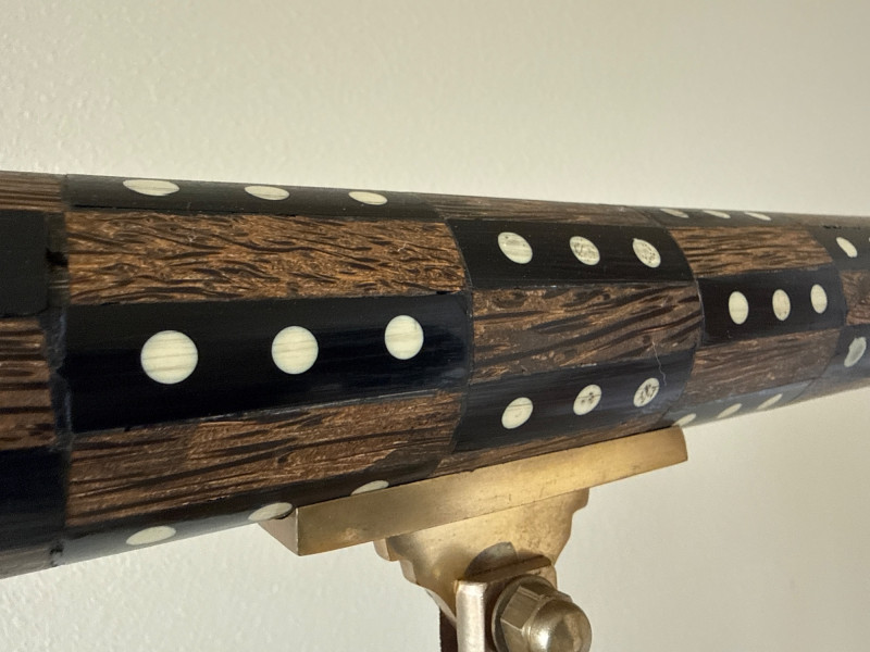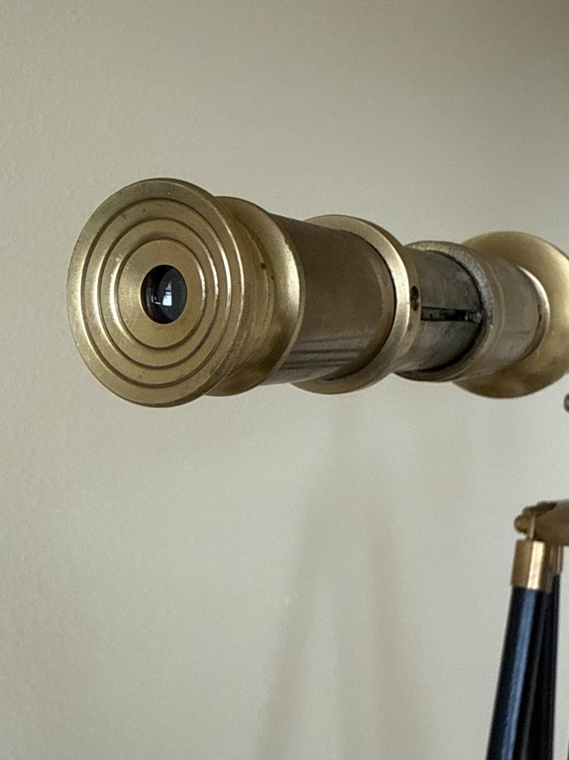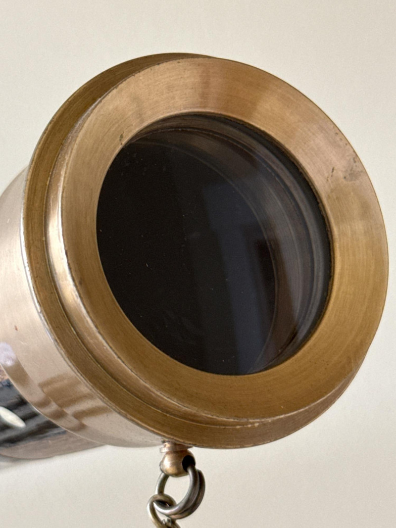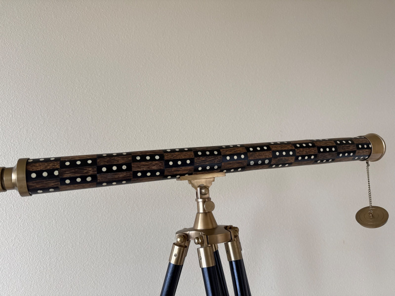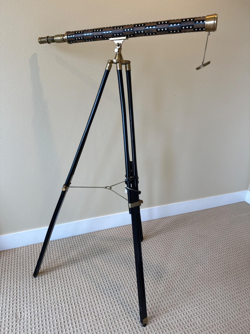Vintage-style nautical brass and wood telescope mounted on a tripod stand, designed in the classic “Admiral” maritime spyglass style. Features a beautifully detailed barrel with inlaid patterned accents, brass fittings, and an adjustable tripod with chain support. The telescope includes a lens cap on chain and a pivoting mount for positioning. Constructed from brass and wood with a solid, substantial feel. The tripod legs are reinforced with metal hardware and spreader chain for stability.