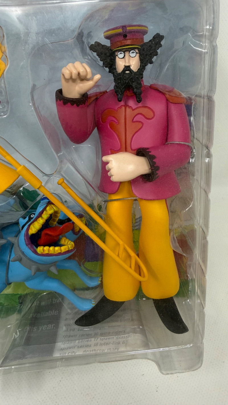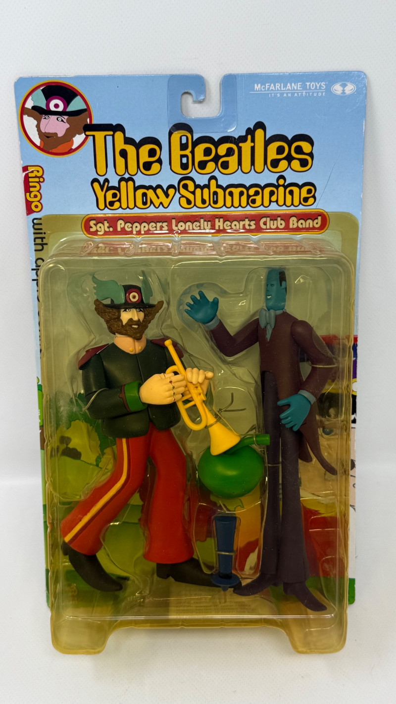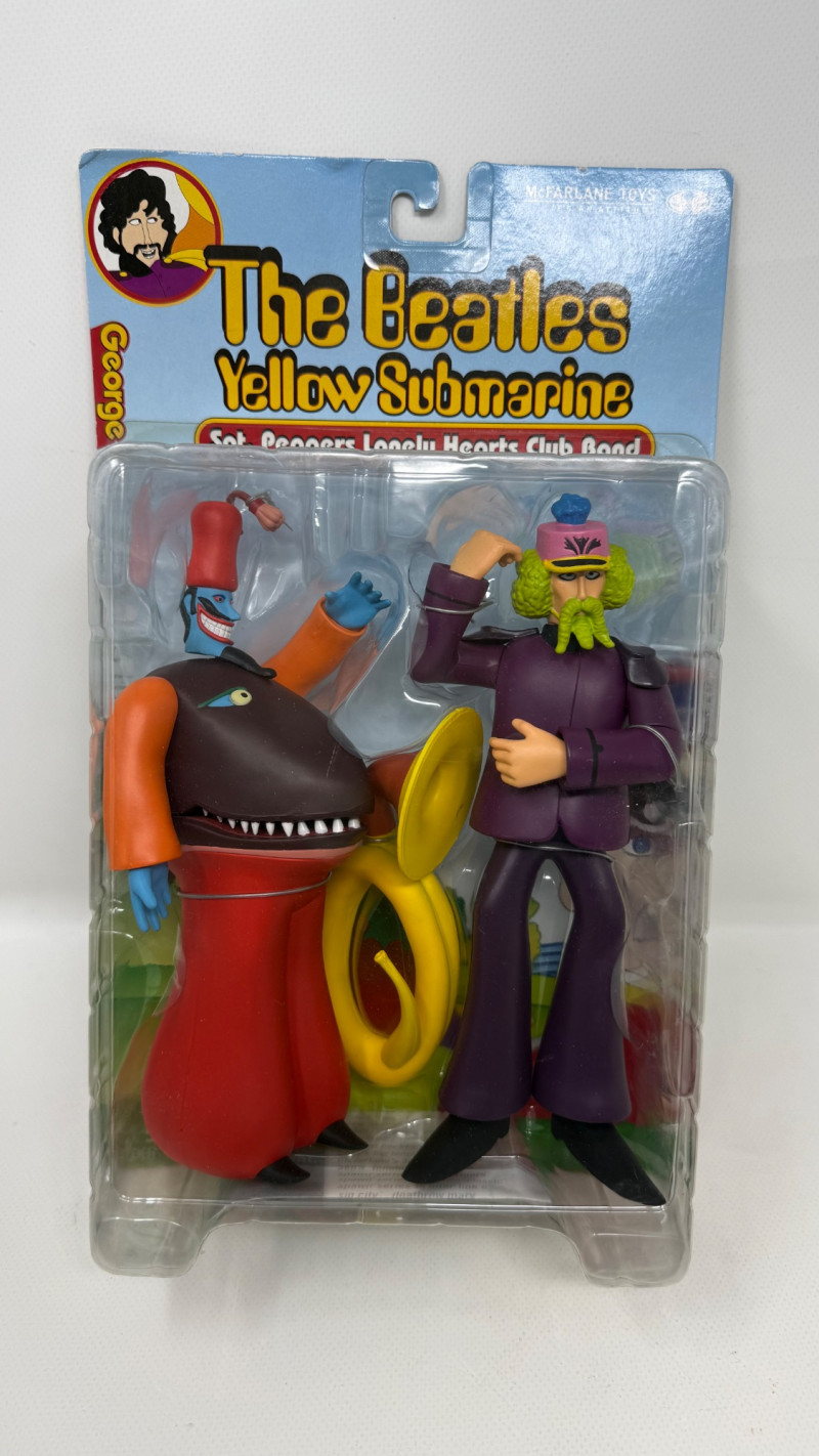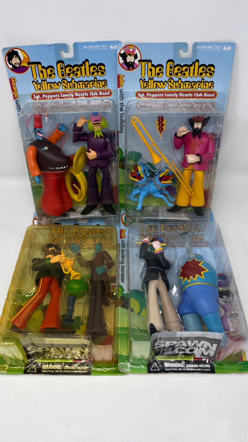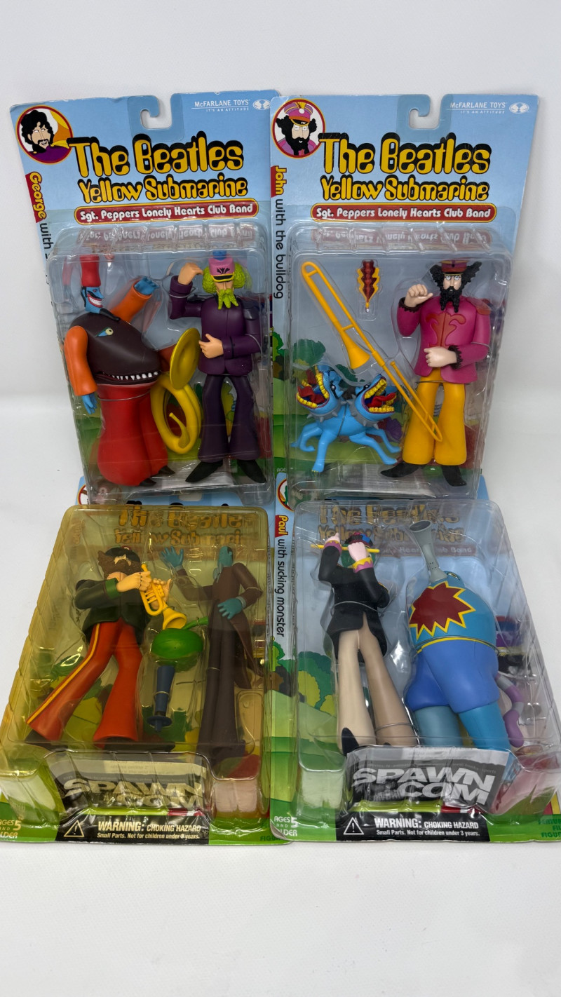 Complete set of 4 The Beatles Yellow Submarine Sgt. Pepper’s Lonely Hearts Club Band action figures by McFarlane Toys. Includes all band members—John, Paul, George, and Ringo—each paired with their unique character accessories from the iconic animated film. Features highly detailed sculpting, bold colors, and original illustrated packaging. A must-have full set for Beatles collectors and fans of music memorabilia.