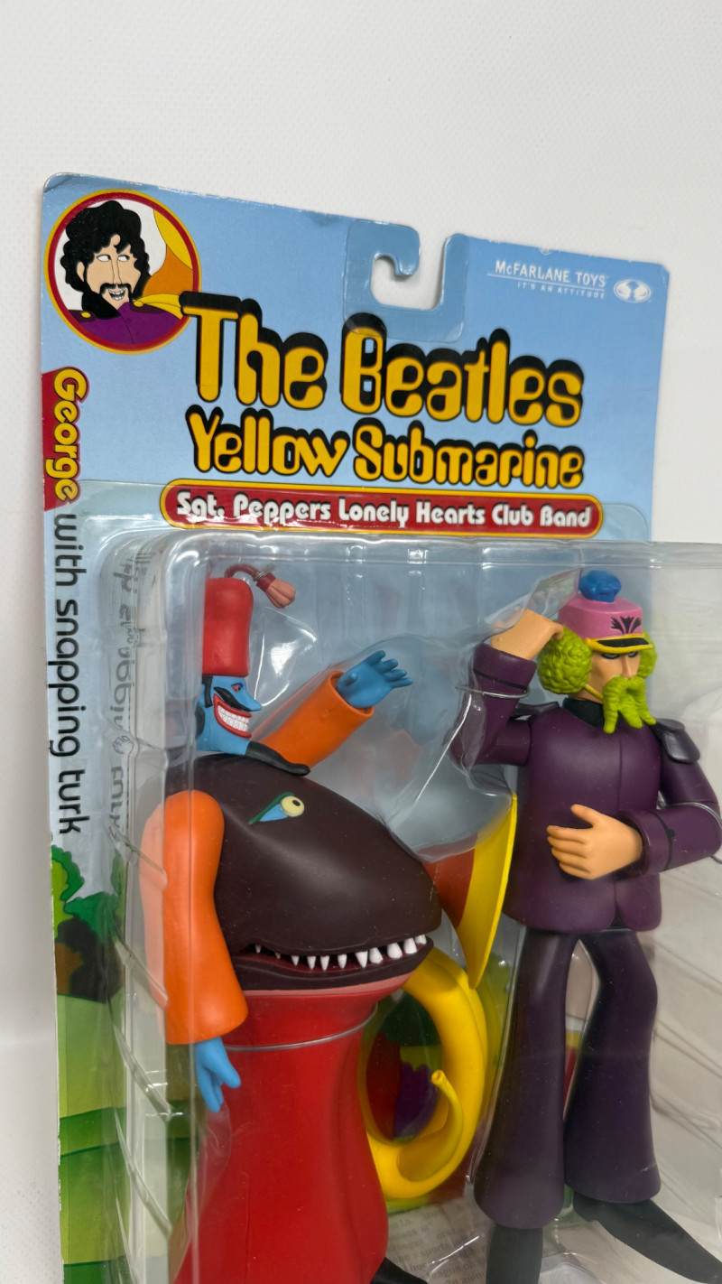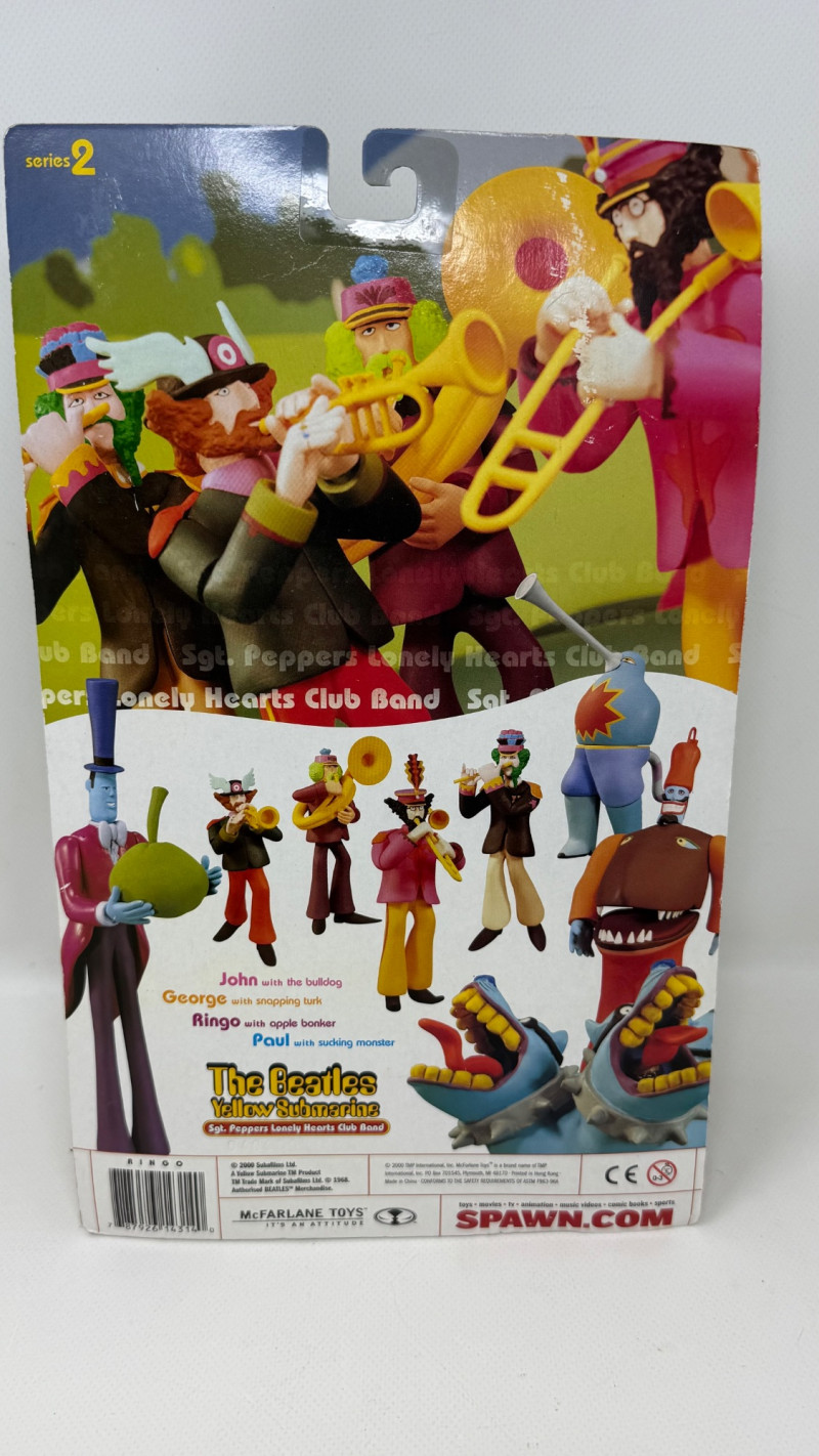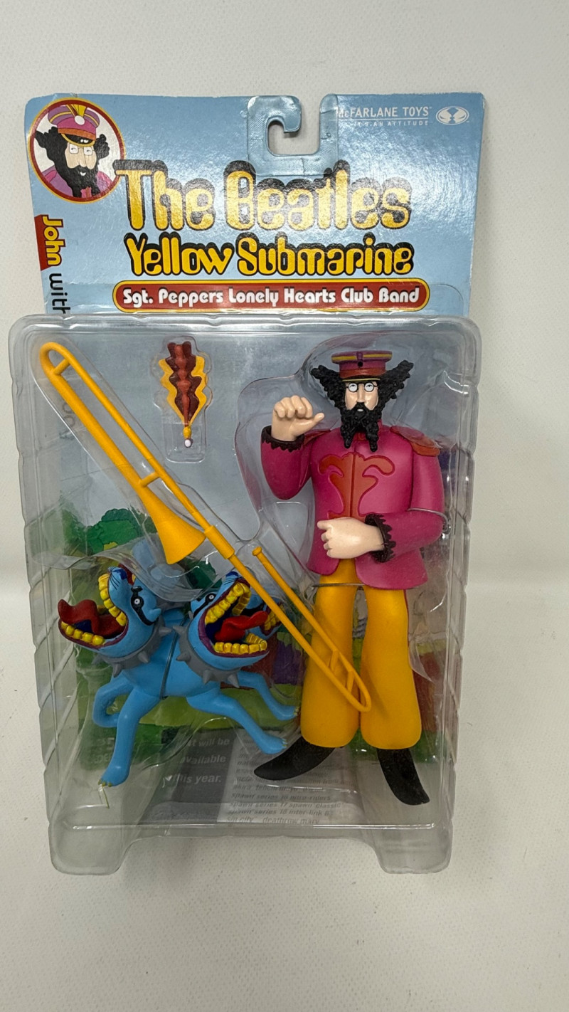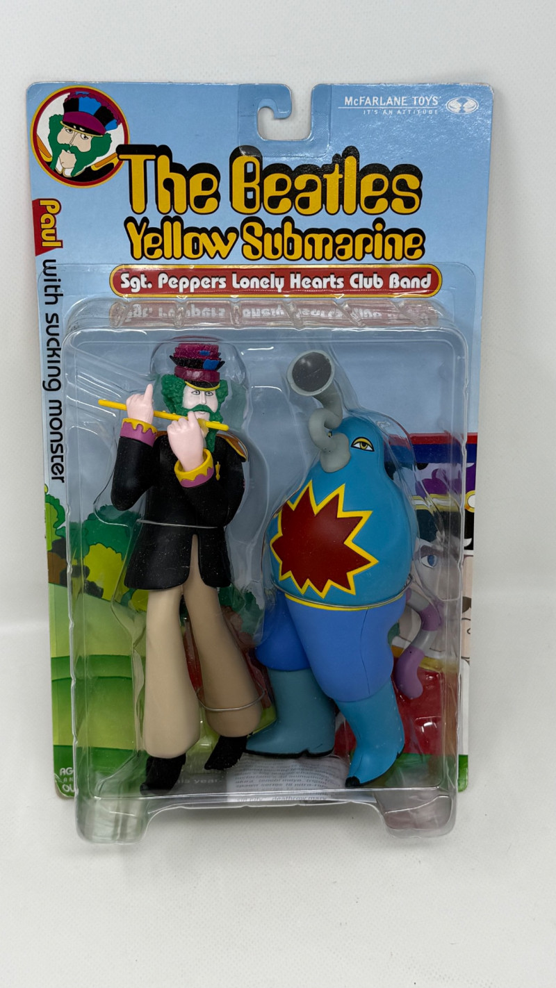 Complete set of 4 The Beatles Yellow Submarine Sgt. Pepper’s Lonely Hearts Club Band action figures by McFarlane Toys. Includes all band members—John, Paul, George, and Ringo—each paired with their unique character accessories from the iconic animated film. Features highly detailed sculpting, bold colors, and original illustrated packaging. A must-have full set for Beatles collectors and fans of music memorabilia.