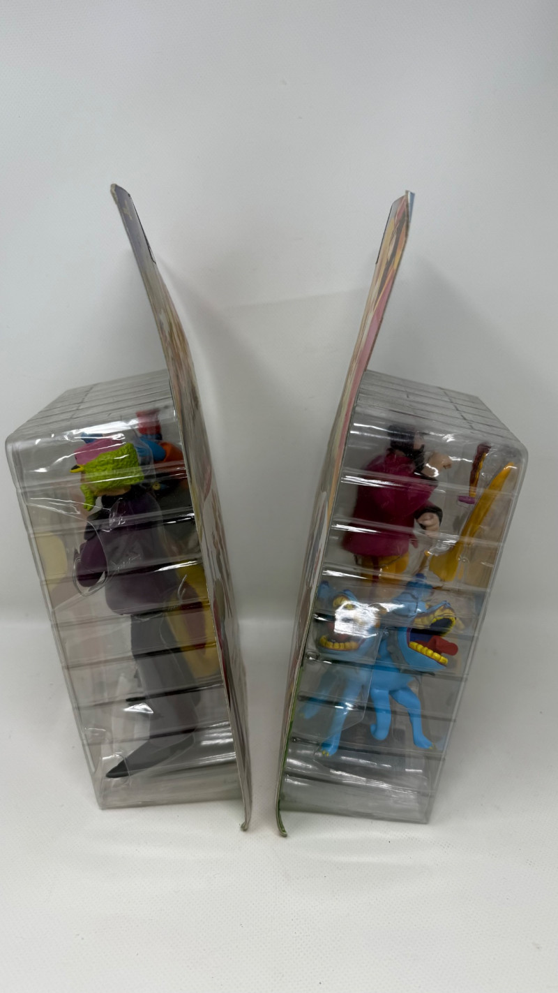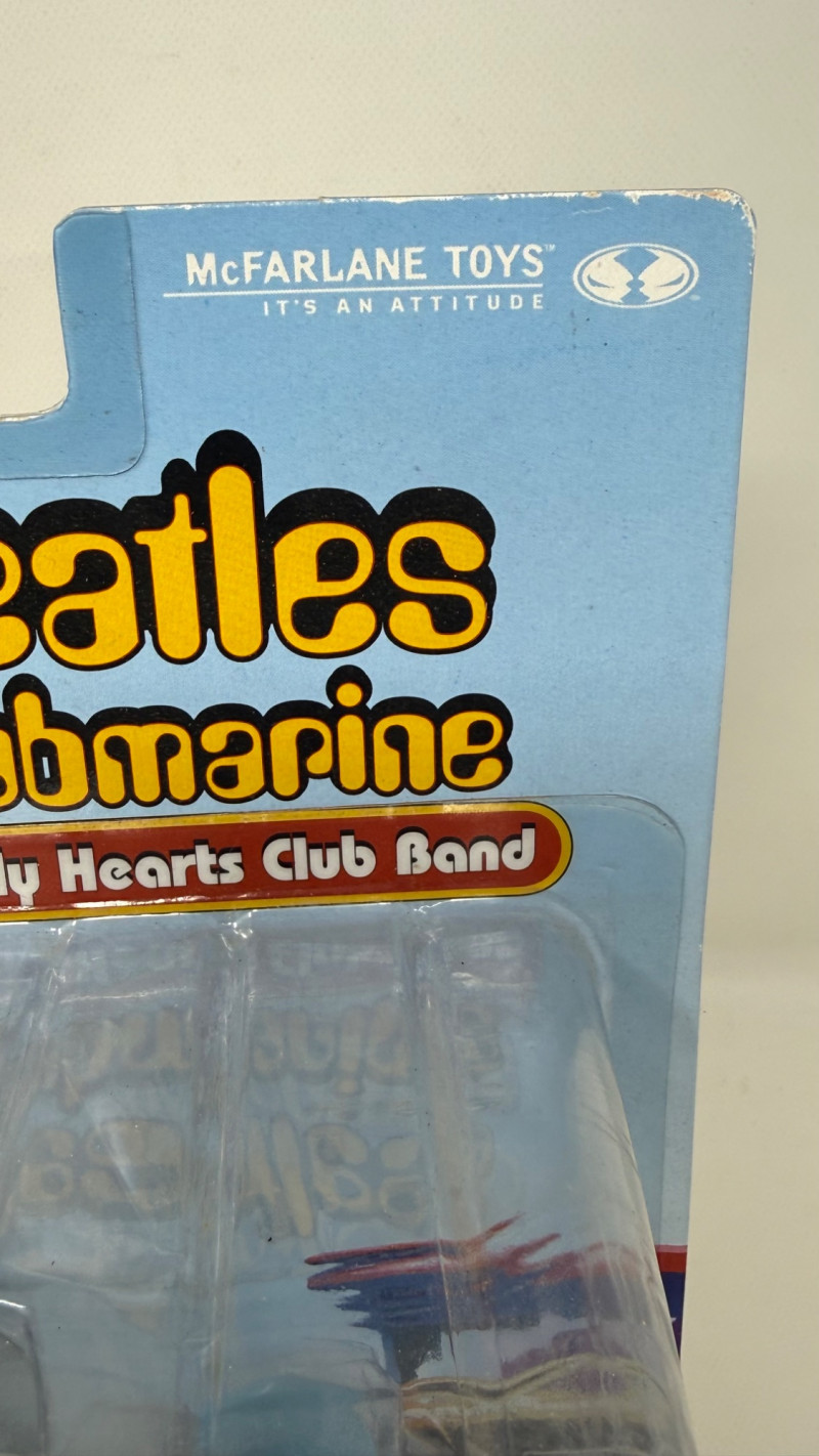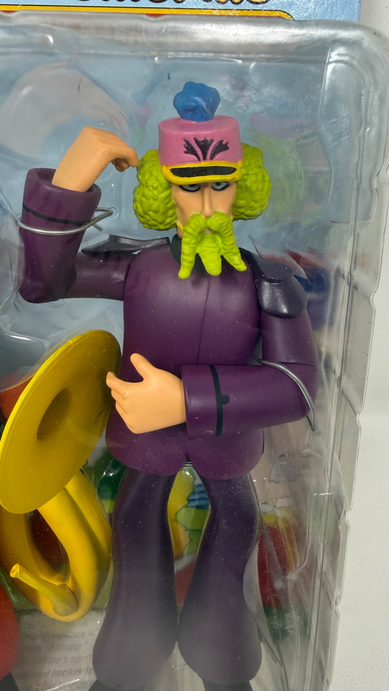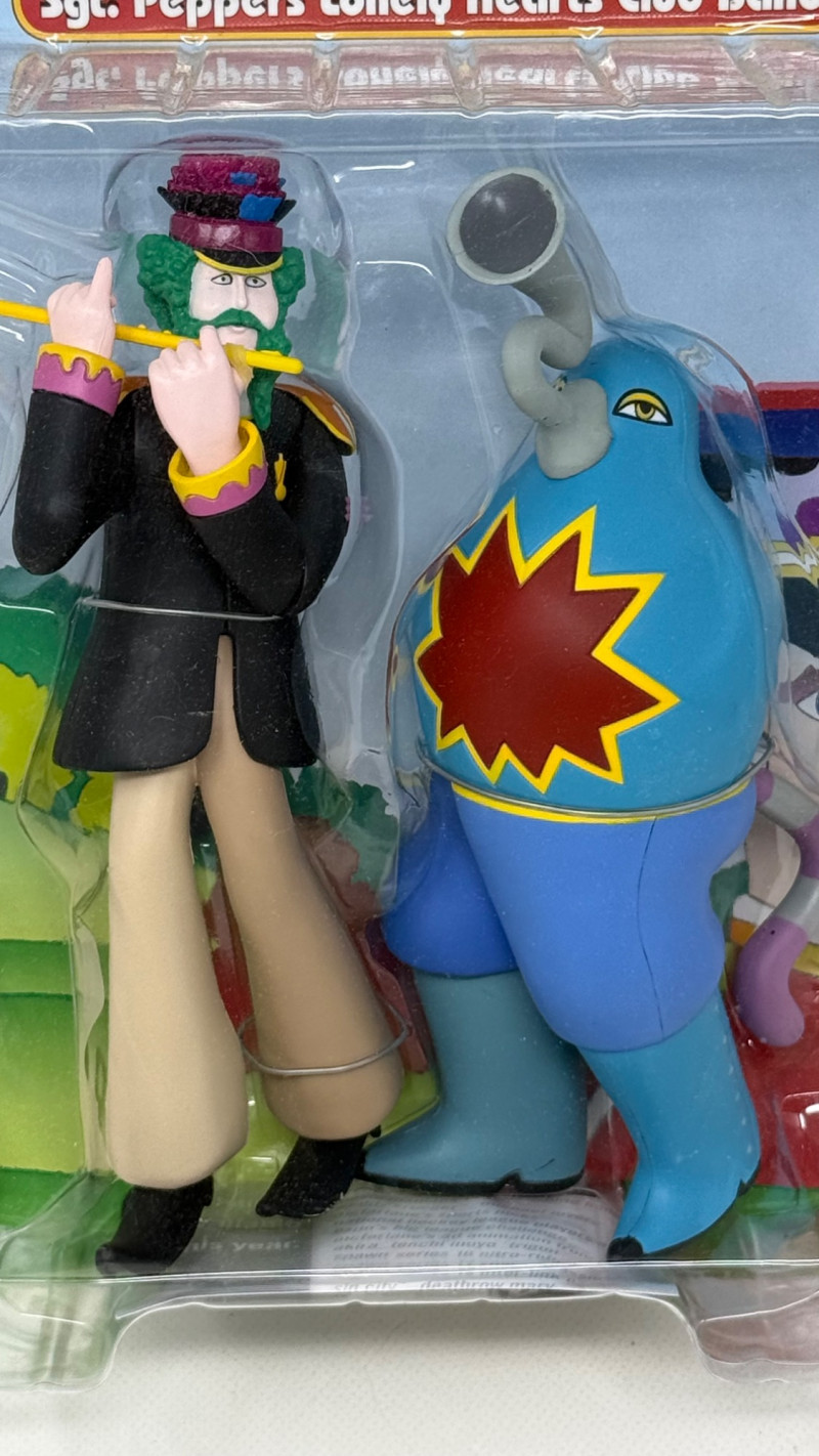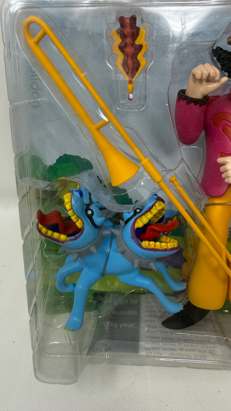 Complete set of 4 The Beatles Yellow Submarine Sgt. Pepper’s Lonely Hearts Club Band action figures by McFarlane Toys. Includes all band members—John, Paul, George, and Ringo—each paired with their unique character accessories from the iconic animated film. Features highly detailed sculpting, bold colors, and original illustrated packaging. A must-have full set for Beatles collectors and fans of music memorabilia.
