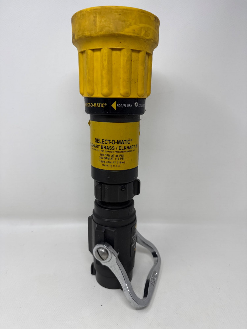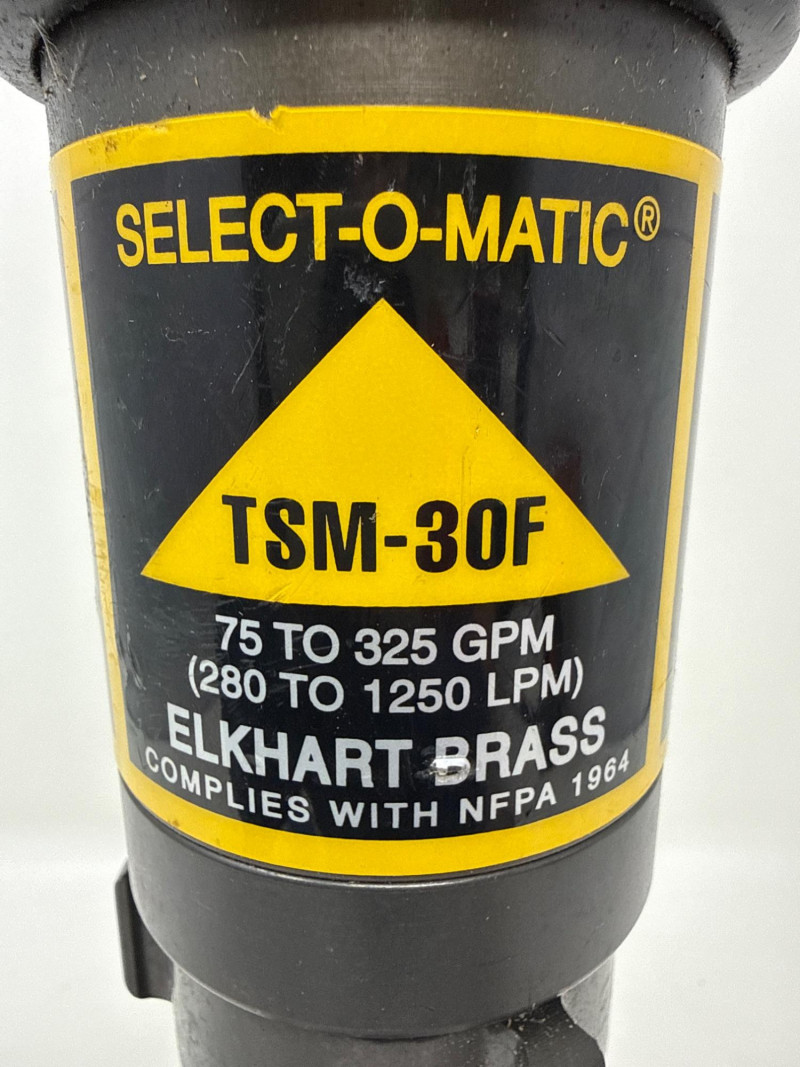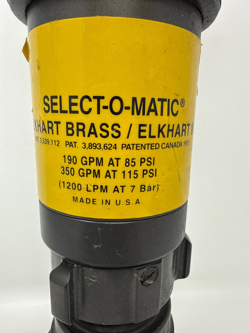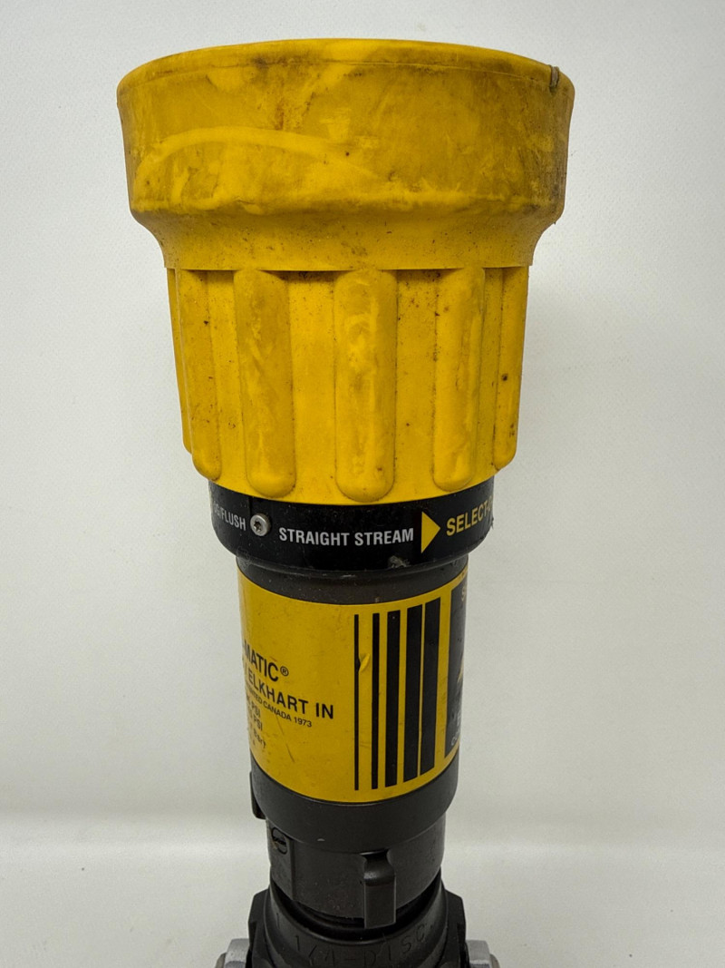 Elkhart Brass Select-O-Matic automatic fire hose nozzle with 1.5" NH connection. This professional-grade firefighting nozzle is designed to automatically adjust to fluctuating water flow, maintaining consistent pressure and stream quality. Features adjustable spray patterns from straight stream to fog/flush, along with a durable shutoff valve and metal bale handle. Marked TSM-30F model with flow range of approximately 75–325 GPM. Built with a corrosion-resistant body and heavy-duty construction, commonly used in firefighting applications or suitable for collectors of fire equipment. Includes attached shutoff with horseshoe-style handle and removable pistol grip.Key Features: