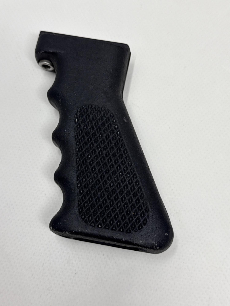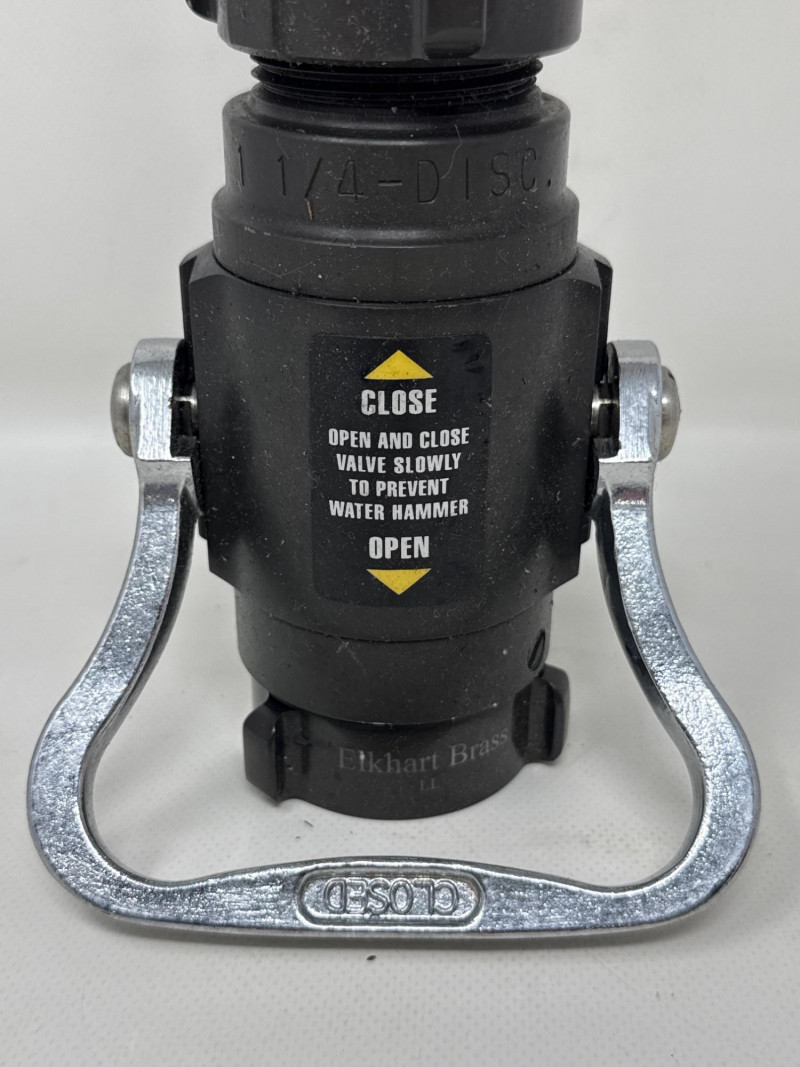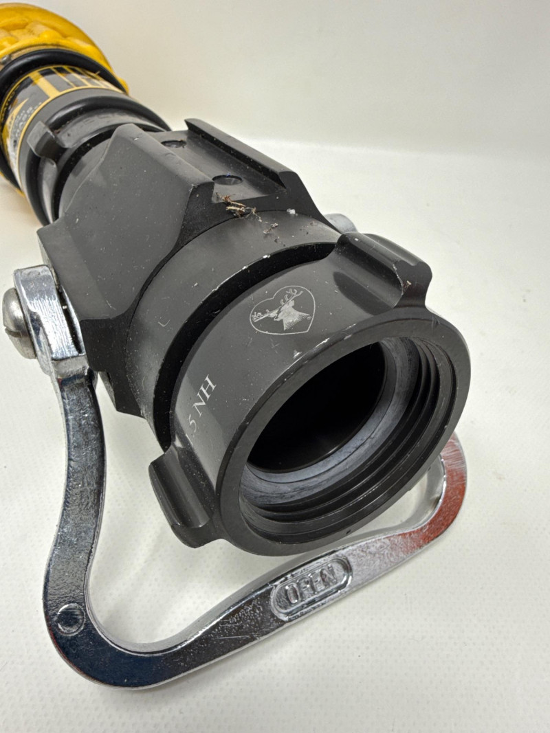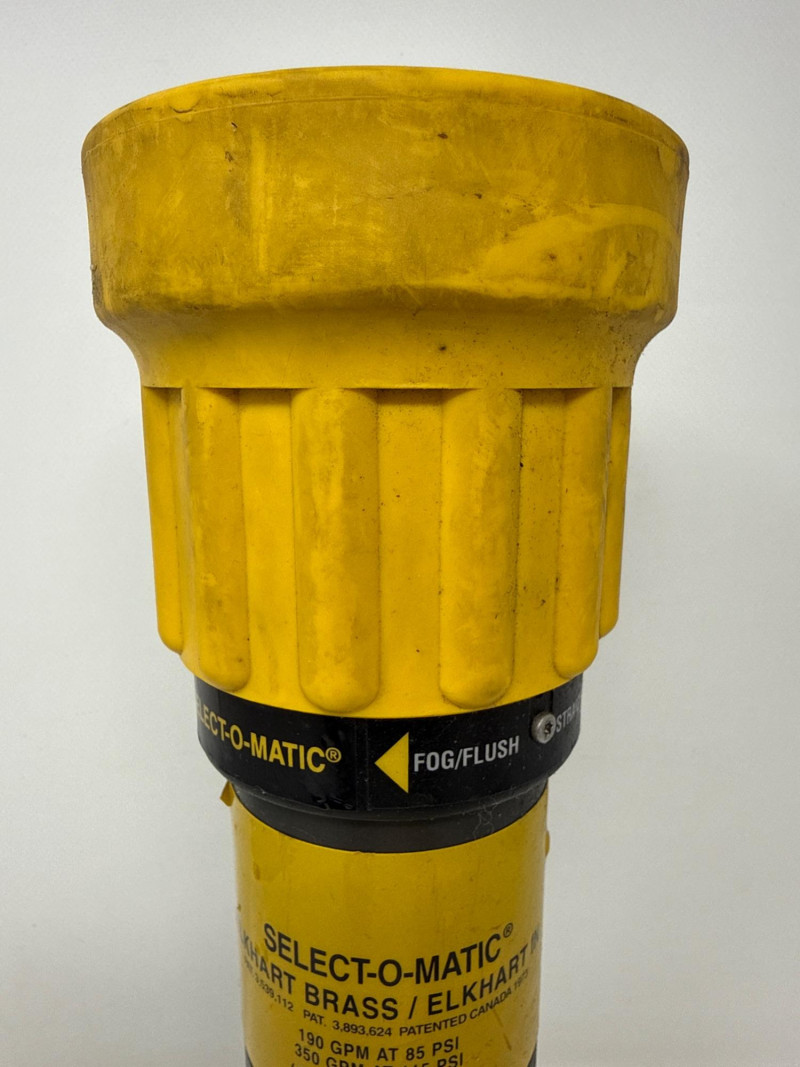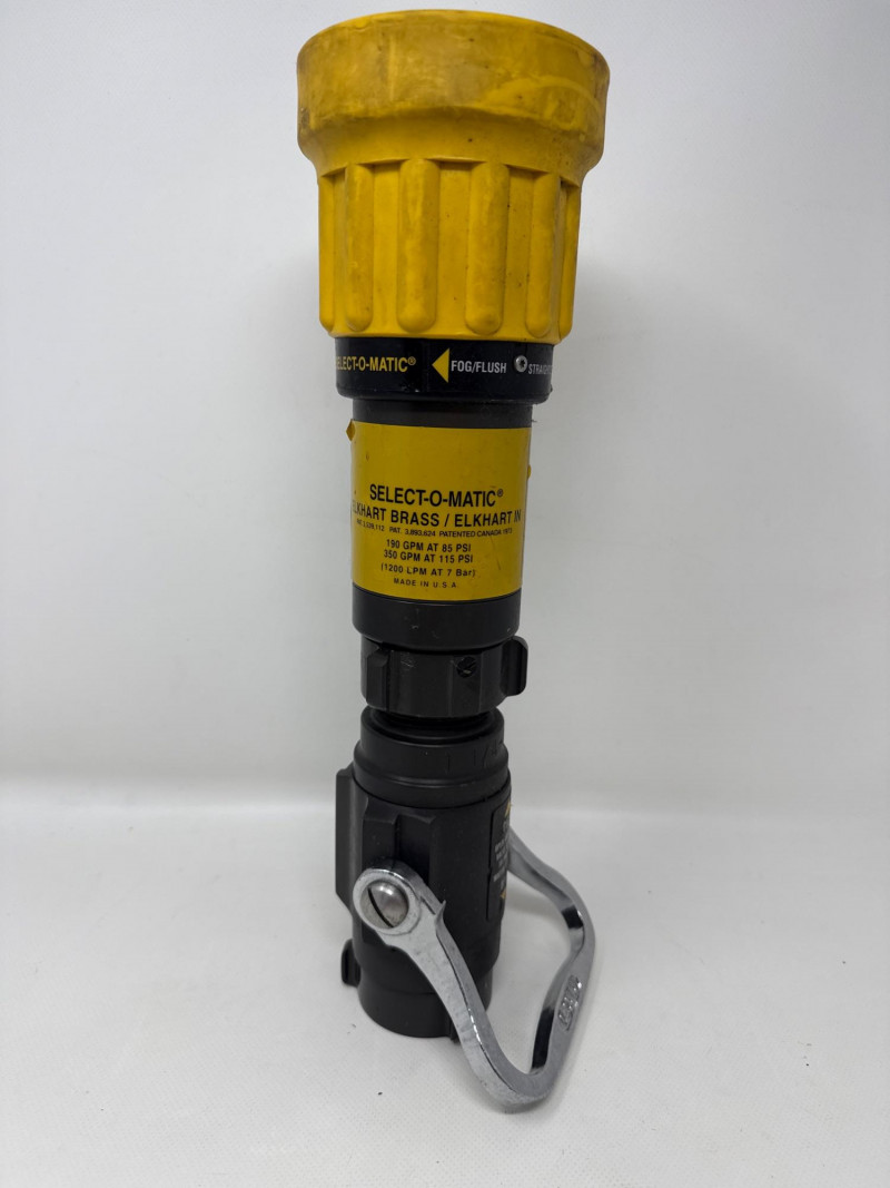 Elkhart Brass Select-O-Matic automatic fire hose nozzle with 1.5" NH connection. This professional-grade firefighting nozzle is designed to automatically adjust to fluctuating water flow, maintaining consistent pressure and stream quality. Features adjustable spray patterns from straight stream to fog/flush, along with a durable shutoff valve and metal bale handle. Marked TSM-30F model with flow range of approximately 75–325 GPM. Built with a corrosion-resistant body and heavy-duty construction, commonly used in firefighting applications or suitable for collectors of fire equipment. Includes attached shutoff with horseshoe-style handle and removable pistol grip.Key Features: