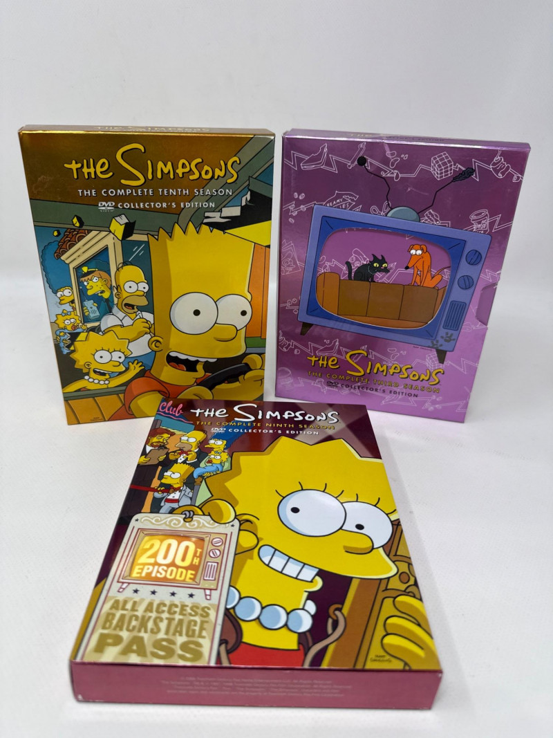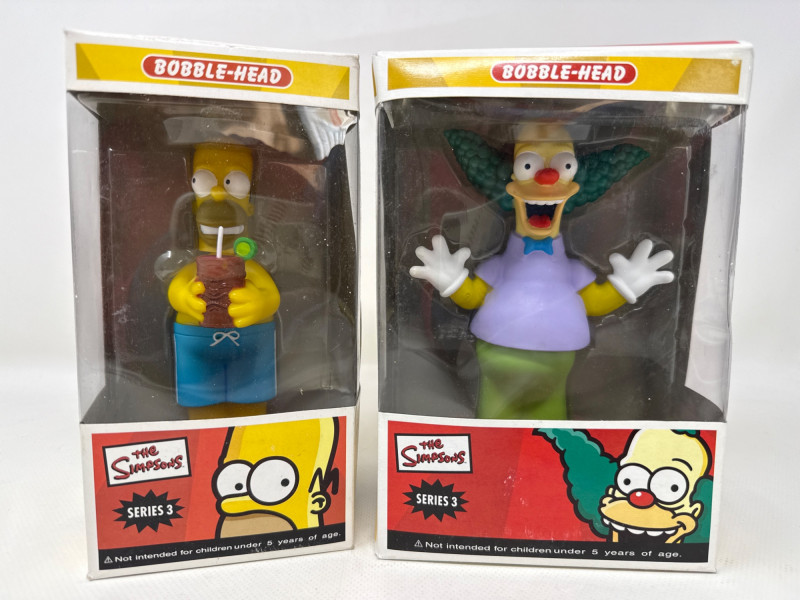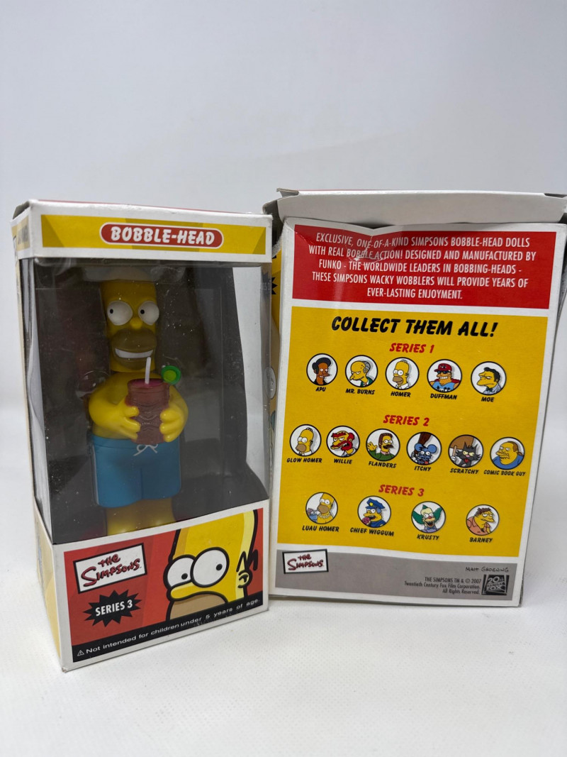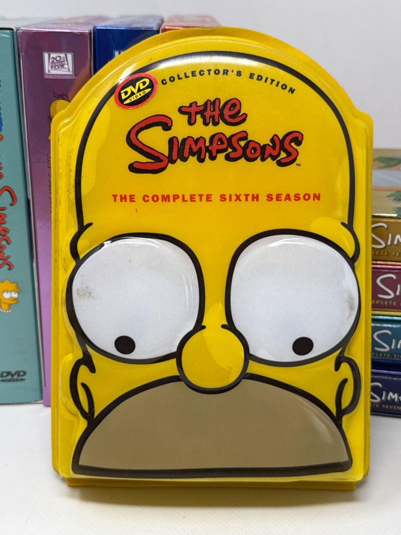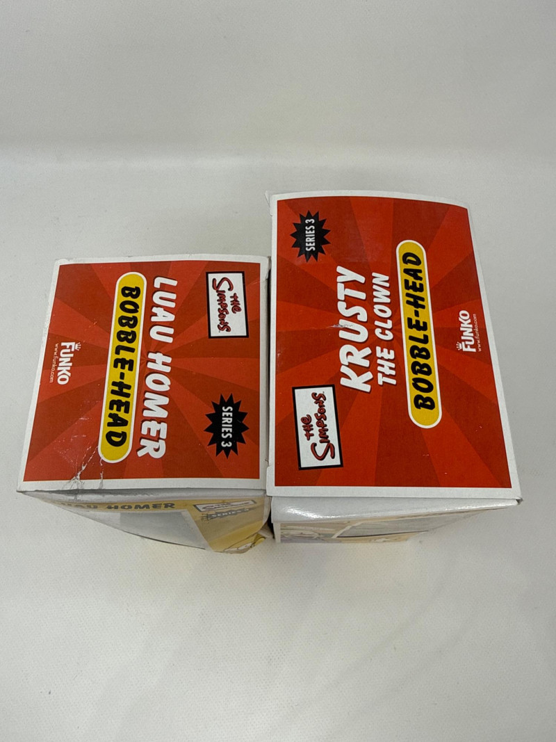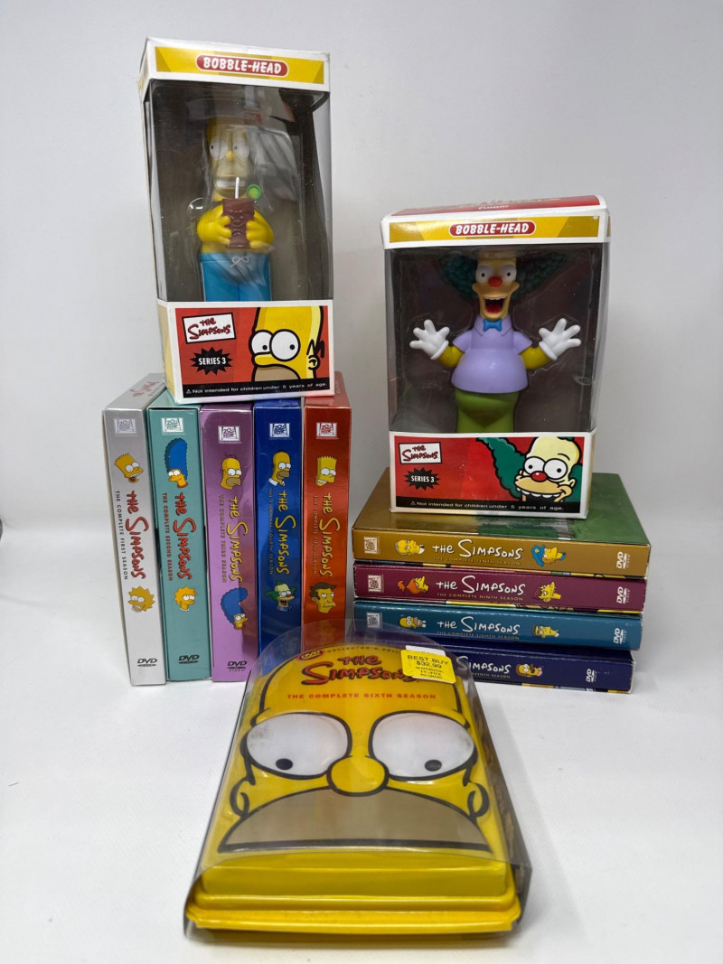 Complete collection of The Simpsons Seasons 1 through 10 on DVD, including the Collector’s Edition Season 6 set. This lot also includes two Funko Series 3 bobbleheads featuring Homer Simpson (Luau Homer) and Krusty the Clown, both new in box. A curated assortment of The Simpsons collectibles, including boxed figurines and multiple DVD season box sets. The items appear well‑kept and visually vibrant, appealing to fans and collectors of the long‑running animated series. Figurines (Top Row)