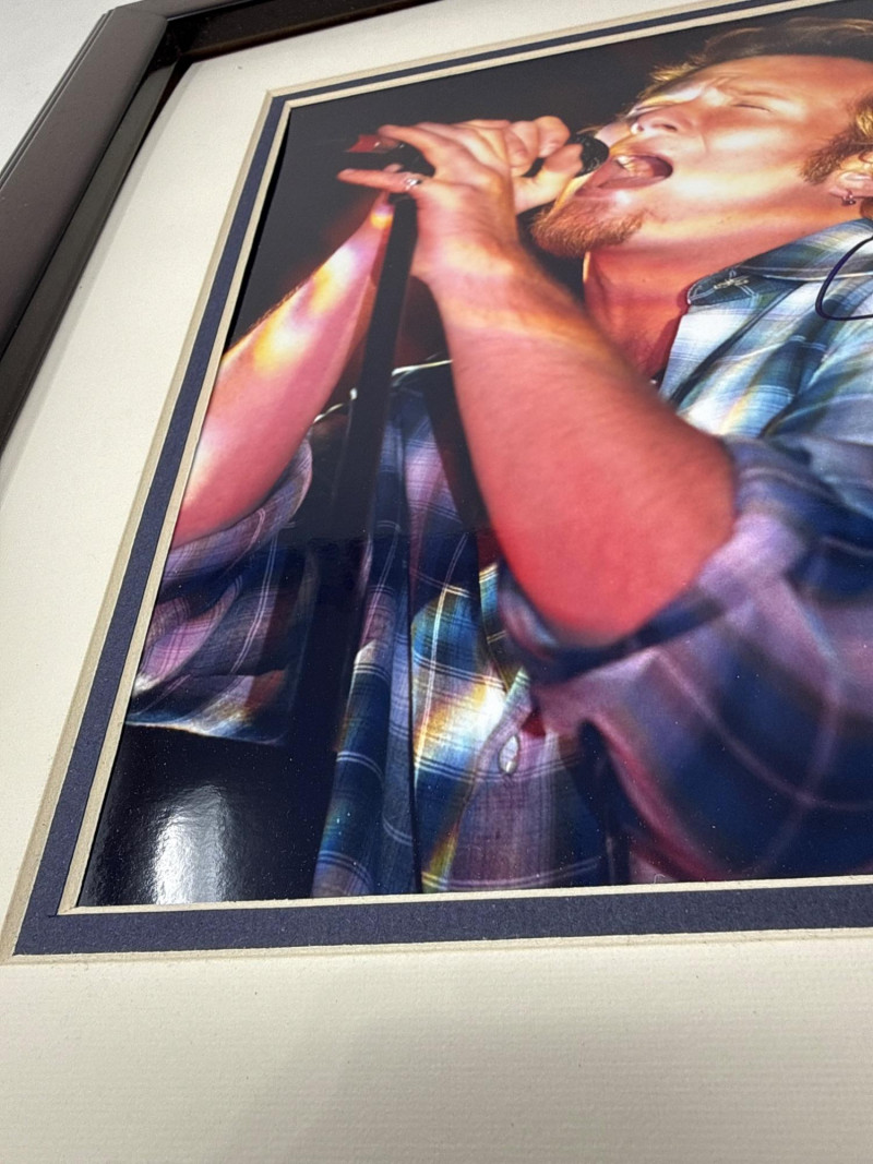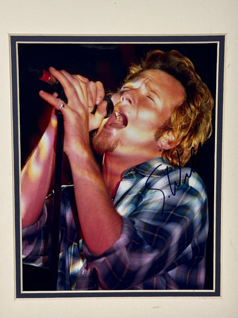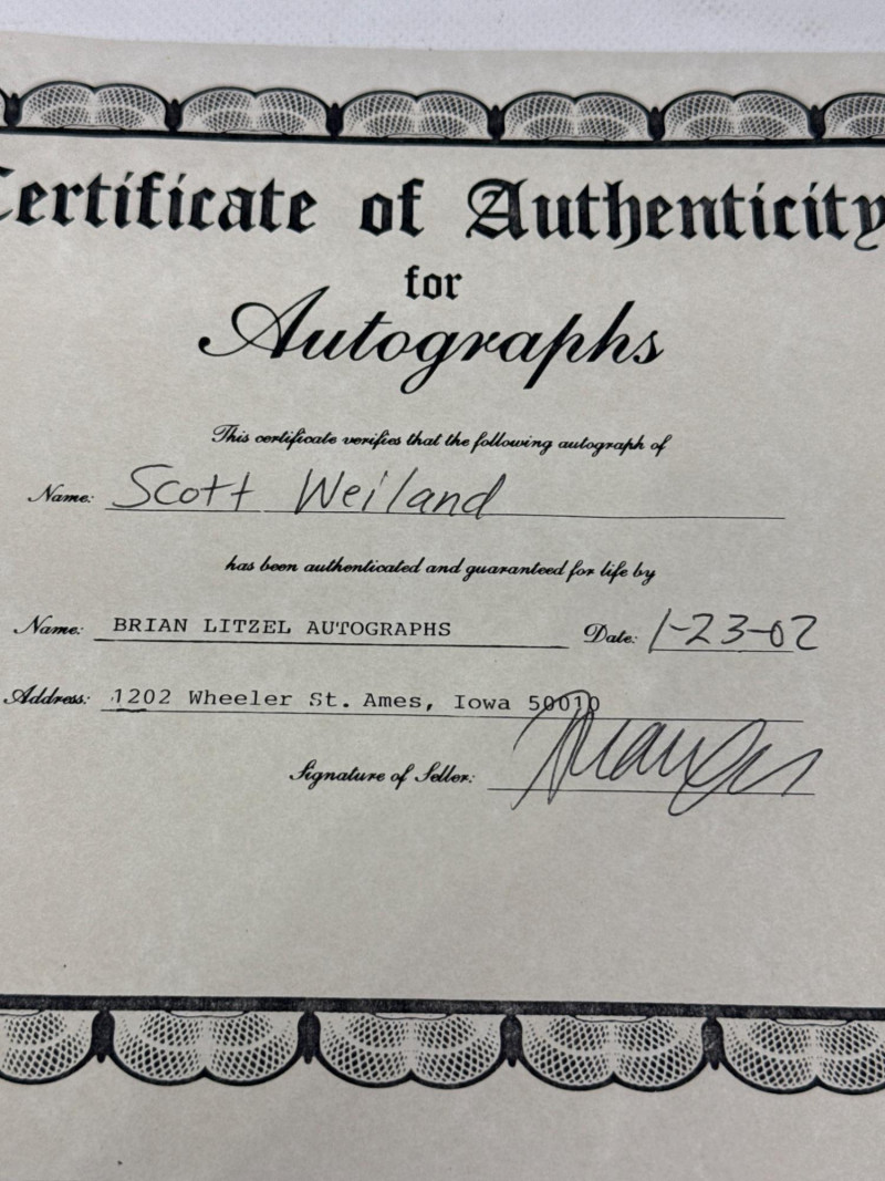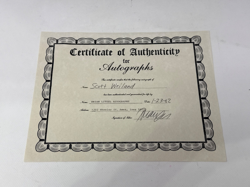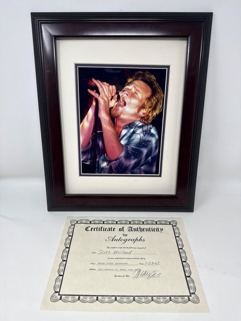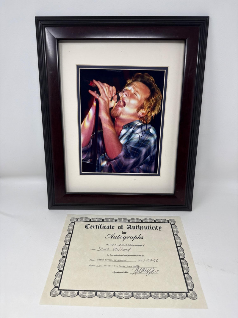 Authentic signed 8x10 photo of Scott Weiland, professionally framed and ready for display. Signature is clear and visible on the photo. Includes Certificate of Authenticity from Brian Litzel Autographs dated 1-23-02. Frame presents well and protects the photo nicely.