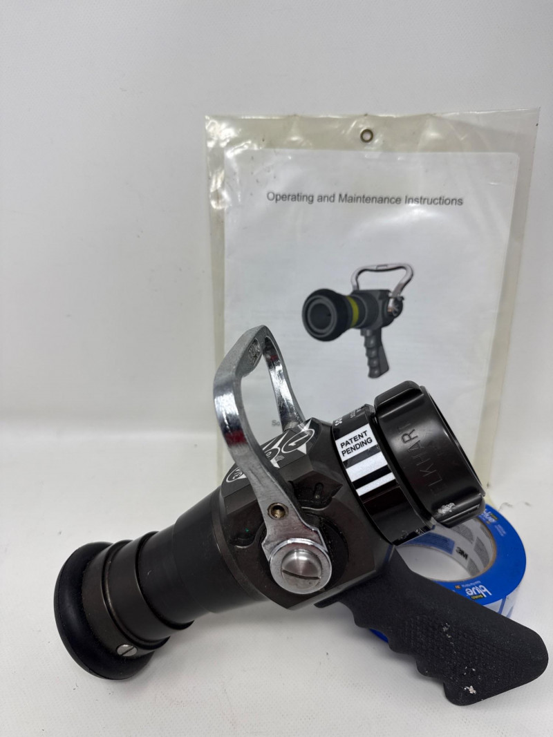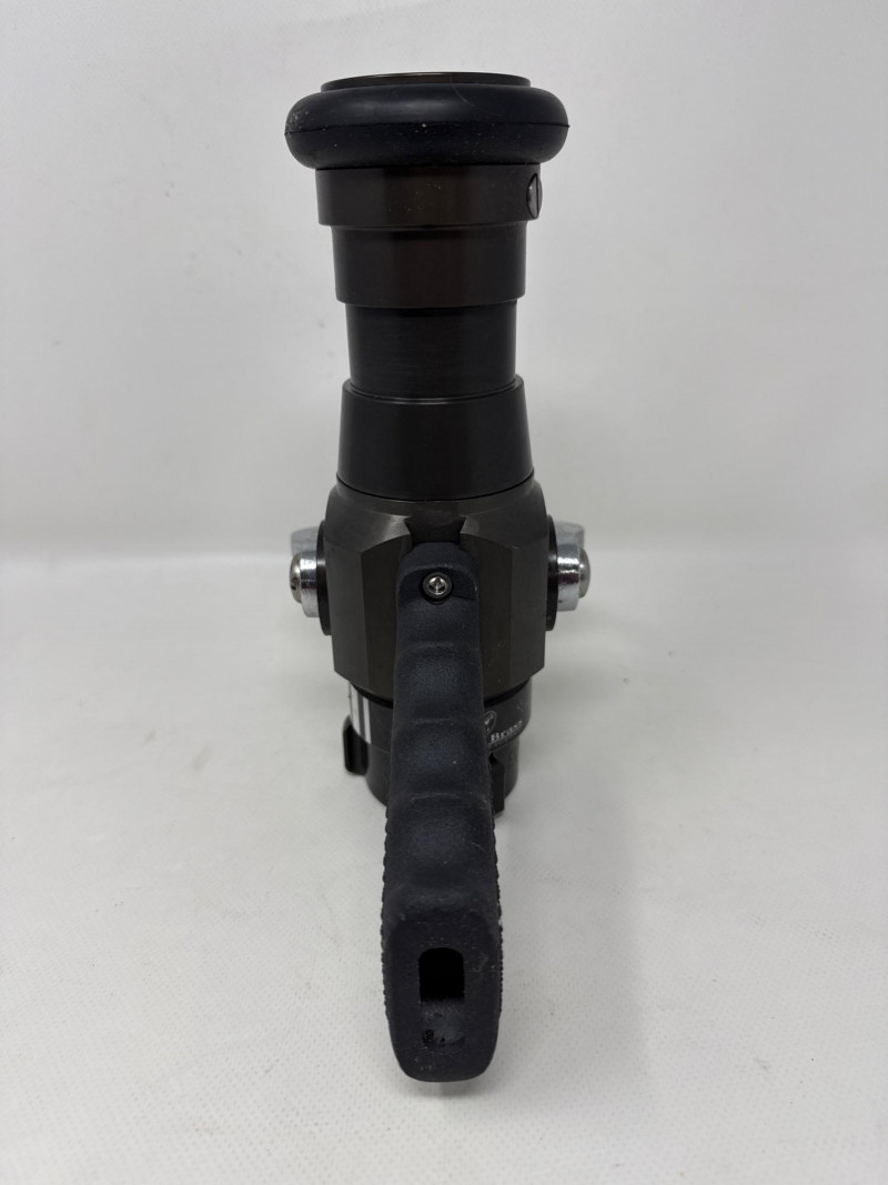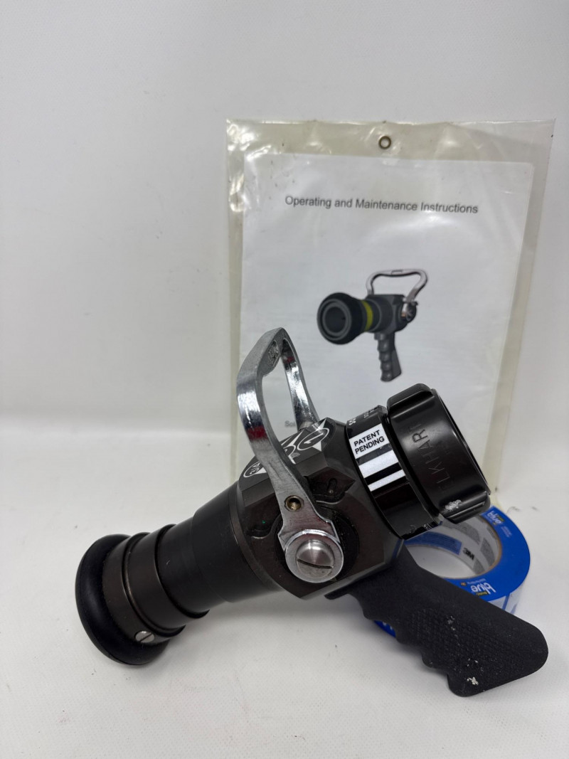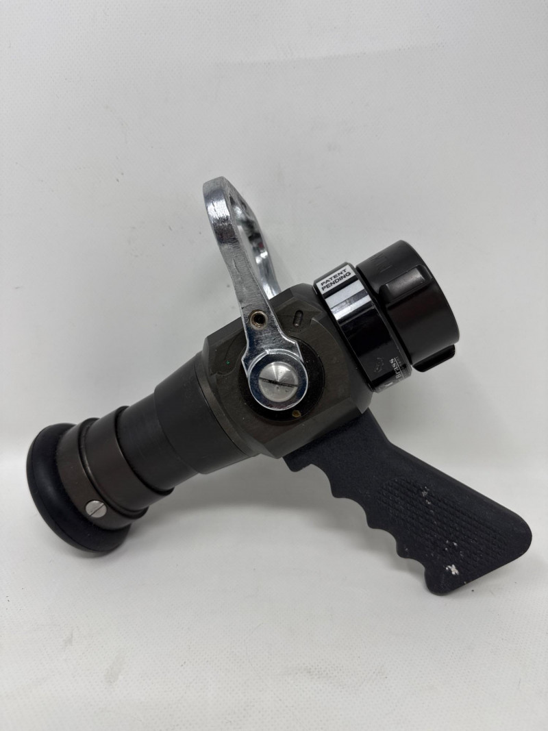 The central item is a professional‑grade firefighting nozzle, the type typically used on fire hoses for controlling water flow and spray patterns.