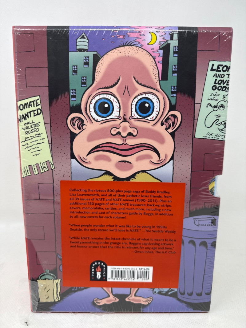 Offered here is The Complete Hate by Peter Bagge, a highly collectible three-volume hardcover box set published by Fantagraphics. This set is brand new in original shrink wrap (NIB) and remains unopened. This comprehensive collection brings together the full run of Bagge’s iconic alternative comic series Hate, including the original 1990–1998 issues and later annuals, totaling nearly 1,000 pages of material.