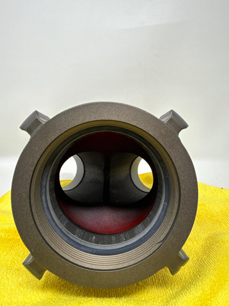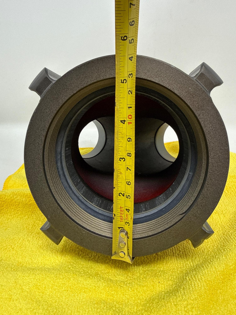 Larger cap does not fit valve. Valve has not been used. The item is a red, Y‑shaped fire department connection (FDC) fitting, commonly used in firefighting systems to allow fire crews to connect hoses and supply water to a building’s standpipe or sprinkler system.