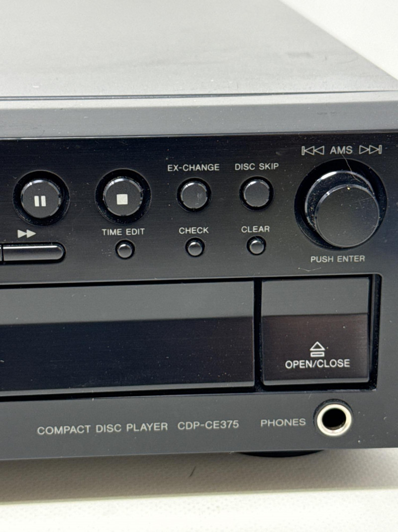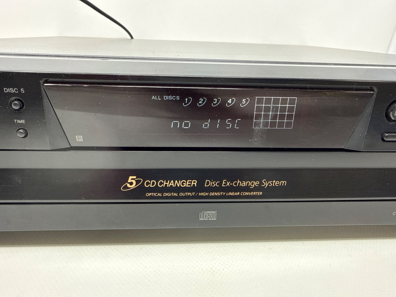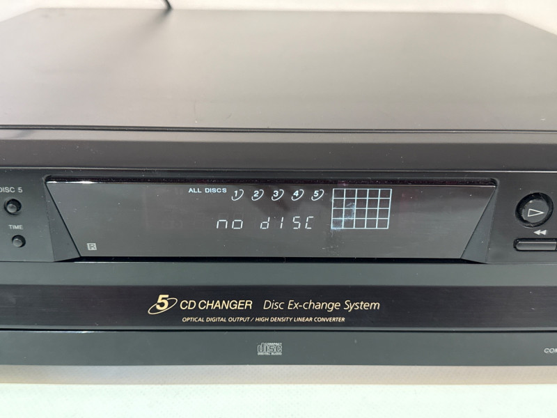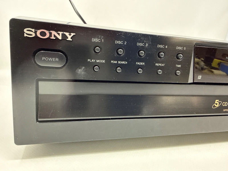 The item is a Sony multi‑disc CD/DVD player, designed for home entertainment systems. It has a sleek black rectangular chassis with a minimalist front panel typical of Sony’s late‑1990s to early‑2000s audio/video components.