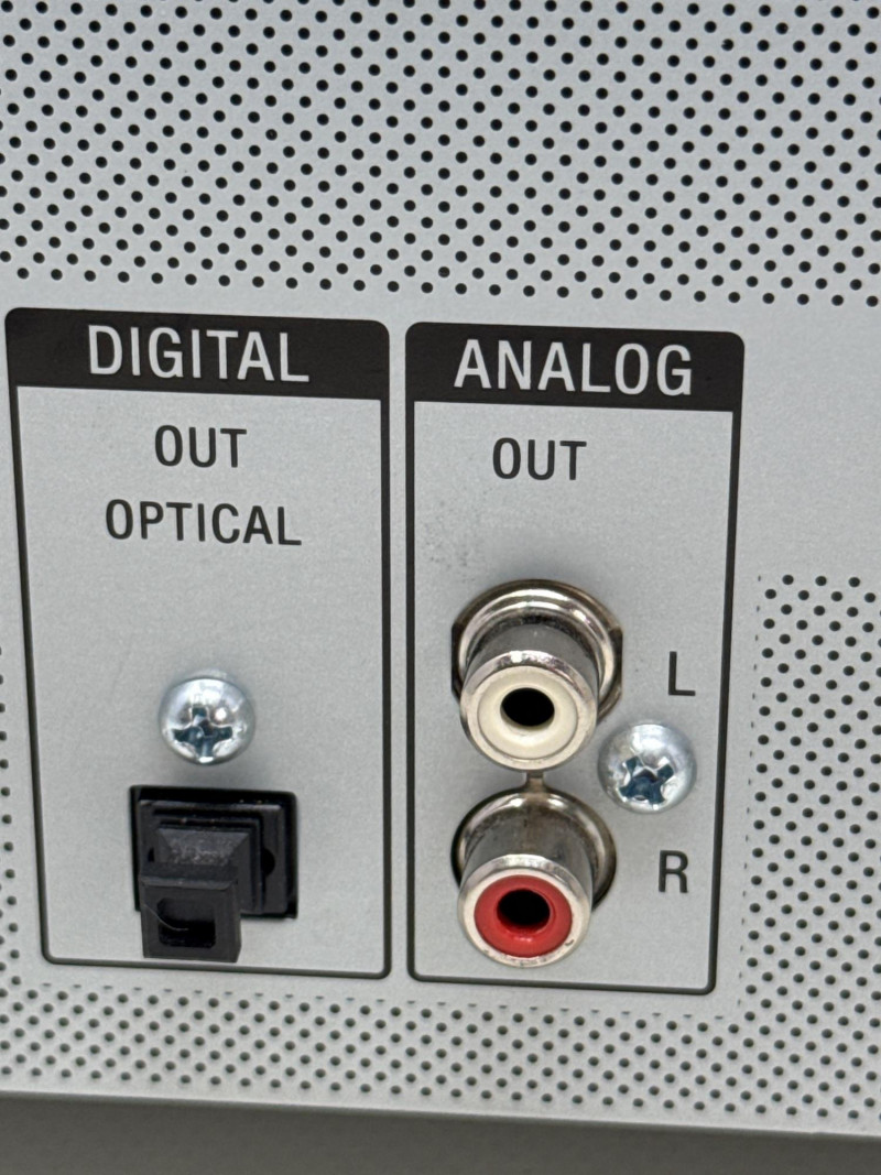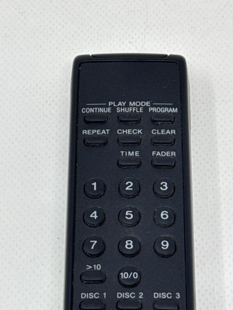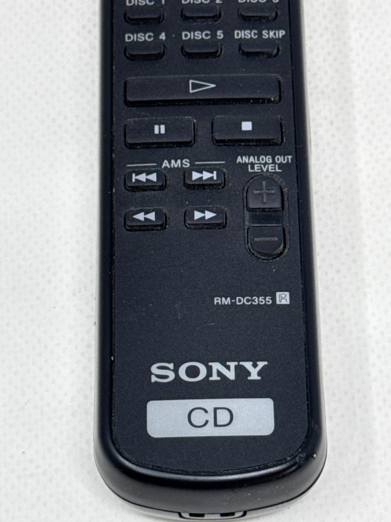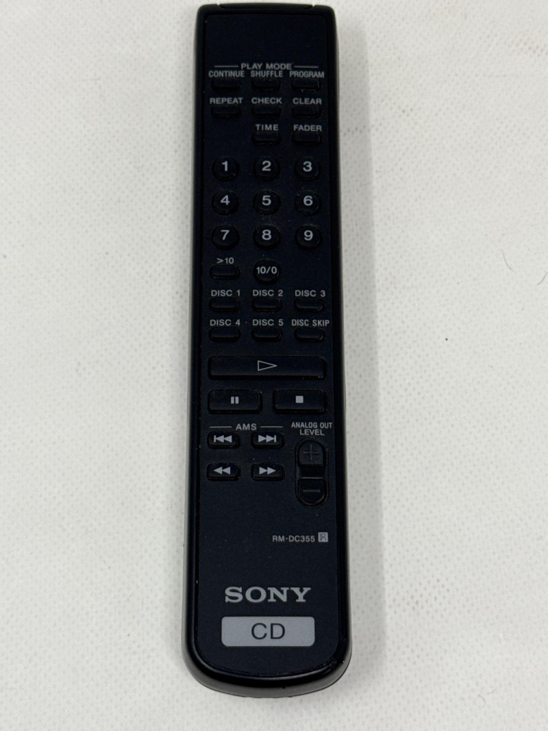 The layout is symmetrical and clean, with buttons arranged in a horizontal line for easy access. Remote Control is a matching black Sony remote is placed in front of the unit. Powered up. Not tested with speakers. Remote needs batteries.