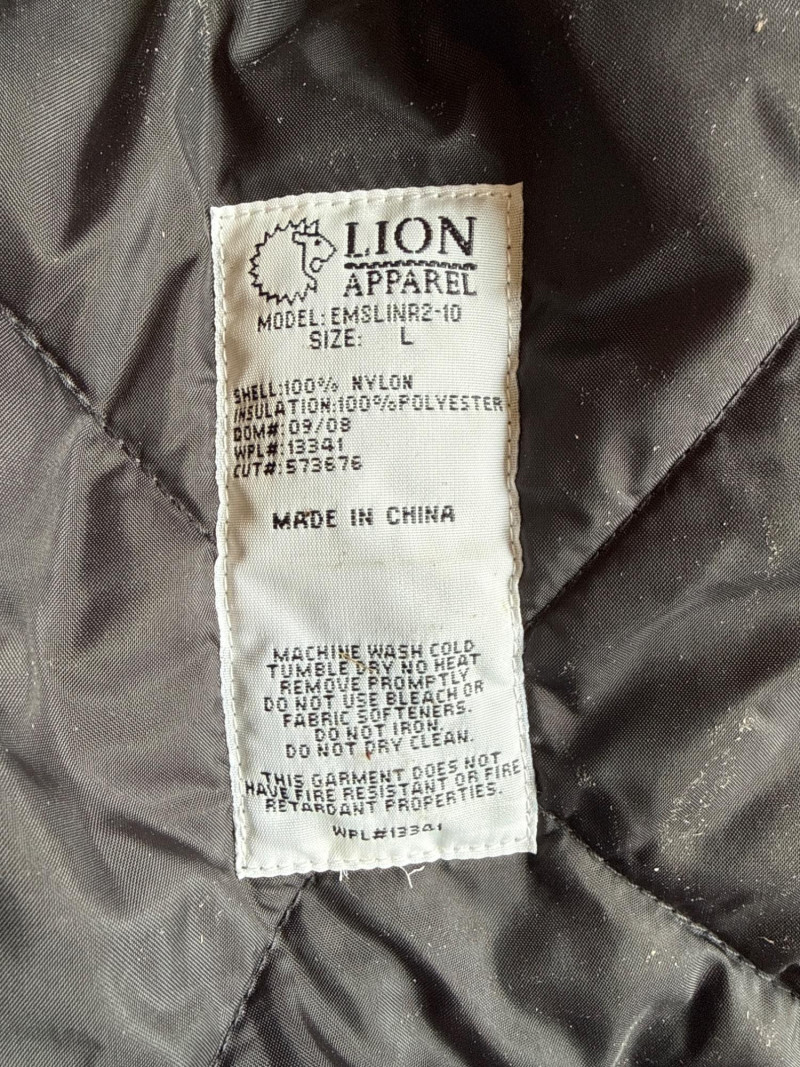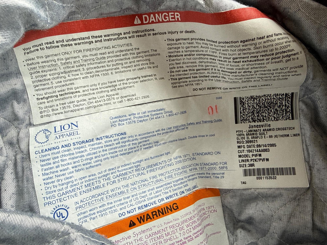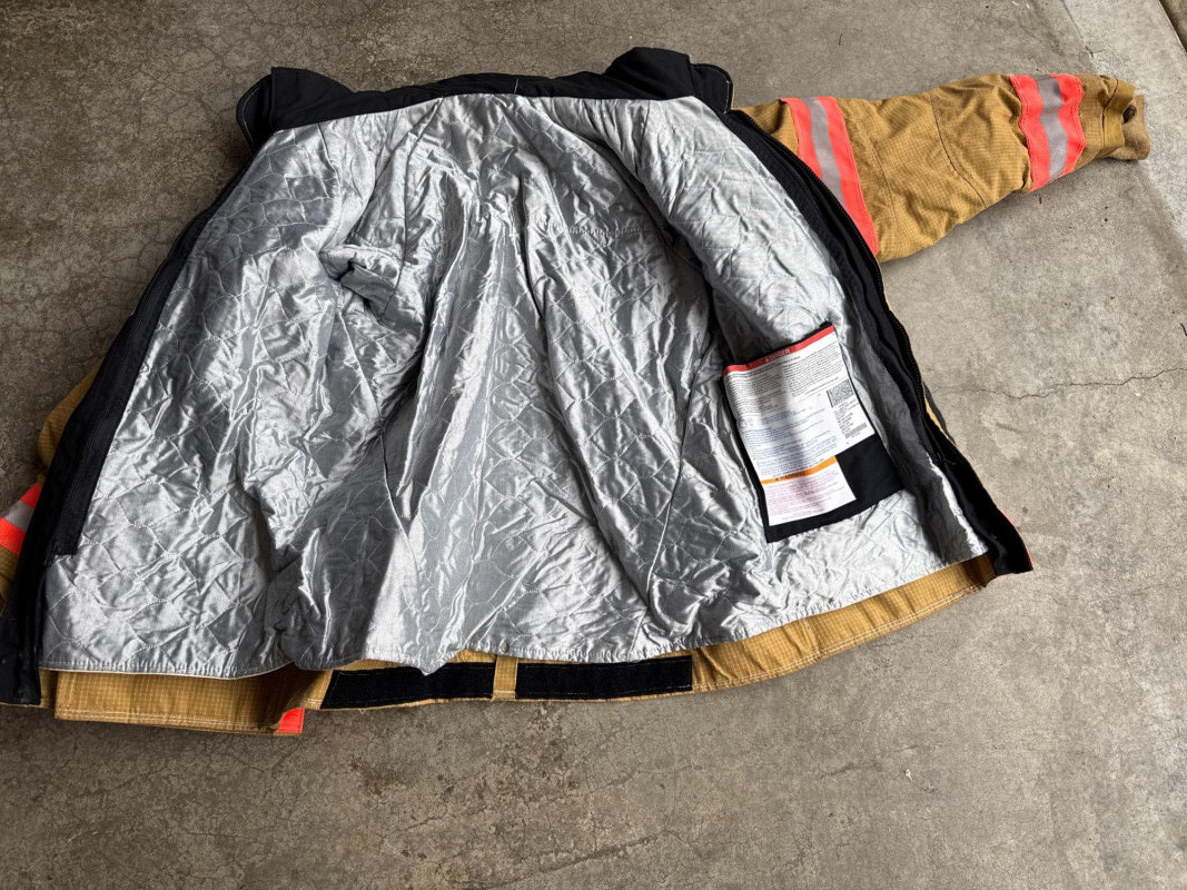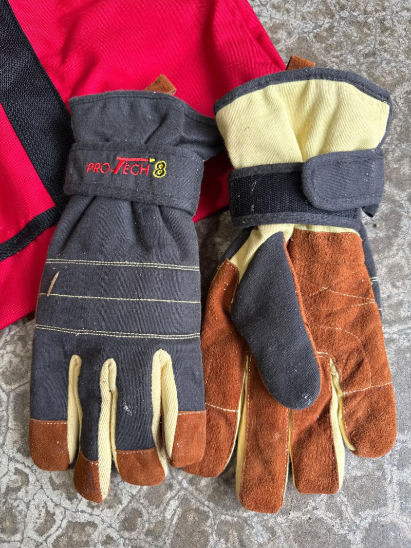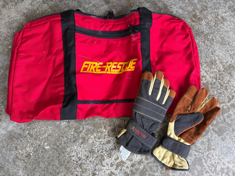 Complete personal firefighter gear set including turnout jacket and pants, helmet with visor, gloves, jacket liner, equipment bag, and brand new rubber boots. Items appear in very good condition with some pieces unused (boots and helmet). Helmet is Cairns 360S model, and gear includes quality brands like Lion Apparel and Pro-Tech. Great for collection, training, or display. Please review all photos for exact condition, sizing, and details.