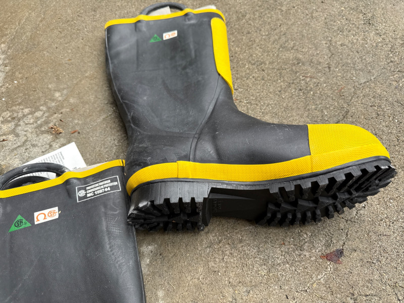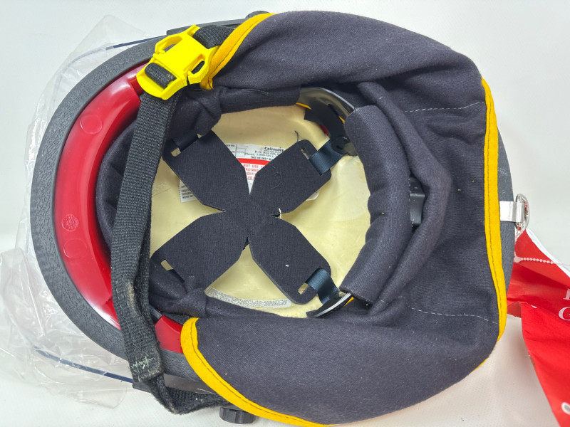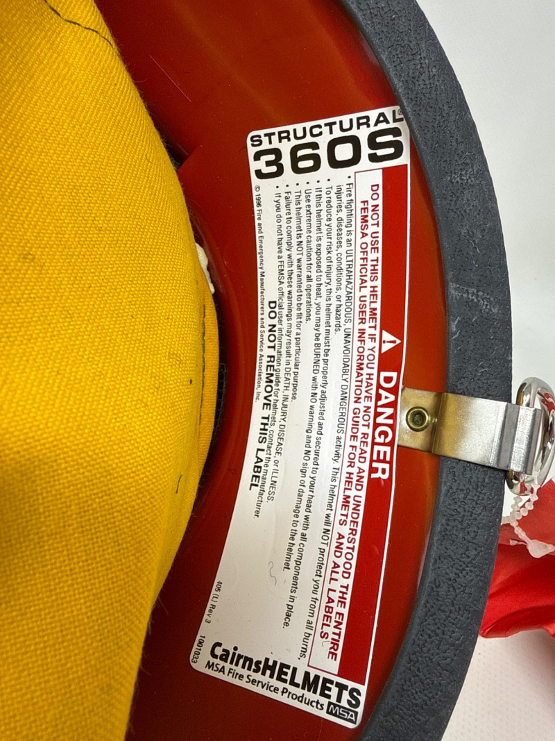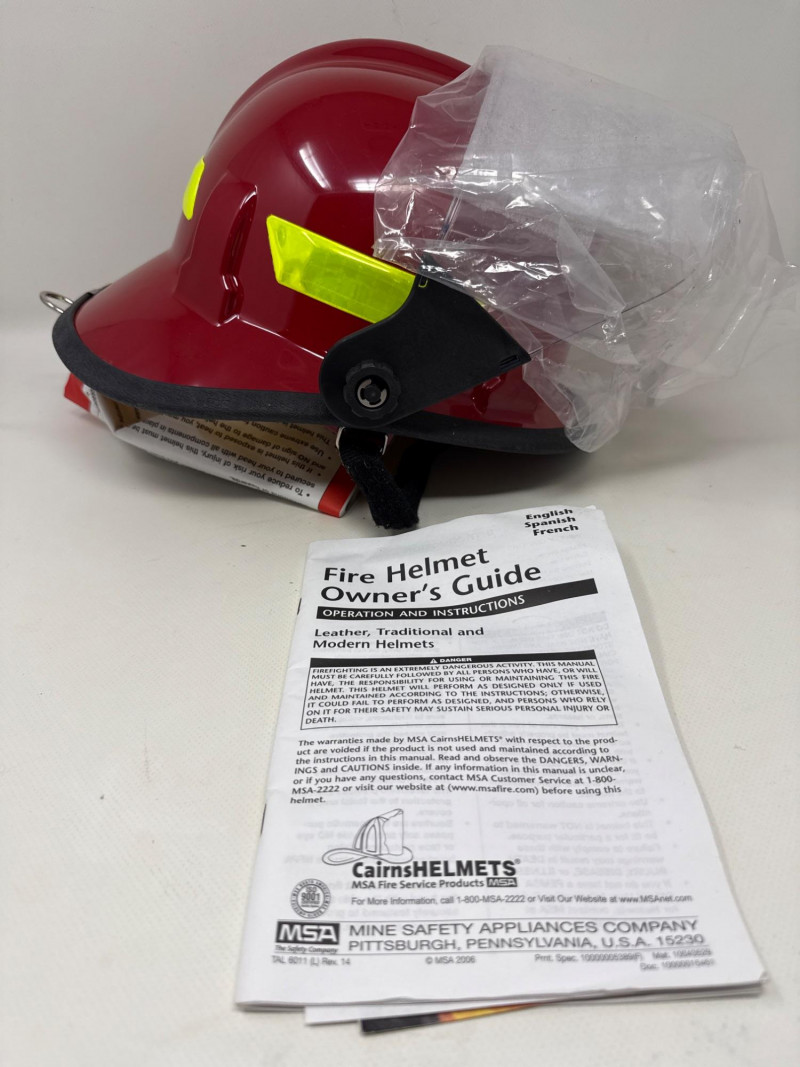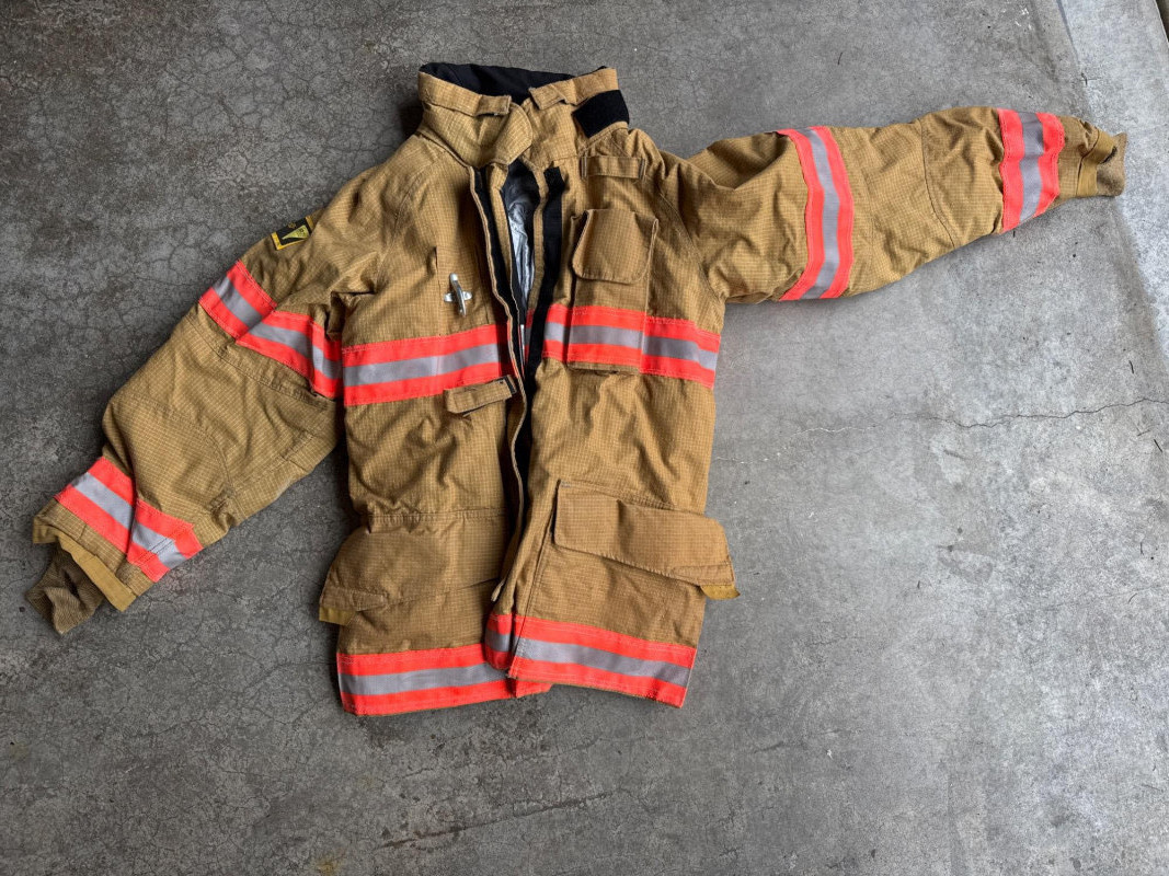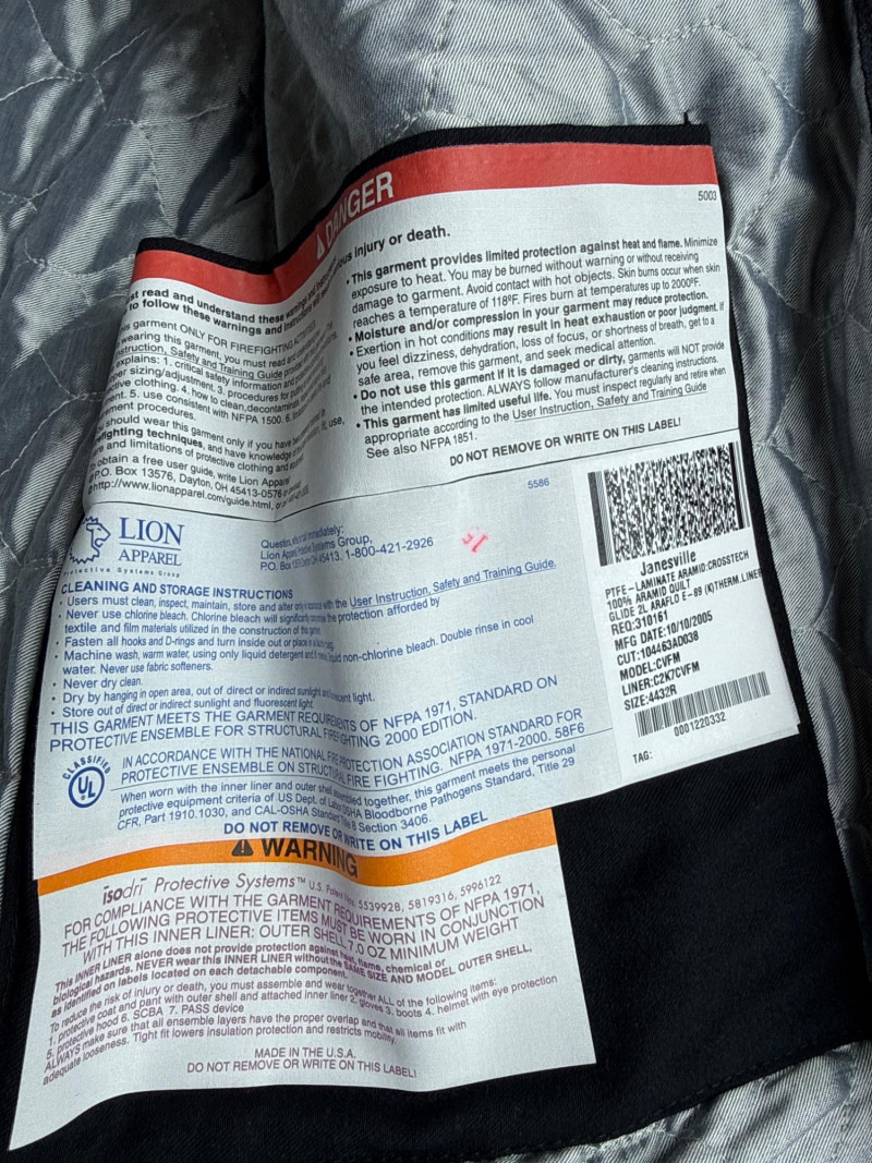 Complete personal firefighter gear set including turnout jacket and pants, helmet with visor, gloves, jacket liner, equipment bag, and brand new rubber boots. Items appear in very good condition with some pieces unused (boots and helmet). Helmet is Cairns 360S model, and gear includes quality brands like Lion Apparel and Pro-Tech. Great for collection, training, or display. Please review all photos for exact condition, sizing, and details.