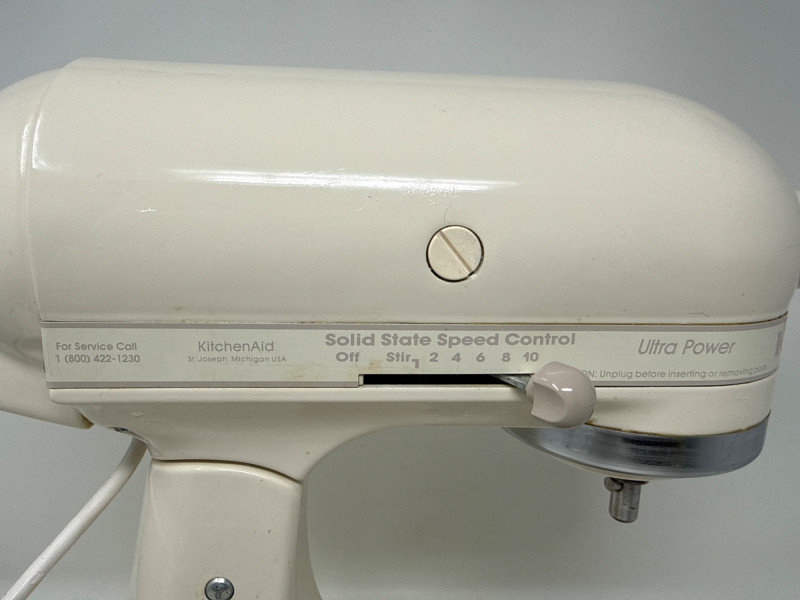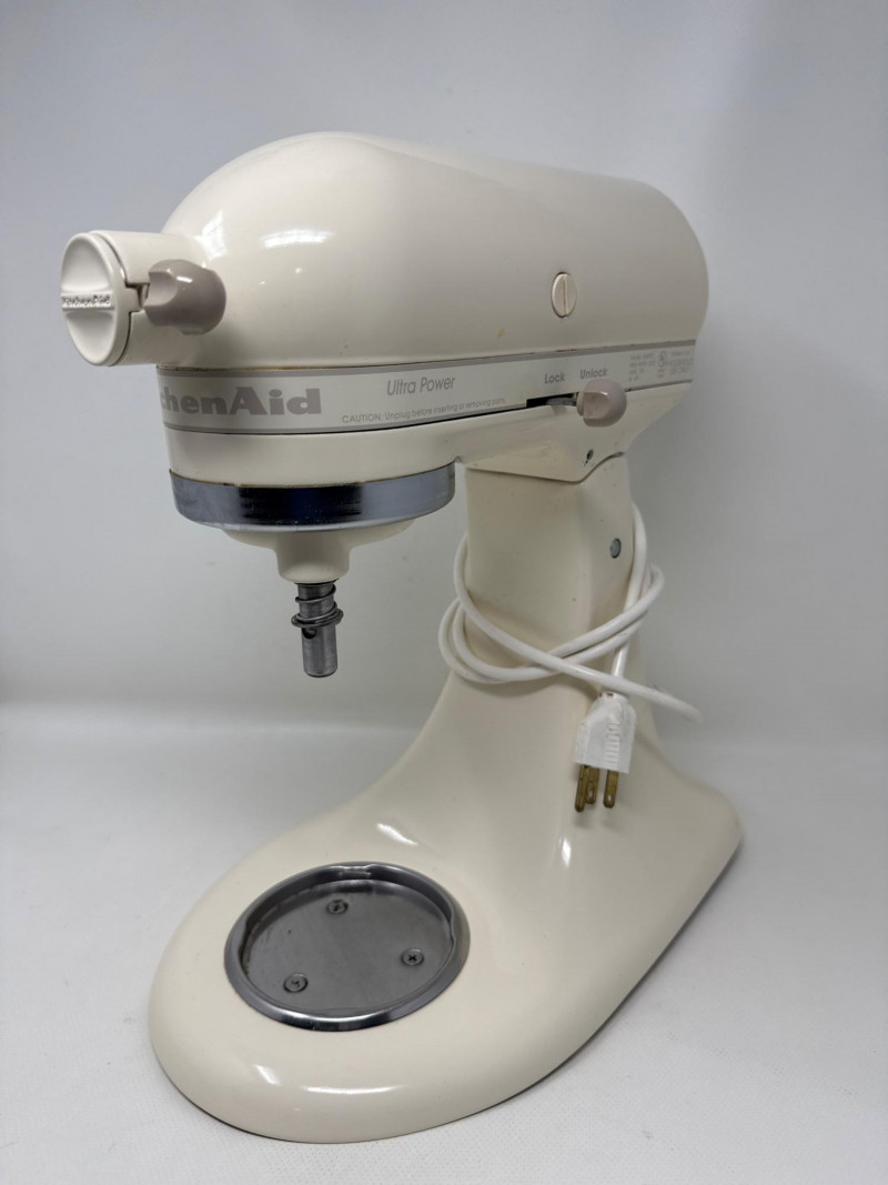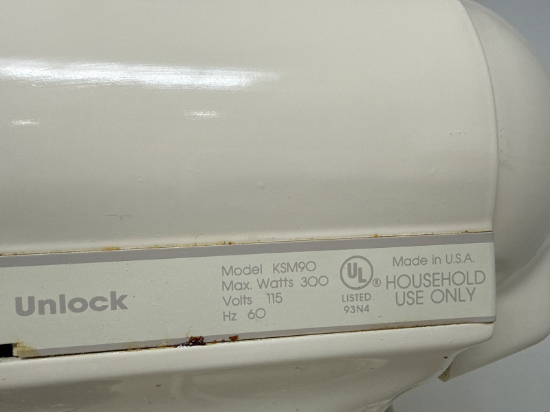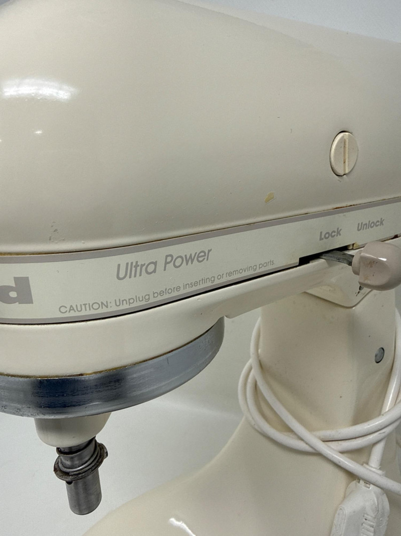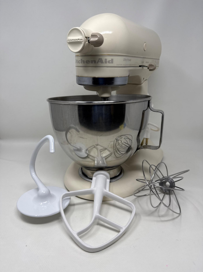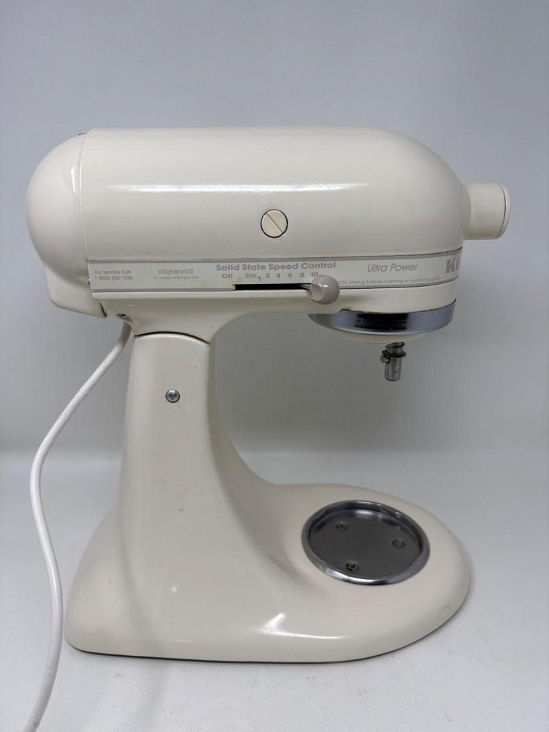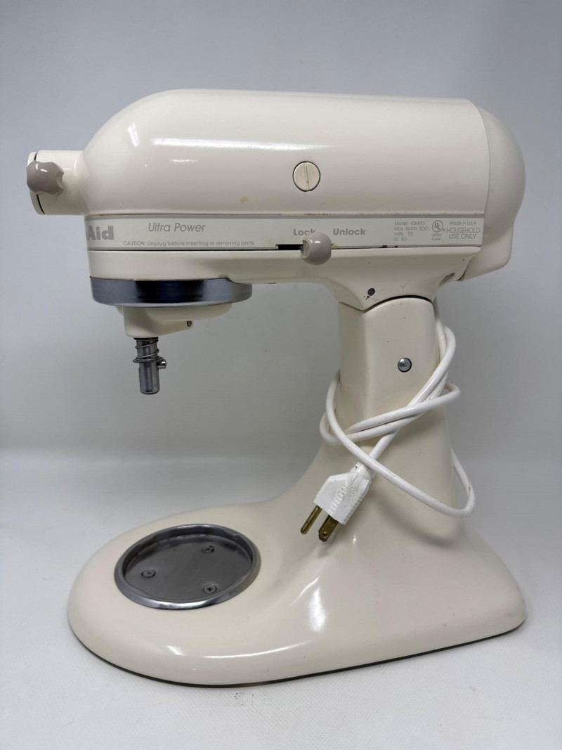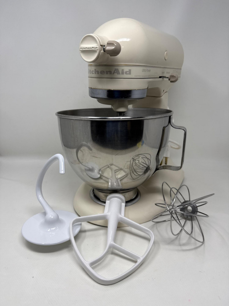 KitchenAid Ultra Power stand mixer (Model KSM90) in good working condition, includes stainless steel bowl and three attachments (flat beater, dough hook, and wire whisk). Classic tilt-head design with 10 speeds, perfect for baking, mixing, and dough preparation. Shows normal signs of use due to age but still solid and reliable. See photos for details.