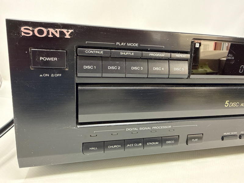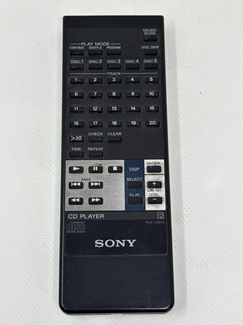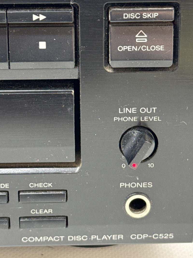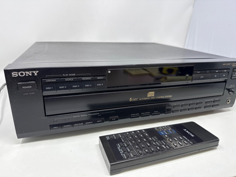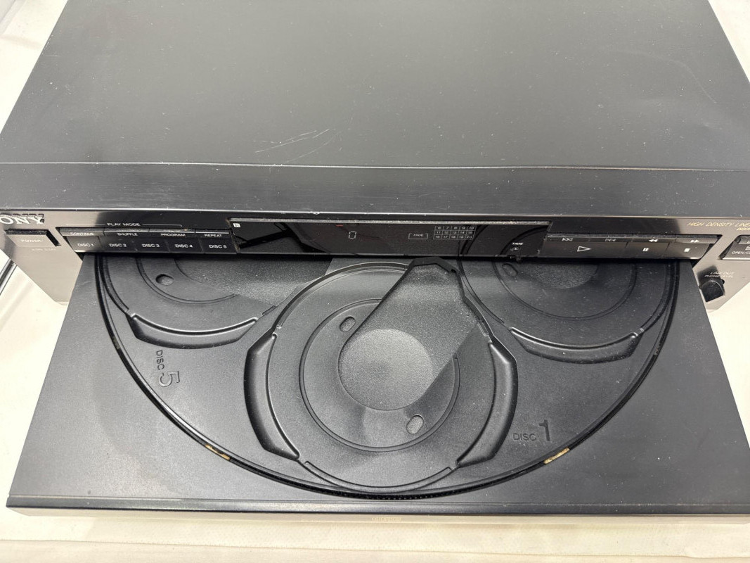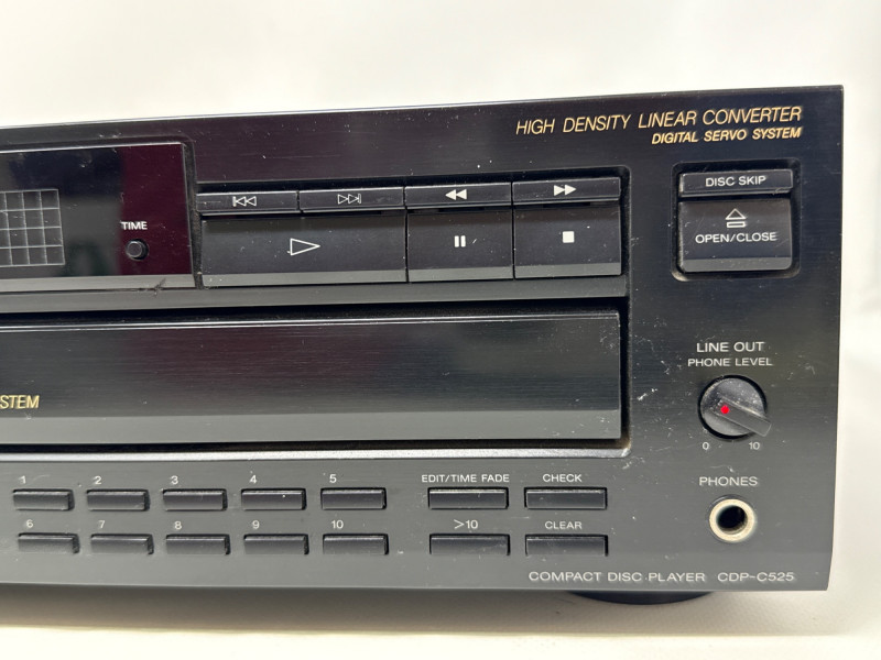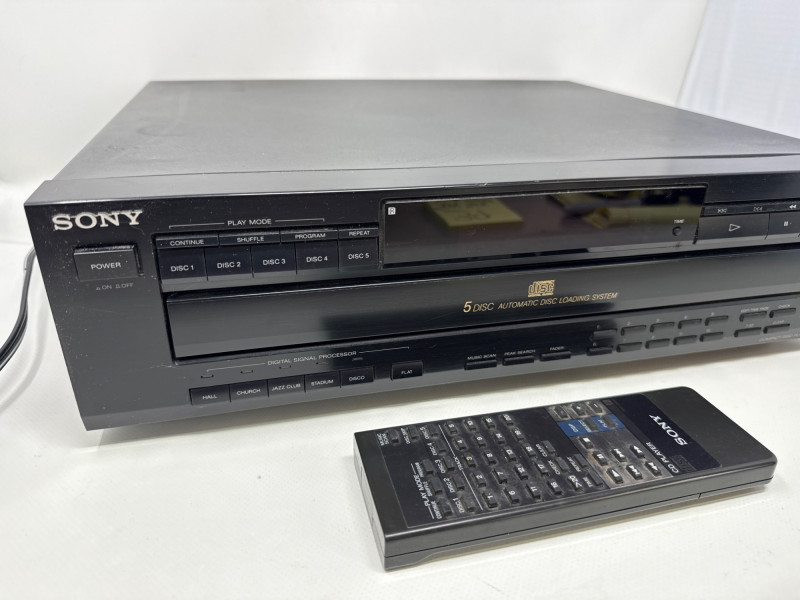 Vintage Sony CDP-C525 5-disc CD changer in good condition with original RM-D615 remote included. Made in Japan (1992), this unit features a motorized carousel tray, multiple play modes (shuffle, program, repeat), and front headphone jack with adjustable level. Powered up. Not tested with speakers. Remote needs batteries