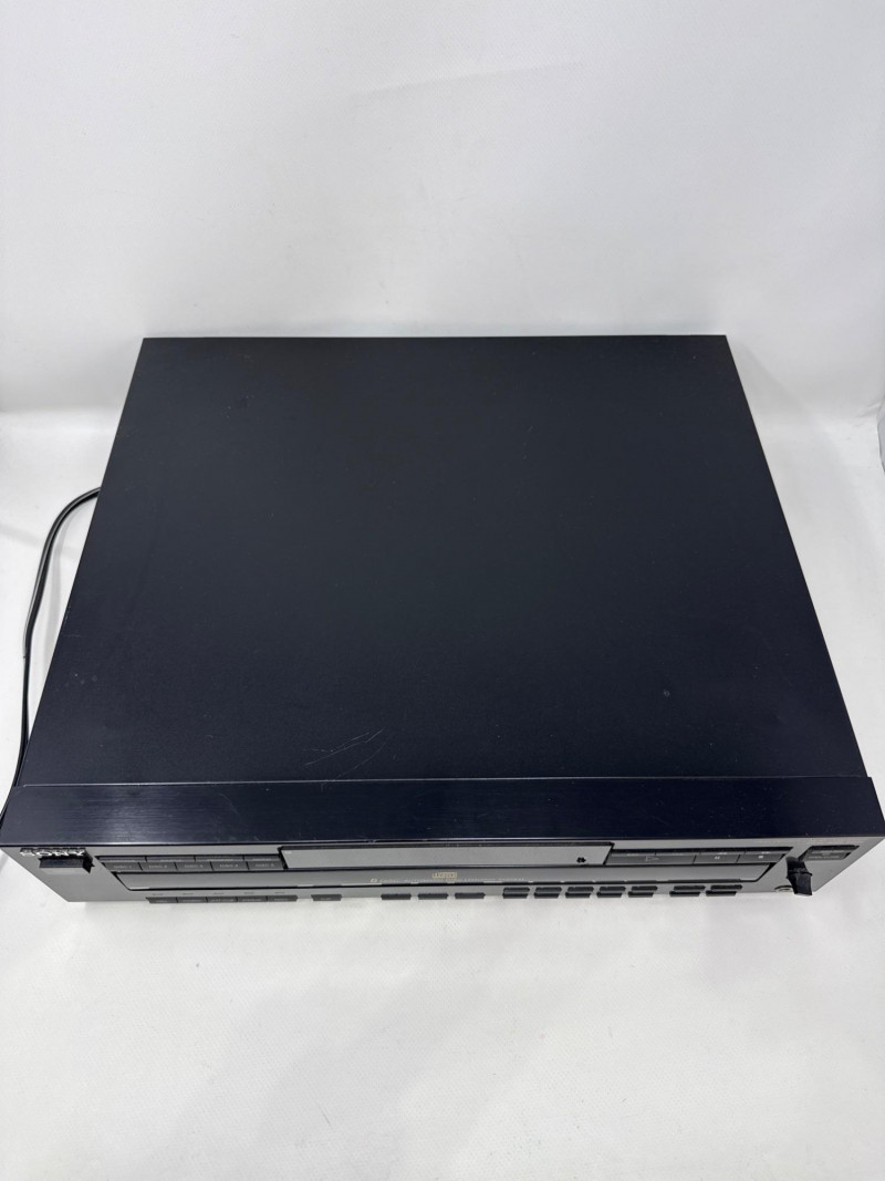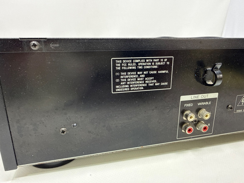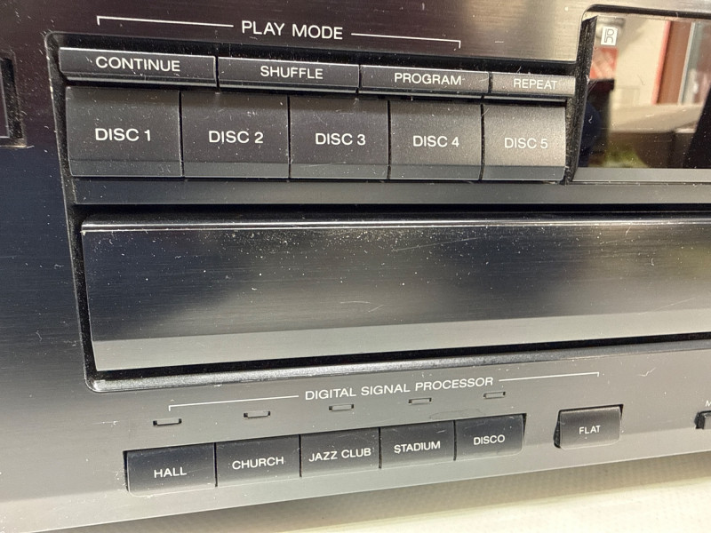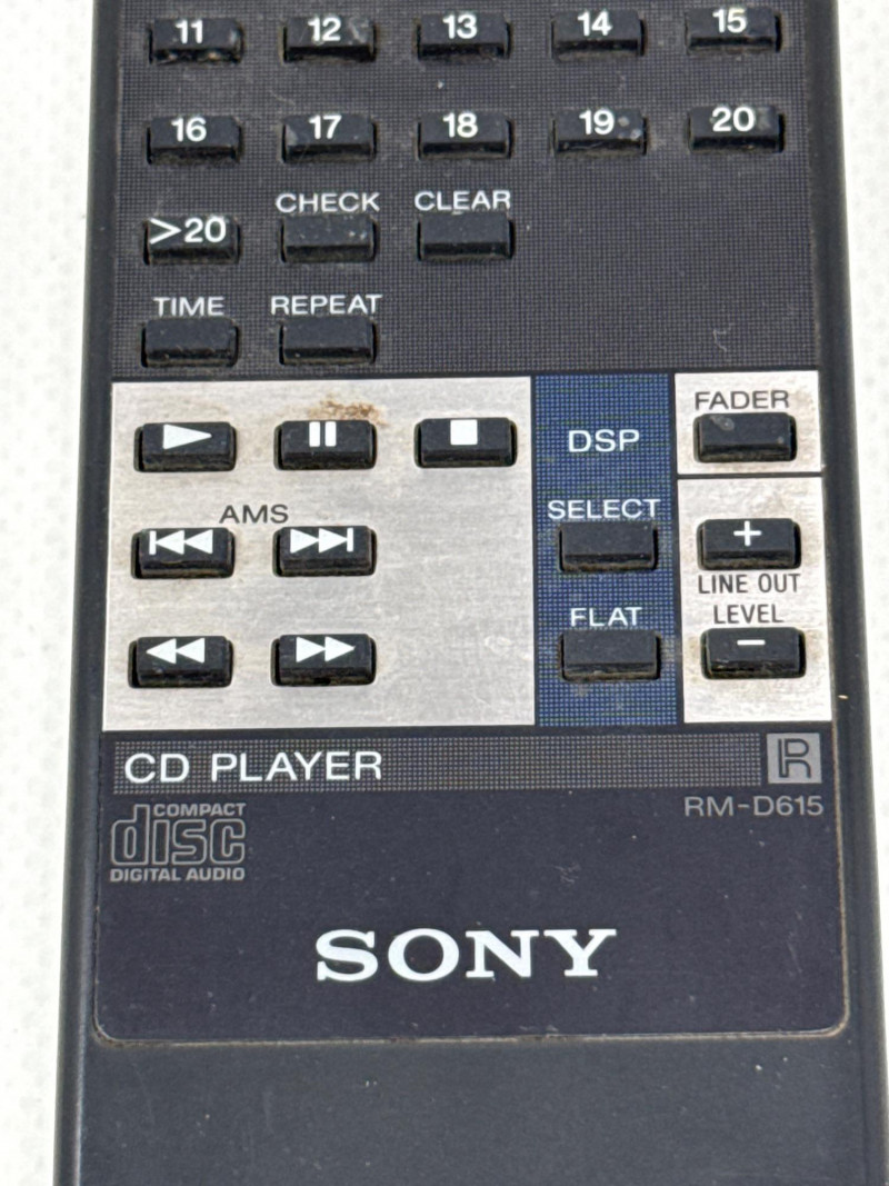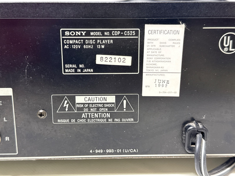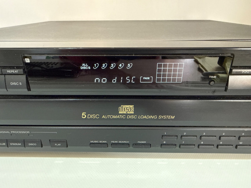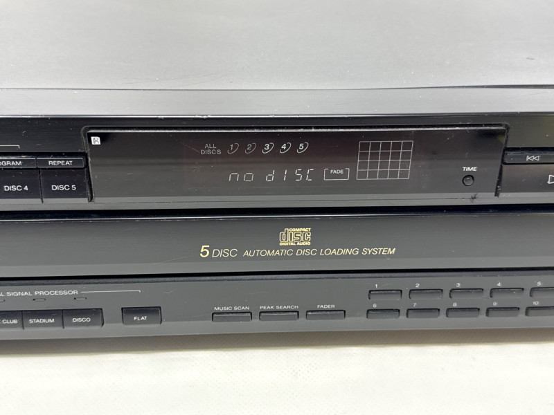 Vintage Sony CDP-C525 5-disc CD changer in good condition with original RM-D615 remote included. Made in Japan (1992), this unit features a motorized carousel tray, multiple play modes (shuffle, program, repeat), and front headphone jack with adjustable level. Powered up. Not tested with speakers. Remote needs batteries