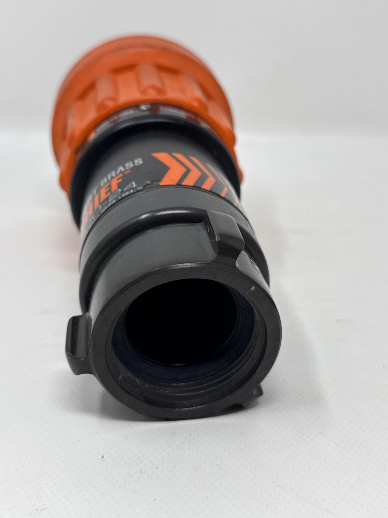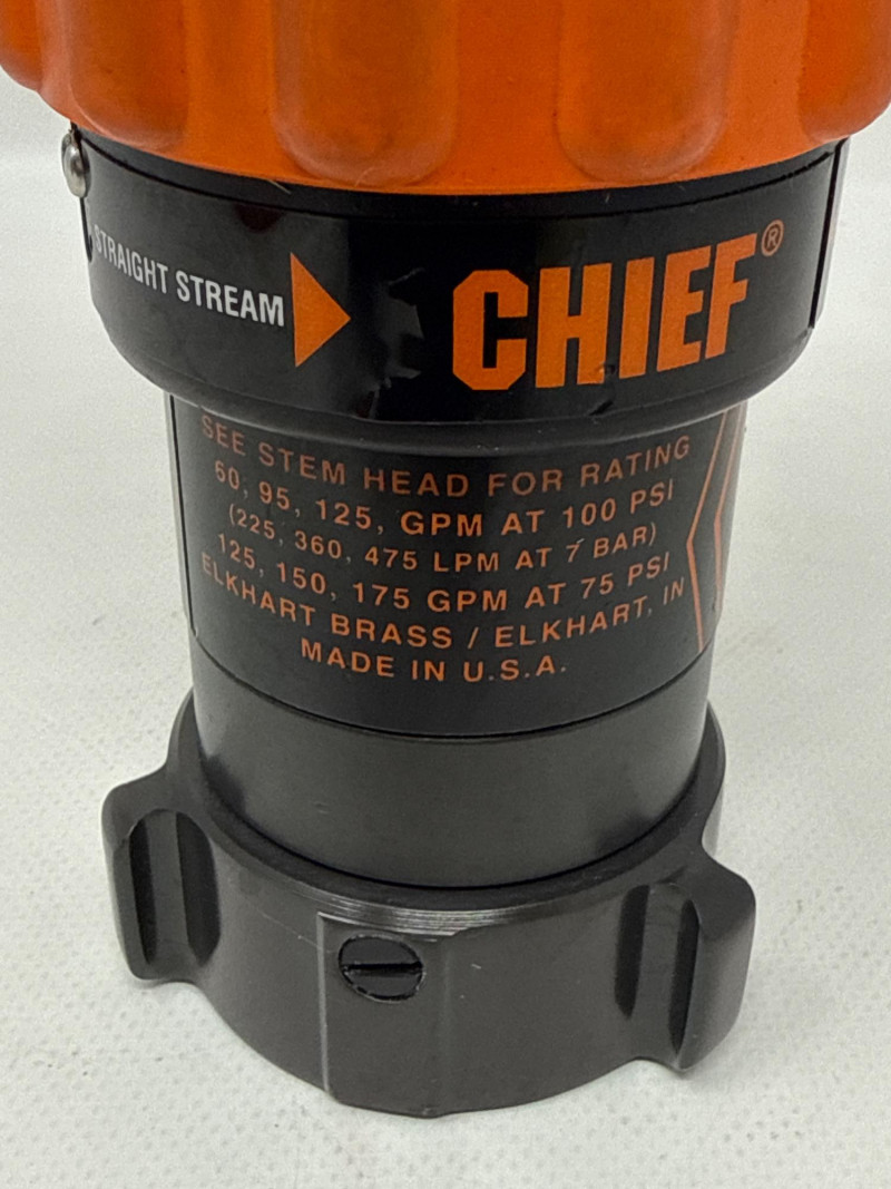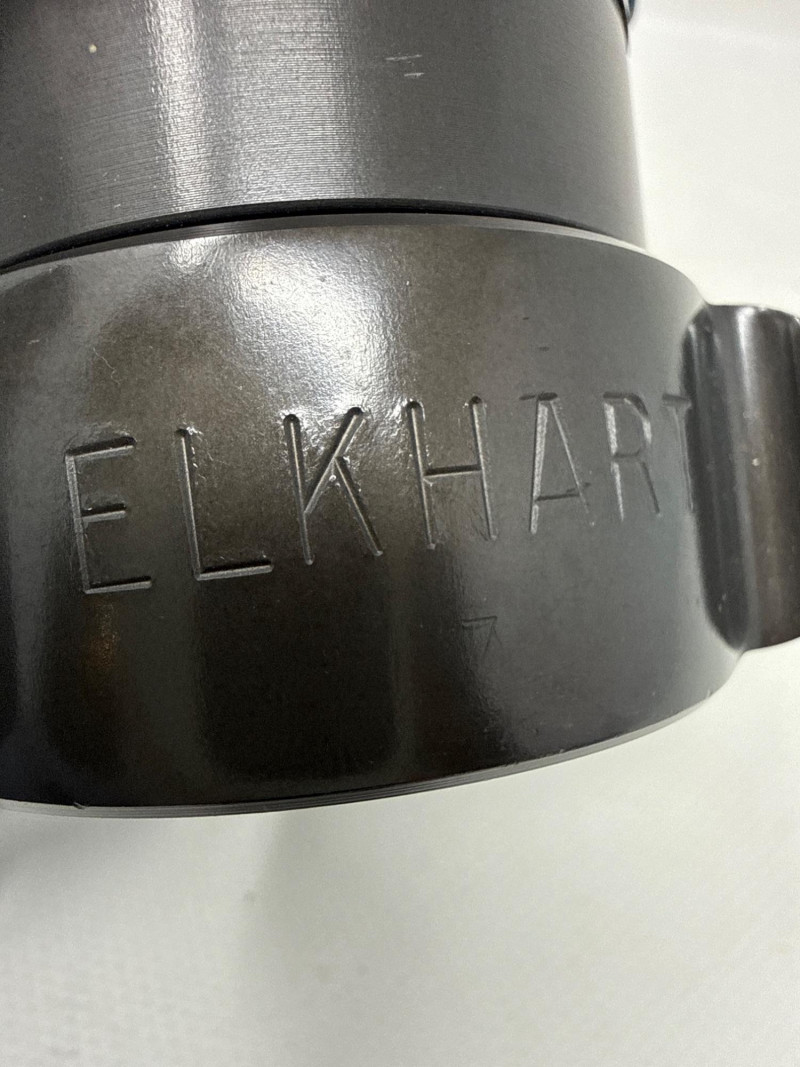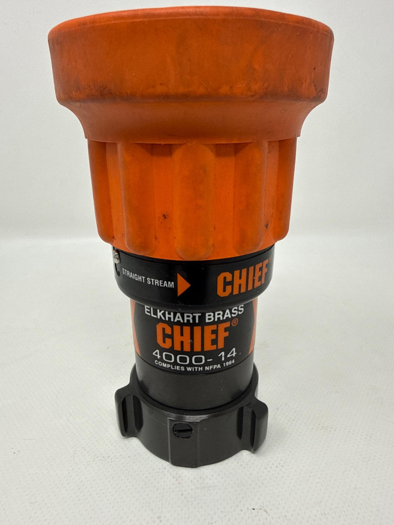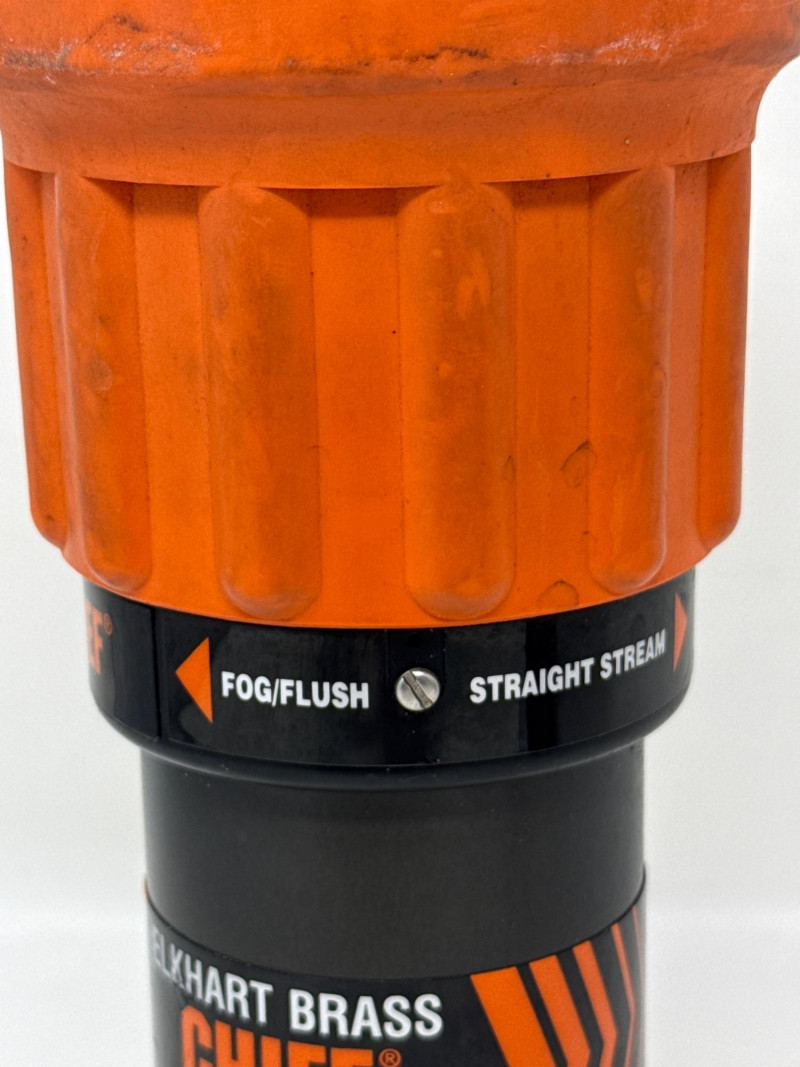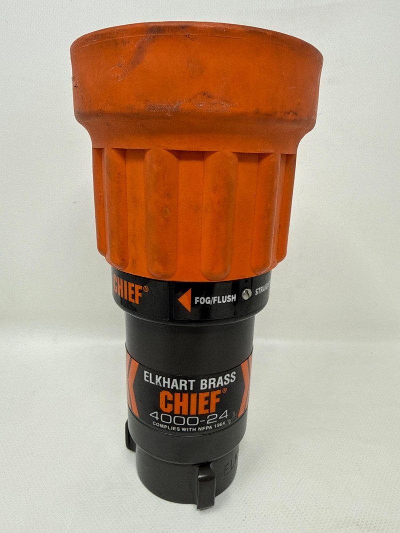 Up for sale is a lot of two genuine Elkhart Brass “Chief” fire hose nozzles, models 4000-24 and 4000-14. These are professional-grade firefighting nozzles known for their rugged construction and reliable performance. The Chief series features a fixed-flow design that allows smooth transition from straight stream to fog/flush, delivering consistent water flow and solid stream quality .Dimensions: