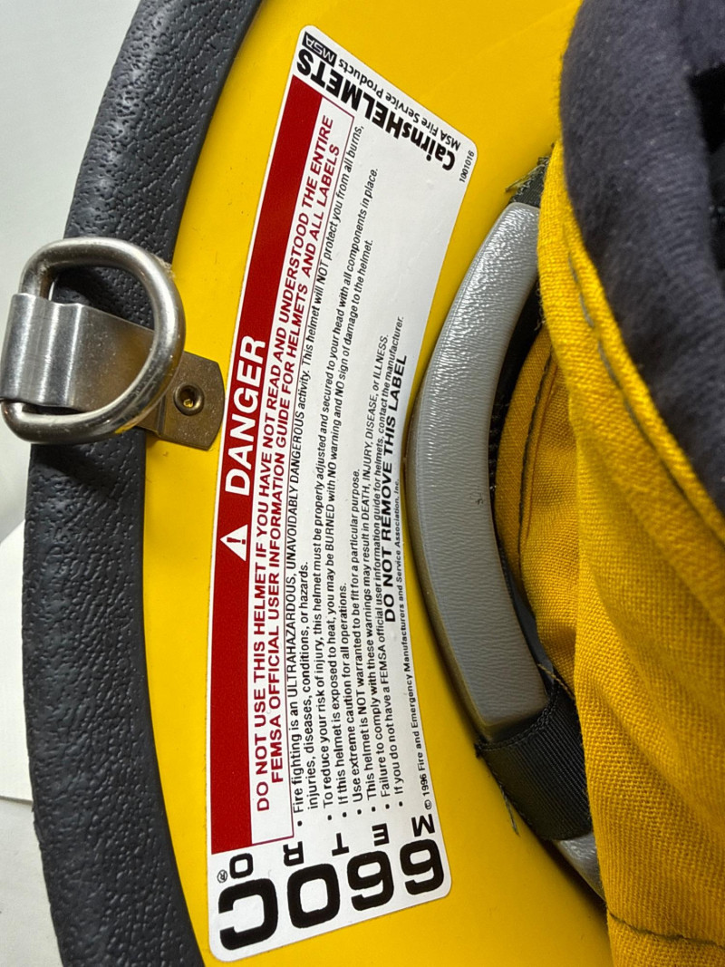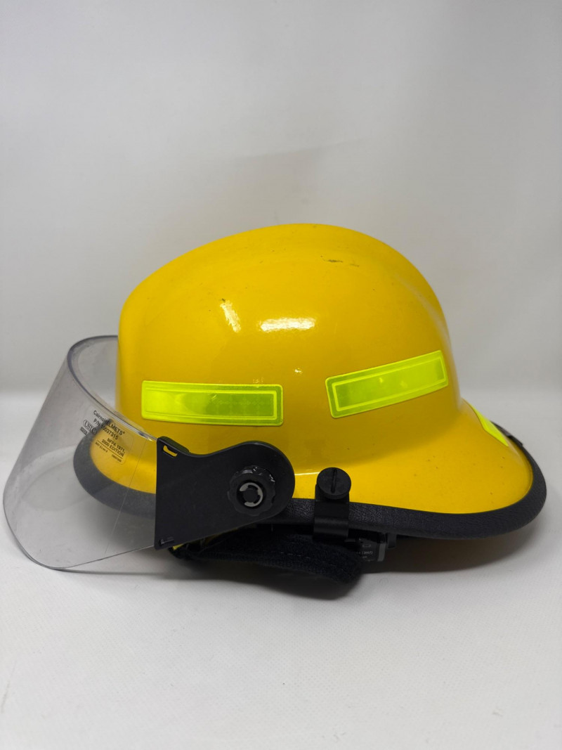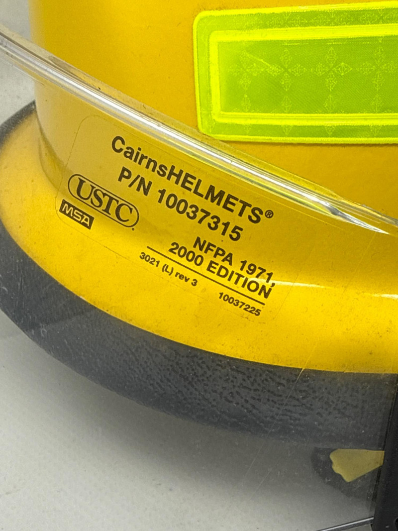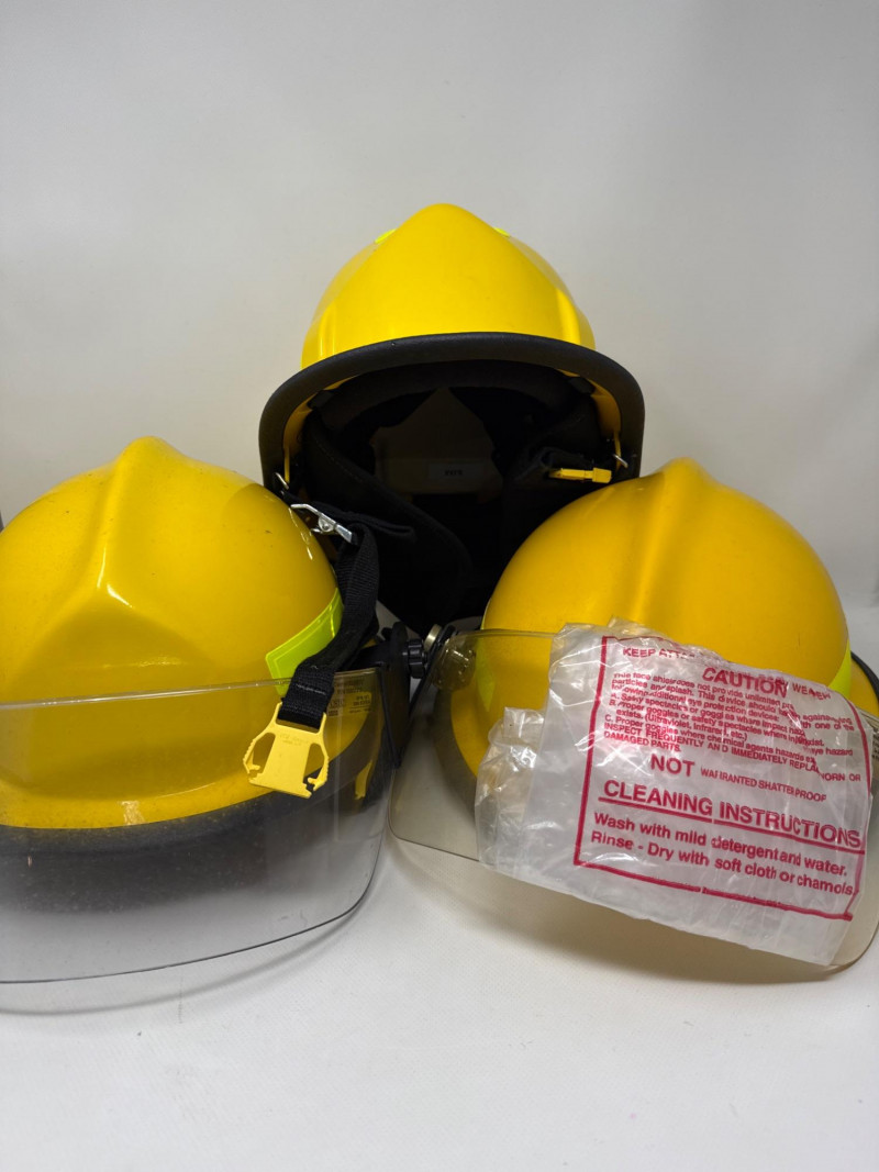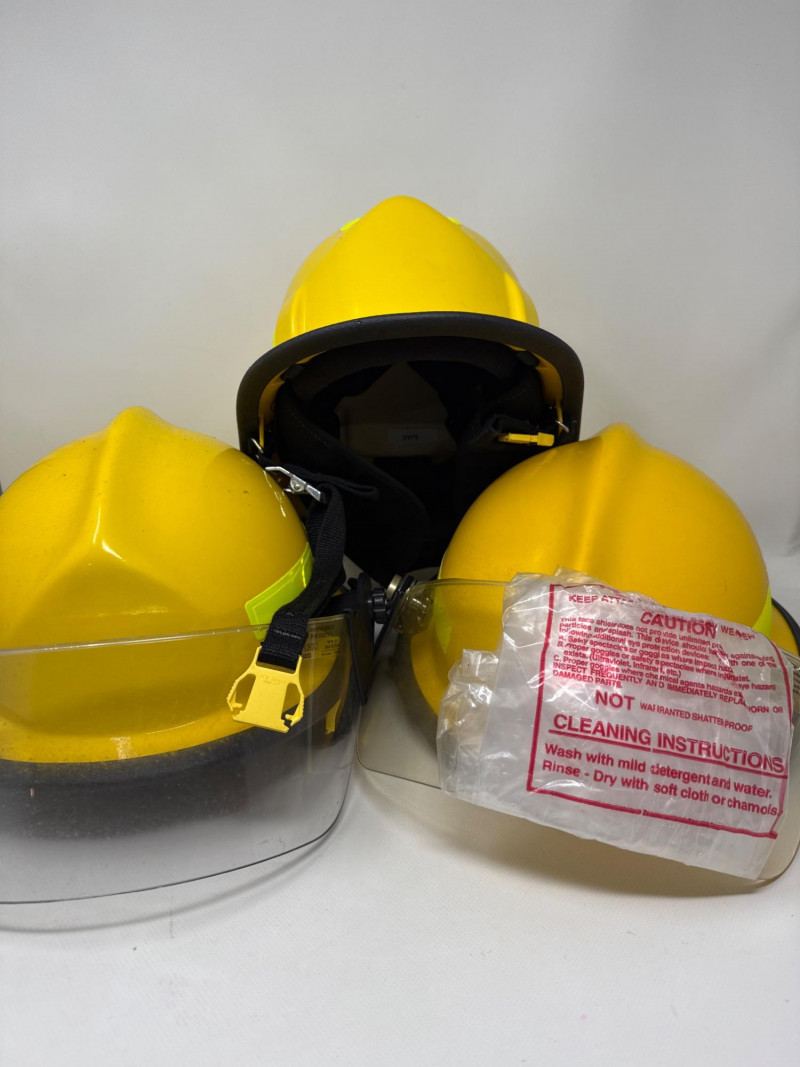 Set of 3 MSA Cairns yellow firefighter helmets (Legacy 5 models by Lion Apparel). Made in the USA with durable fiberglass composite shells, adjustable suspension, and chin straps—includes 1 helmet that appears unused with face shield, 1 that appears unused without face shield, and 1 used helmet with visible wear and attached face shield. All are no longer certified for active fire safety use. They are being sold for display, collection, training props, or costume/film use.