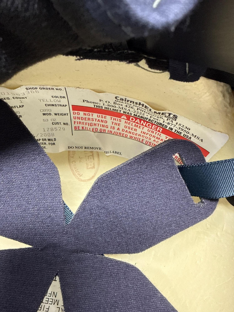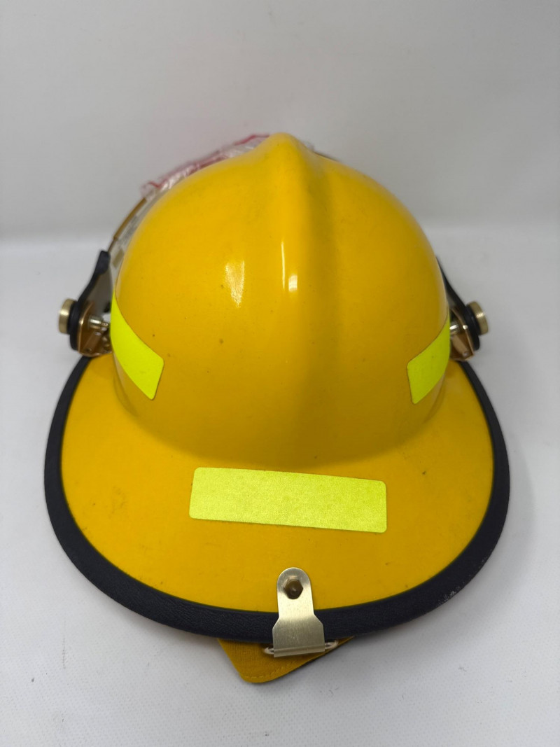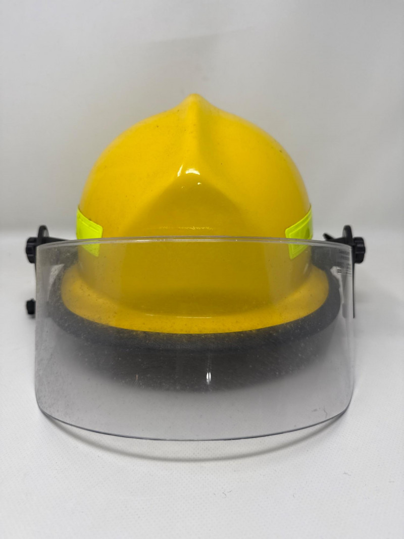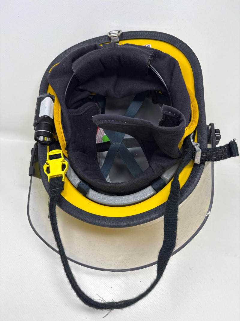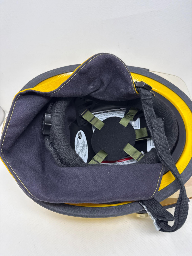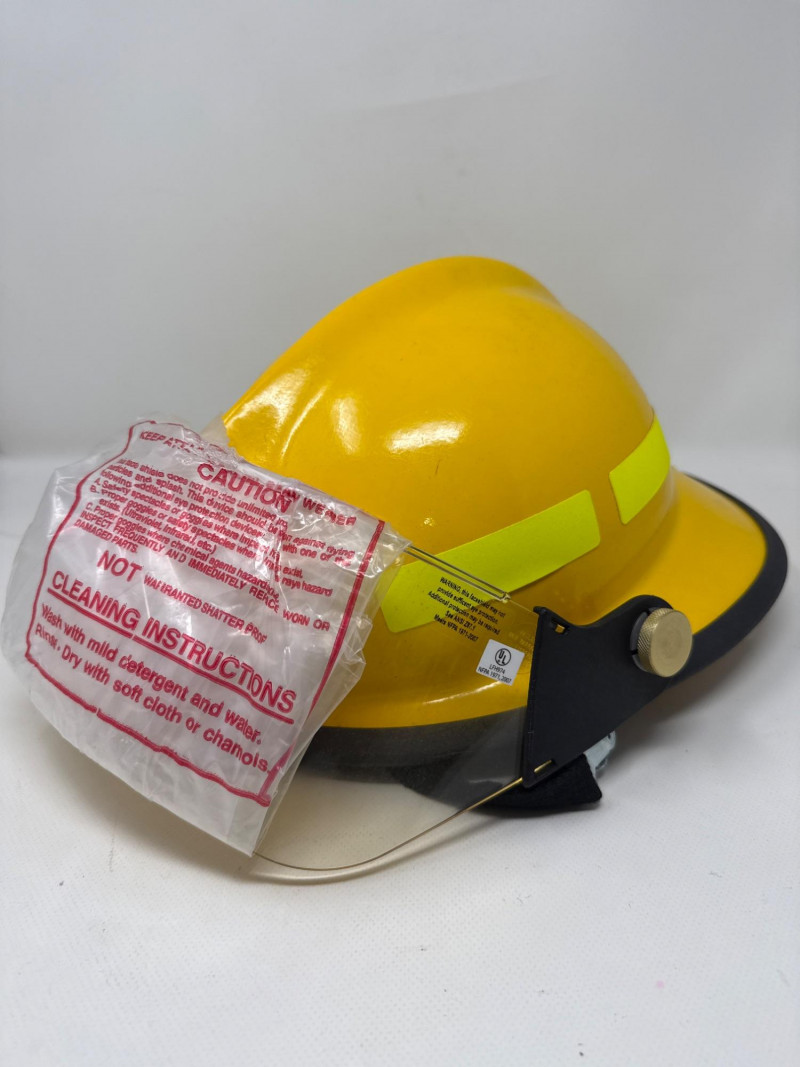 Set of 3 MSA Cairns yellow firefighter helmets (Legacy 5 models by Lion Apparel). Made in the USA with durable fiberglass composite shells, adjustable suspension, and chin straps—includes 1 helmet that appears unused with face shield, 1 that appears unused without face shield, and 1 used helmet with visible wear and attached face shield. All are no longer certified for active fire safety use. They are being sold for display, collection, training props, or costume/film use.