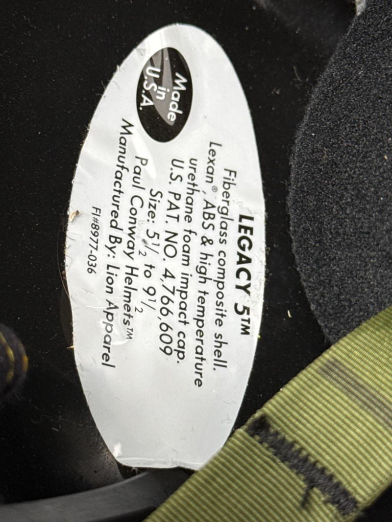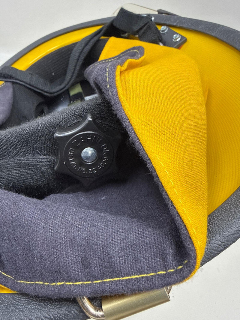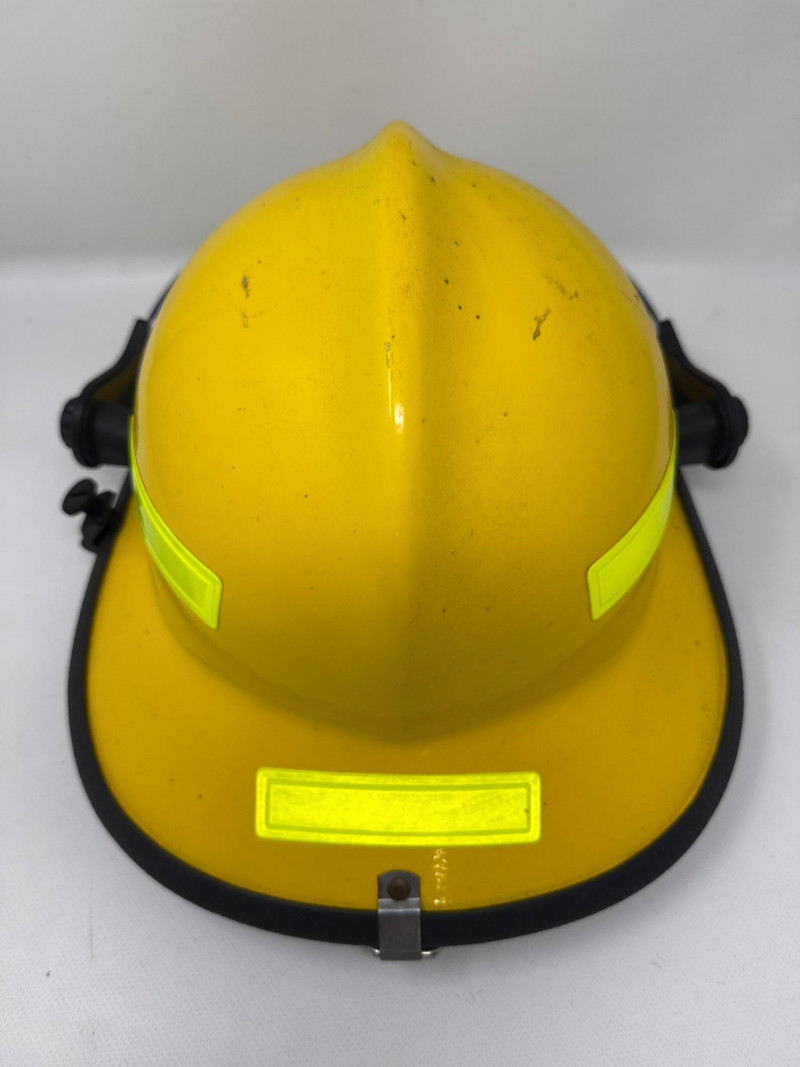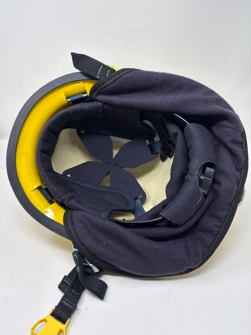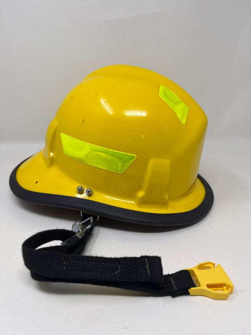 Set of 3 MSA Cairns yellow firefighter helmets (Legacy 5 models by Lion Apparel). Made in the USA with durable fiberglass composite shells, adjustable suspension, and chin straps—includes 1 helmet that appears unused with face shield, 1 that appears unused without face shield, and 1 used helmet with visible wear and attached face shield. All are no longer certified for active fire safety use. They are being sold for display, collection, training props, or costume/film use.