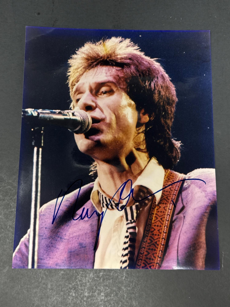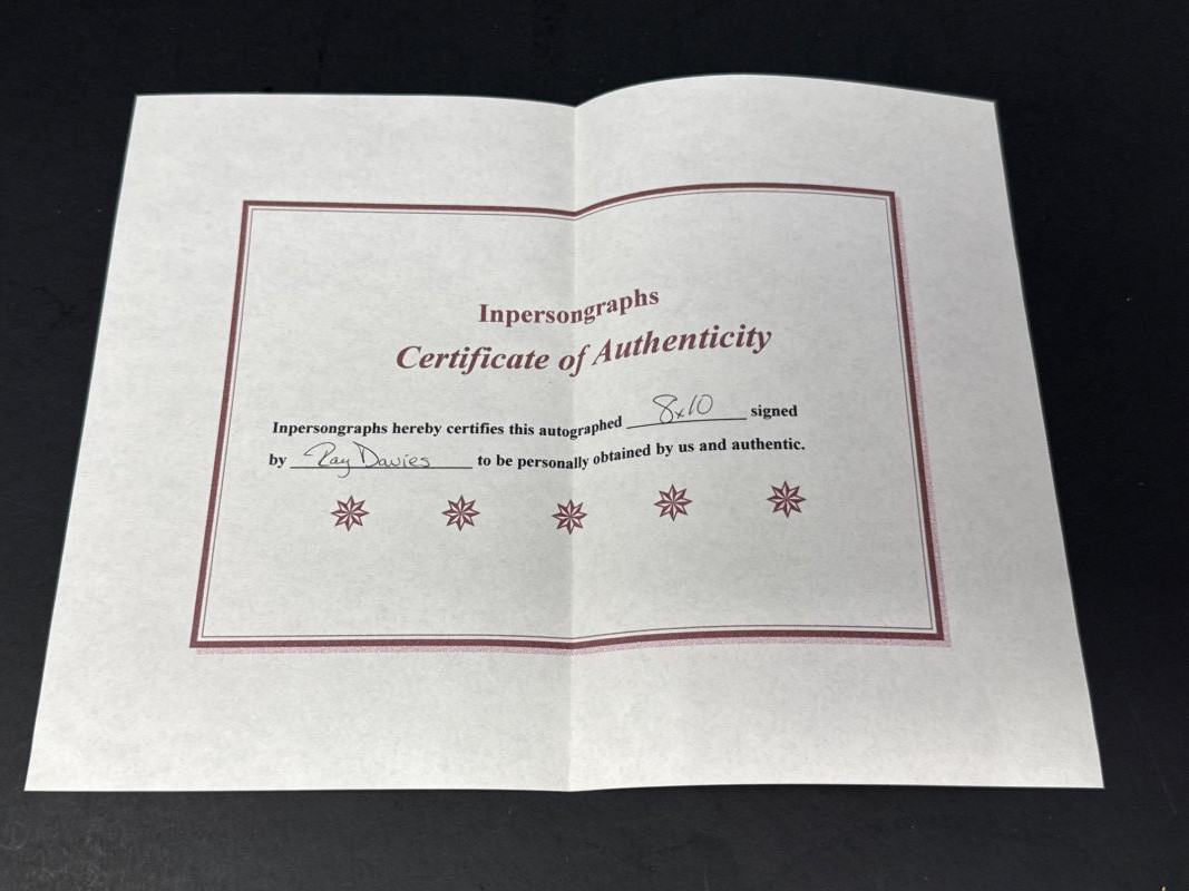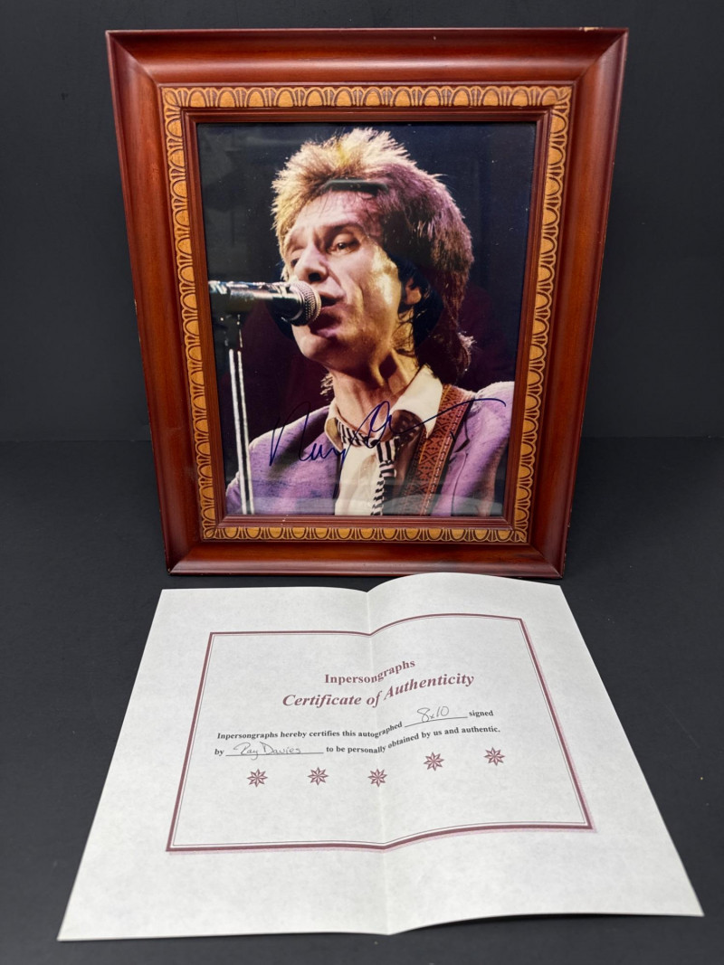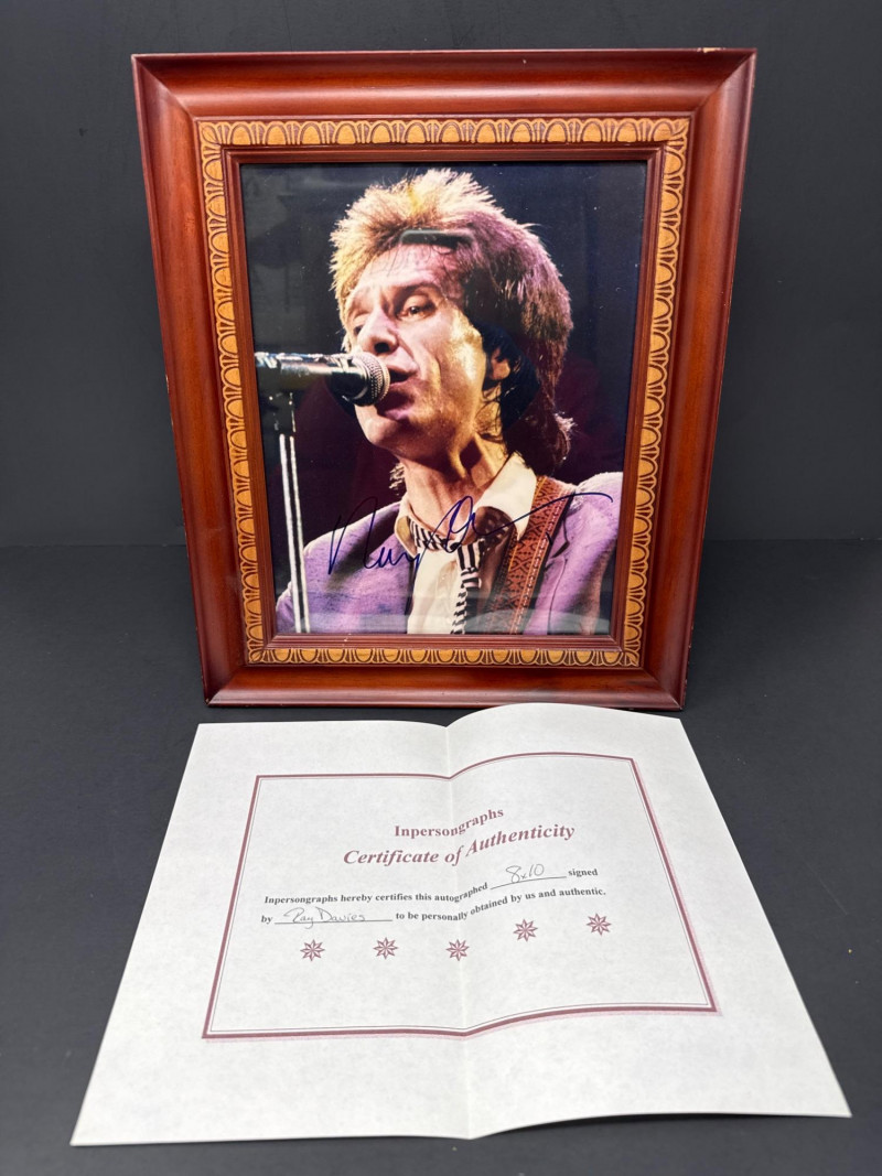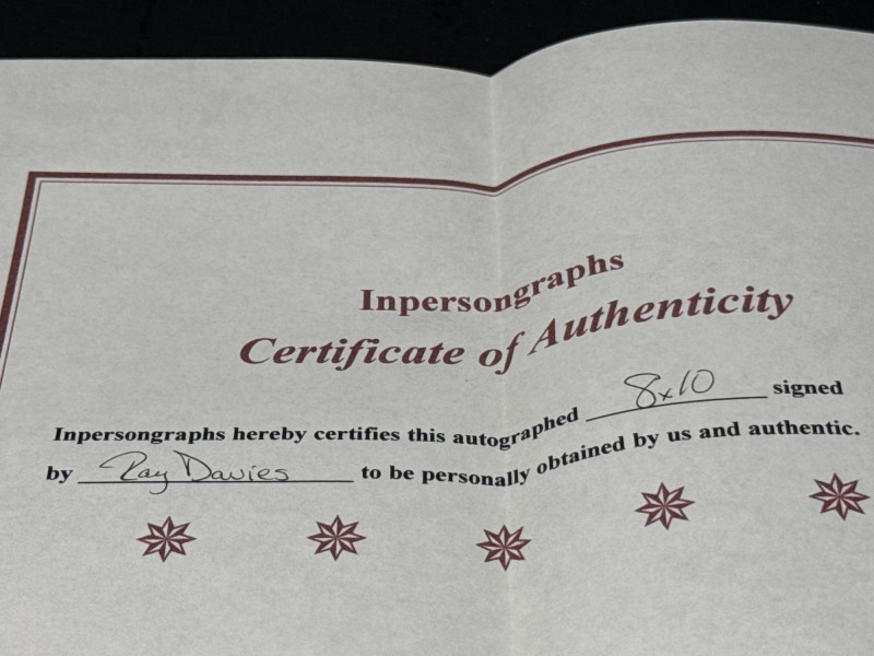 Authentic autographed 8x10 photo of Ray Davies from The Kinks. Beautifully framed and ready for display. The signature is clearly visible on the front of the photo, capturing an iconic performance moment. Includes a Certificate of Authenticity from Inpersongraphs confirming the autograph was personally obtained. A great collectible piece for fans of classic rock and The Kinks.