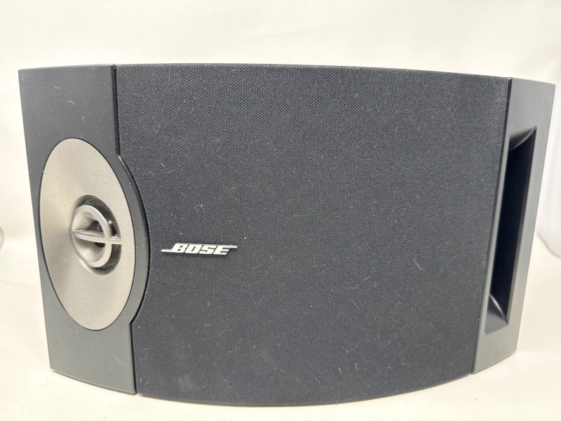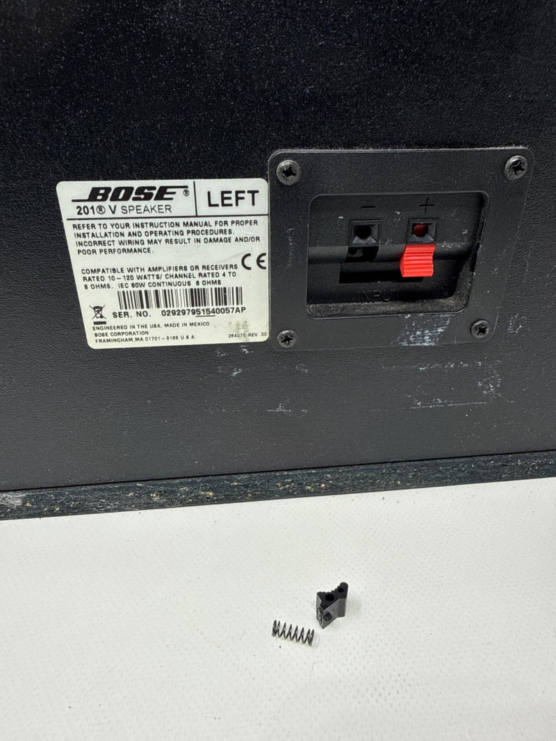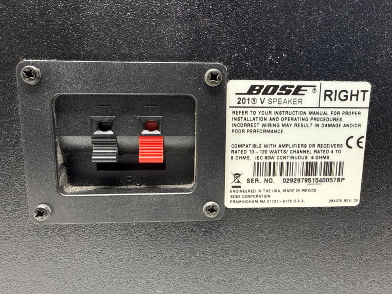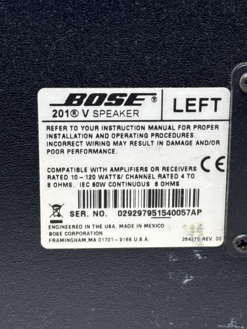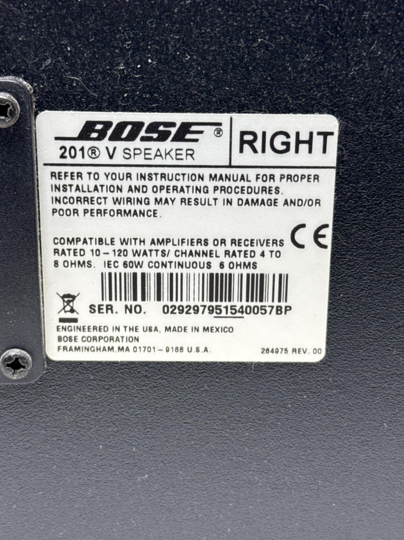 Pair of Bose 201V speakers, includes one left and one right unit (serial no. 029297951540057 AP). Features Bose’s direct/reflecting design for wide sound coverage and clear audio performance. Compatible with amplifiers or receivers rated 10–120 watts per channel, 4–8 ohms (IEC 60W continuous, 6 ohms). One speaker has a loose wire bracket. Not tested.