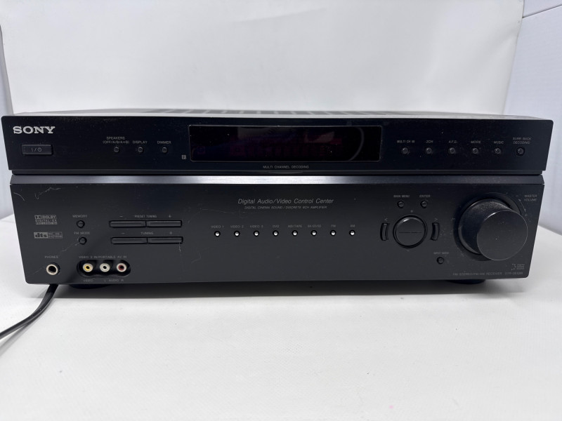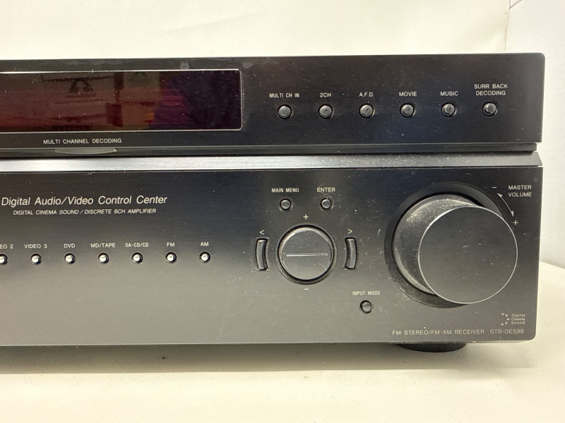 Sony STR-DE598 digital audio/video control center receiver. Unit powers on and display lights up as shown, but has not been fully tested. Features multi-channel decoding and multiple audio/video input options including component and RCA connections. Cosmetic condition is good overall with normal signs of use; top surface has a small indent (see photos).