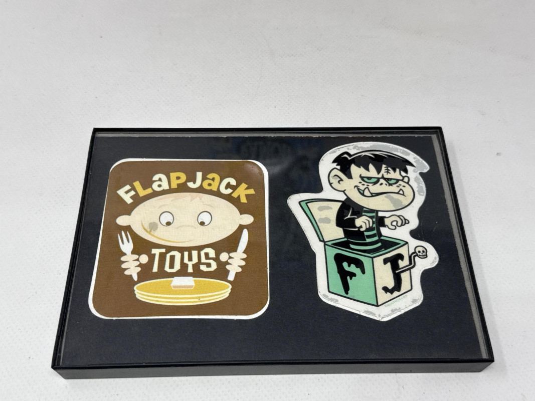 4. Flapjack Toys Stickers: A flat, black picture frame labeled “Flapjack Toys. Stickers featuring artwork of the same characters—Ramon, Ivan, Von Bakker, and others from the Skully Series.