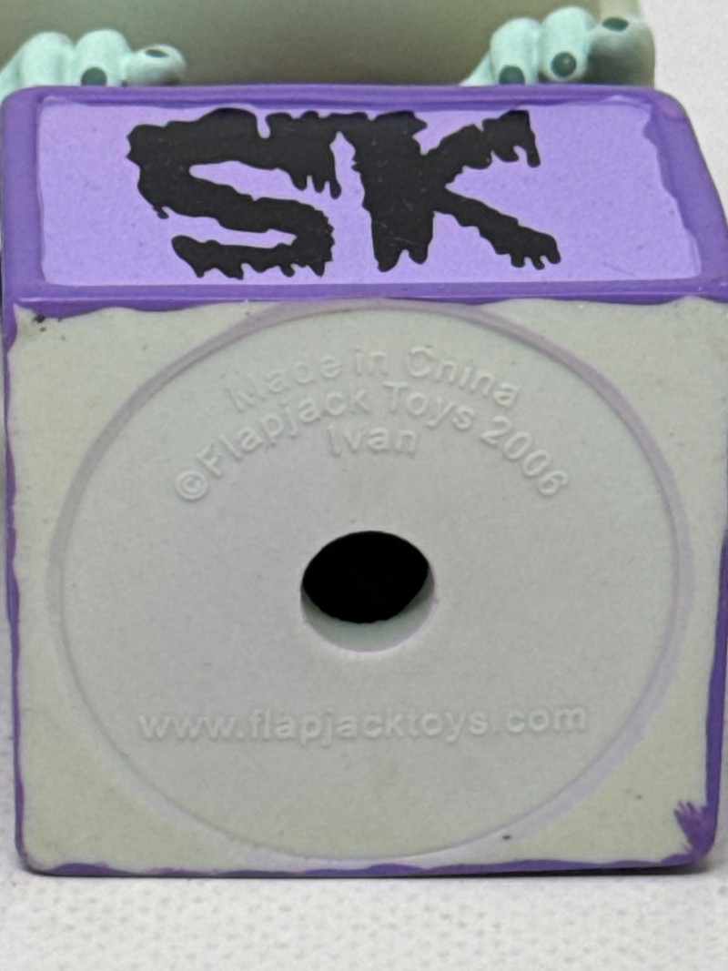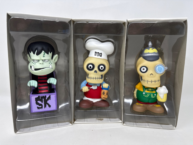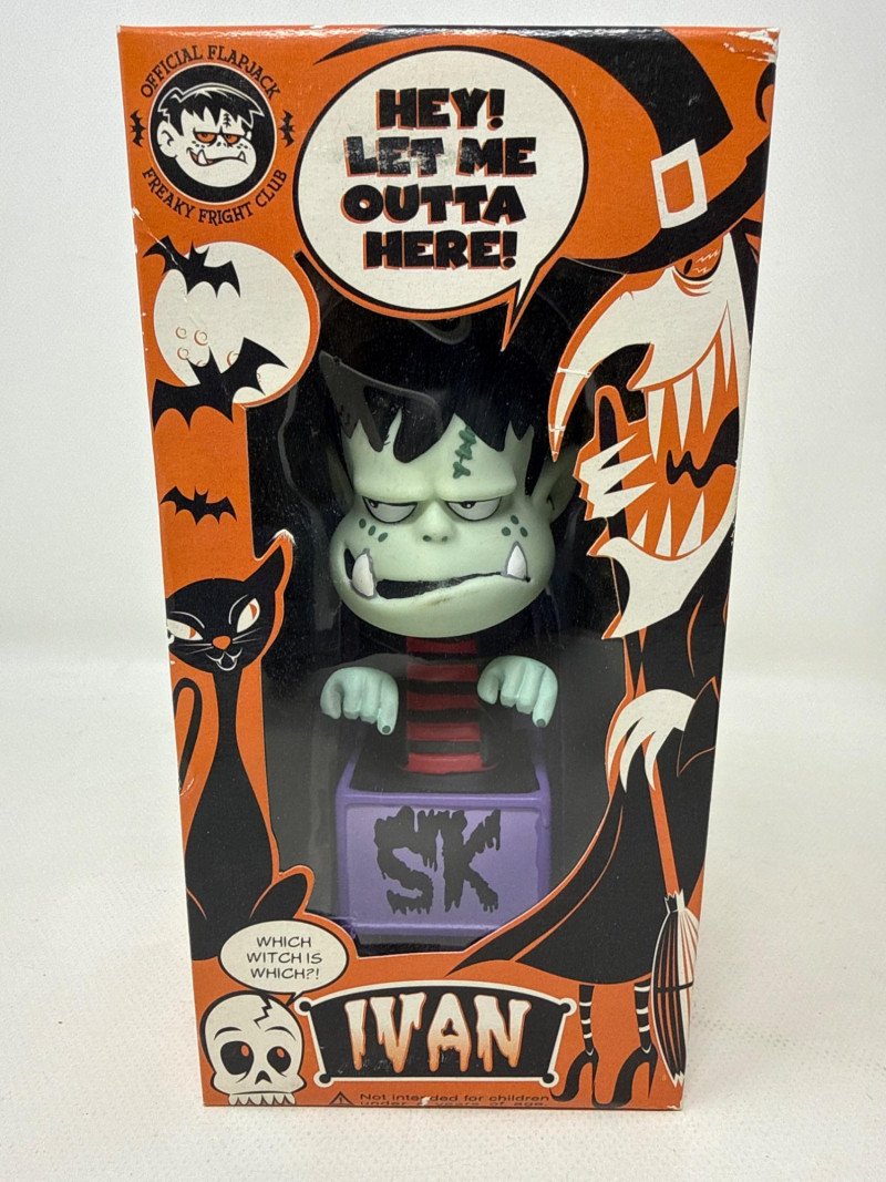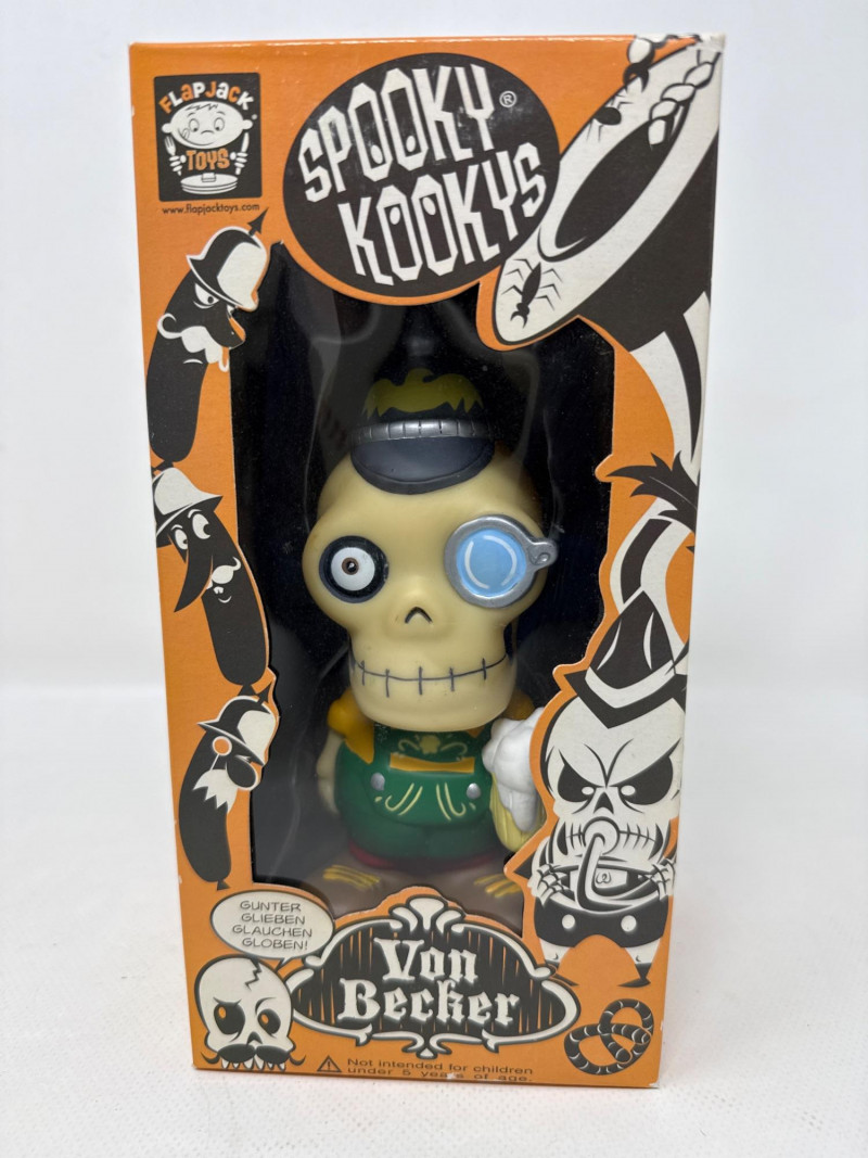 Up for auction is a set of 3 Flapjack Toys “Spooky Kooky” vinyl figures including Ivan, Ramon, and Von Becker, along with original boxes and Framed stickers. Each figure stands approximately 6 inches tall outside of the box and features unique character designs with detailed paint and accessories. Figures are marked © Flapjack Toys 2006. 1. “Ramon” Vinyl Figure – Skully Series