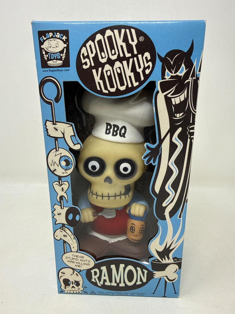 Character Design: Ramon has a skull‑like head with hollow eyes and a wide toothy grin. He wears a white chef’s hat and a white apron with “BBQ” printed across the front. His body is small and rounded, typical of designer vinyl figures.