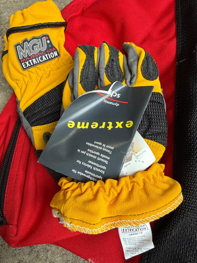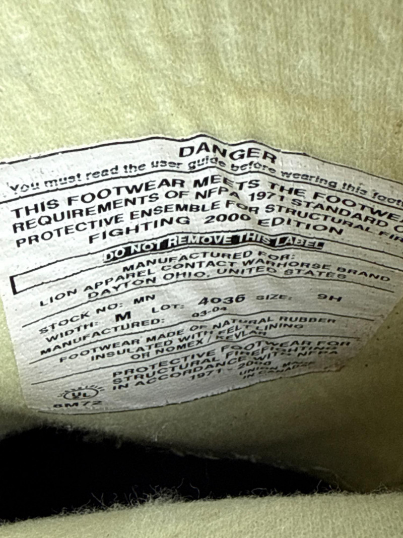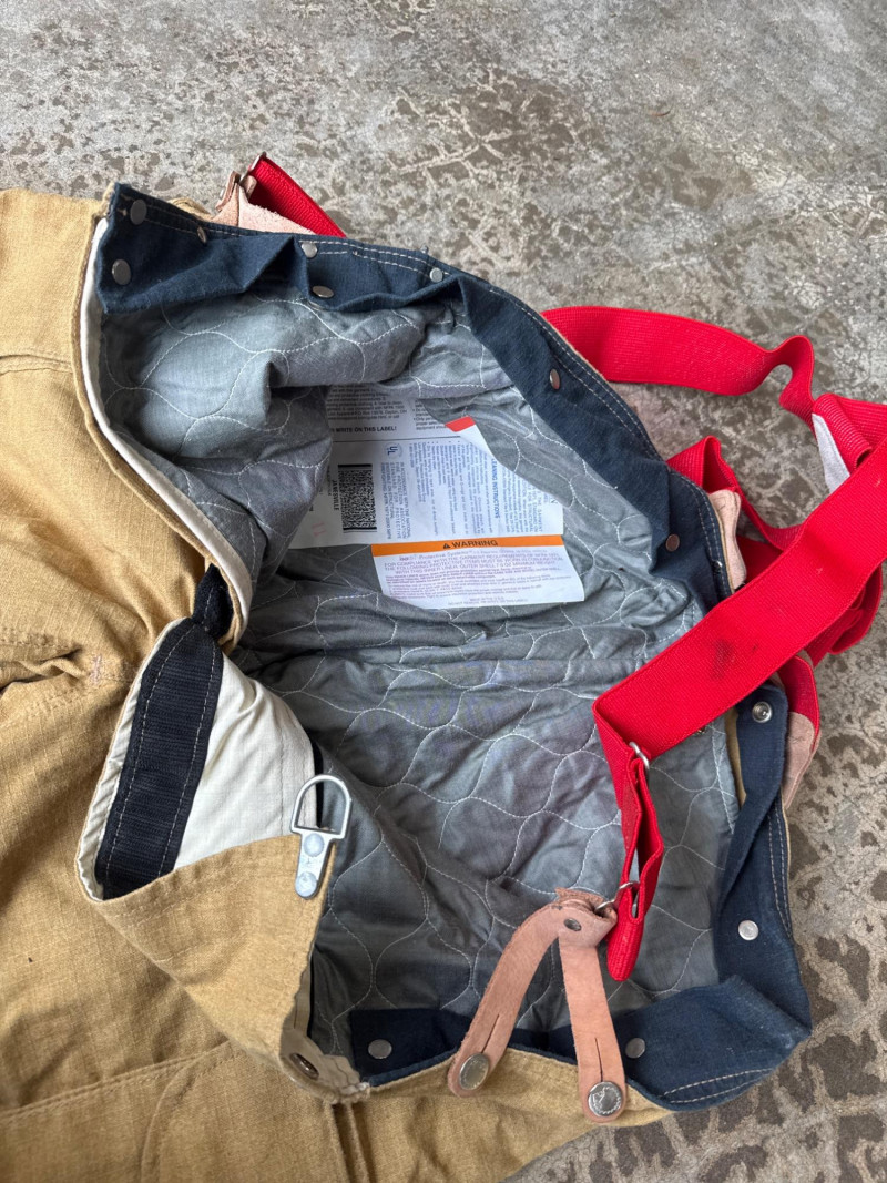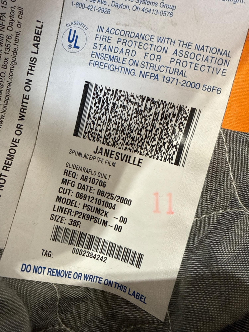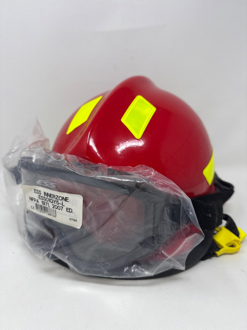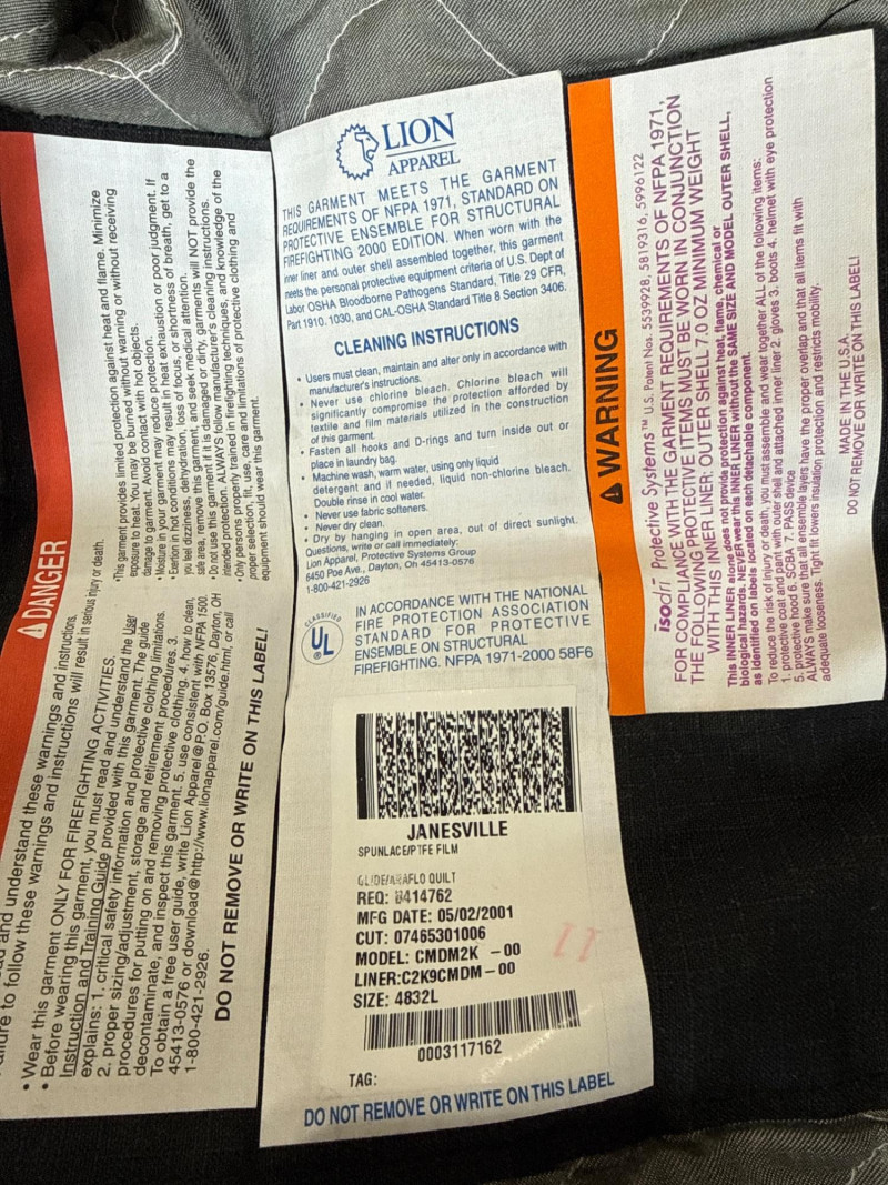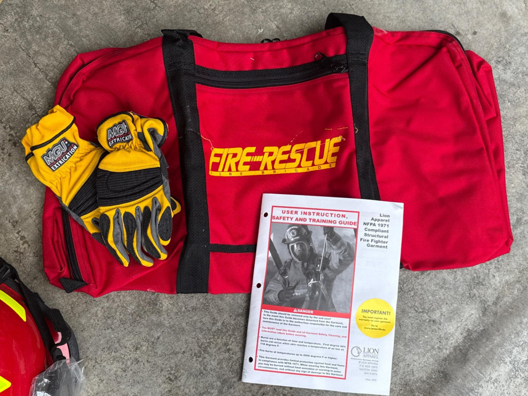 Rescue Bag — A red bag labeled “RESCUE,” likely used to carry essential emergency tools or medical supplies. Booklet/Pamphlet — A printed booklet placed near the boots, containing text and an image related to firefighting—possibly training material, safety guidelines, or equipment instructions. Gear shows signs of use and storage but remains in solid overall condition. Helmet still has protective plastic on visor. See photos for details, labels, and sizing information. Sold as a collectible, prop, costume, training gear or personal use. No longer within current codes.