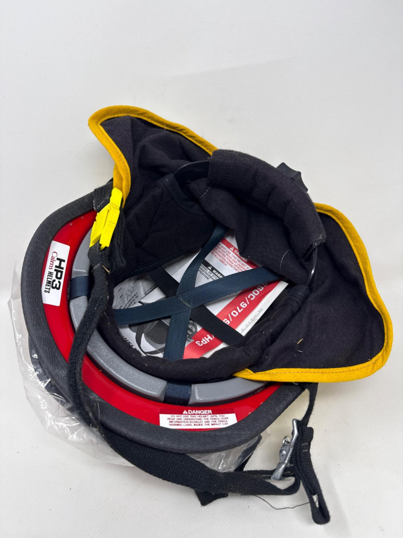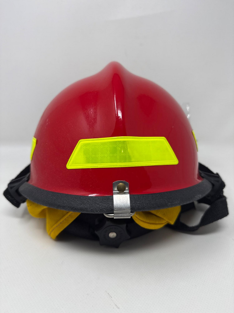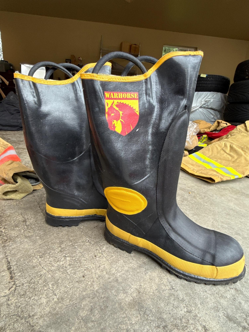 Firefighting Boots — Heavy‑duty black boots with yellow accents, built for durability, traction, and protection from heat and sharp objects. Steel toe Fire Helmet — A red firefighter helmet with yellow reflective markings, offering head protection and high visibility.