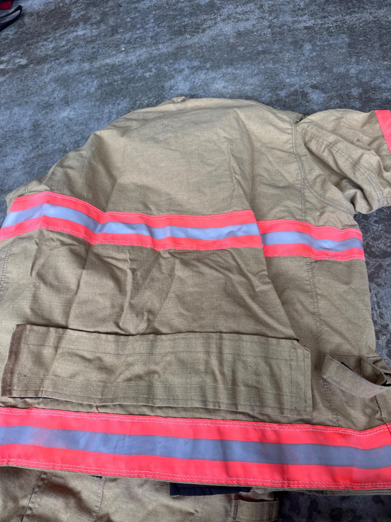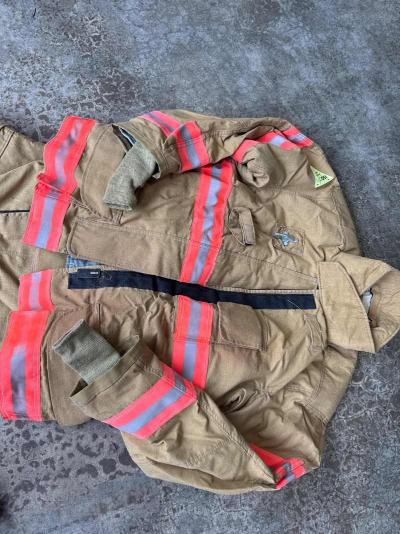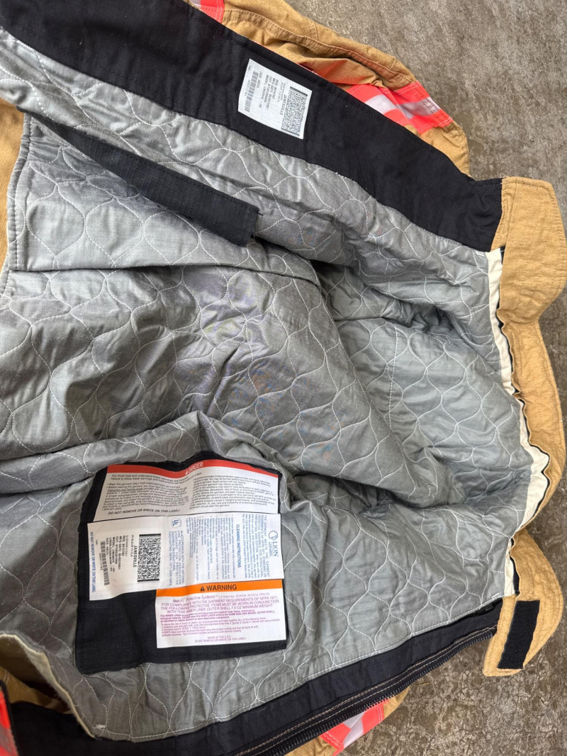 Complete personal fire safety kit set. Includes turnout jacket, fire helmet with face shield/goggles, rubber firefighting boots, protective gloves, and a “Fire-Rescue” gear bag. Firefighter Turnout Jacket — A tan, fire‑resistant coat with bright red and silver reflective stripes for visibility and protection during emergency operations.