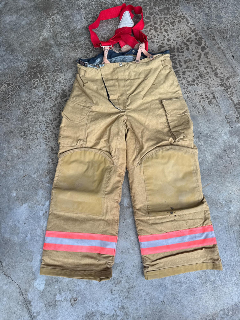 Firefighter Turnout Pants — Matching tan protective pants with the same reflective striping, designed to withstand heat, debris, and harsh conditions.