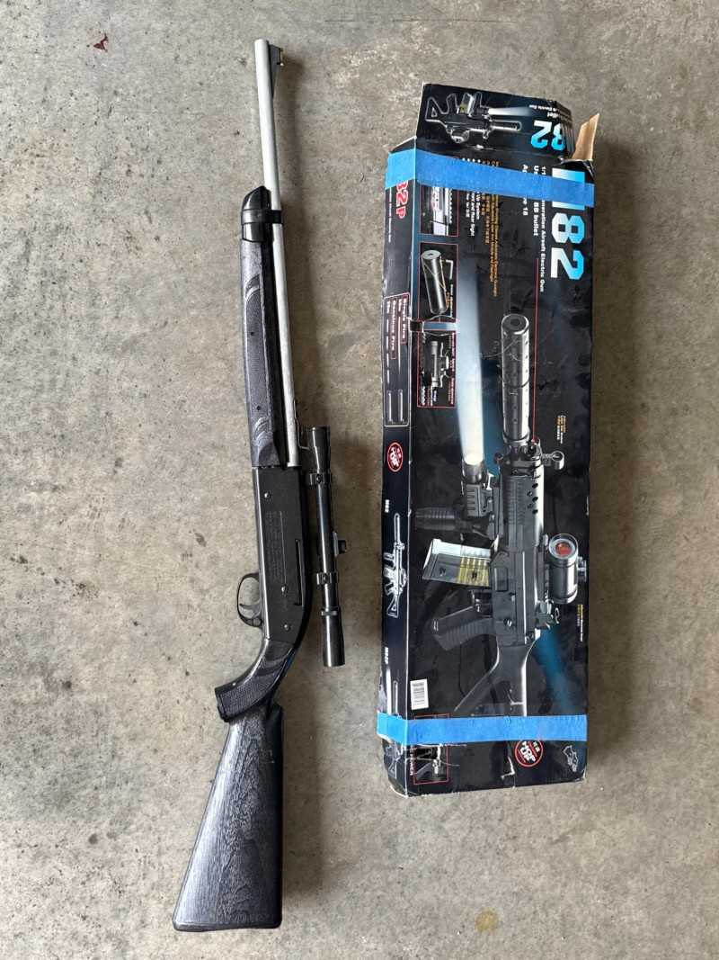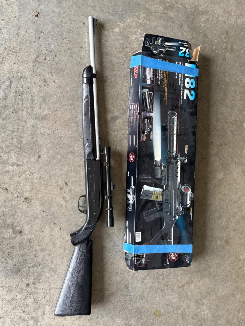 Lot includes a Remington Airmaster 77 multi-pump pellet rifle and an M82 6mm BB airsoft rifle with original box. The M82 measures approximately 27 inches long (as shown in box), while the Remington Airmaster 77 measures approximately 38.5 inches long. 1. Air Rifle / BB Gun