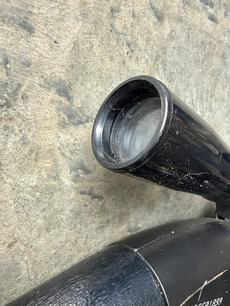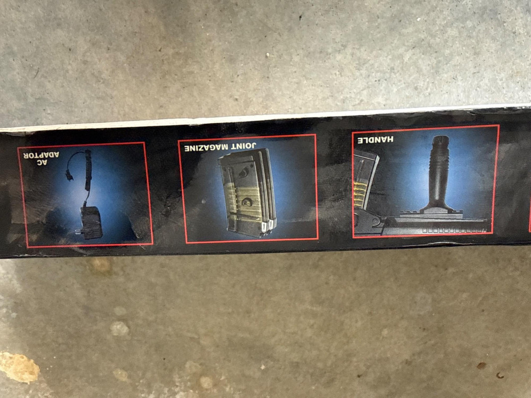 A smaller accessory, shaped like a foregrip or stabilizing attachment, also molded in black plastic. Both items are pre-owned and show signs of use such as surface wear, scuffs, and dust. The M82 airsoft rifle is missing its AC adapter. Neither rifle has been tested, and functionality is unknown.