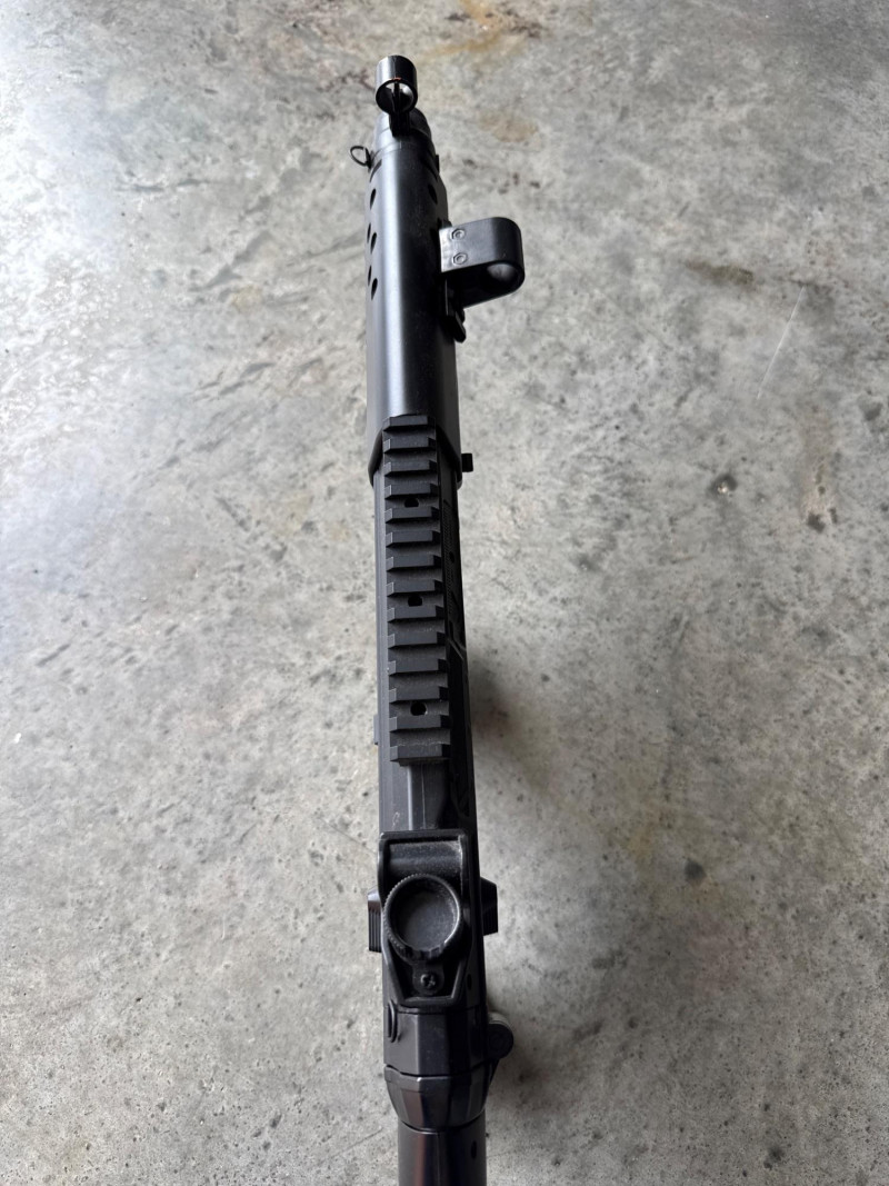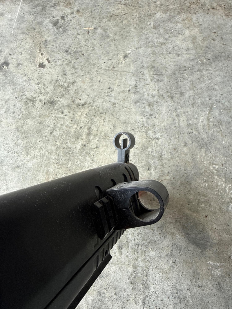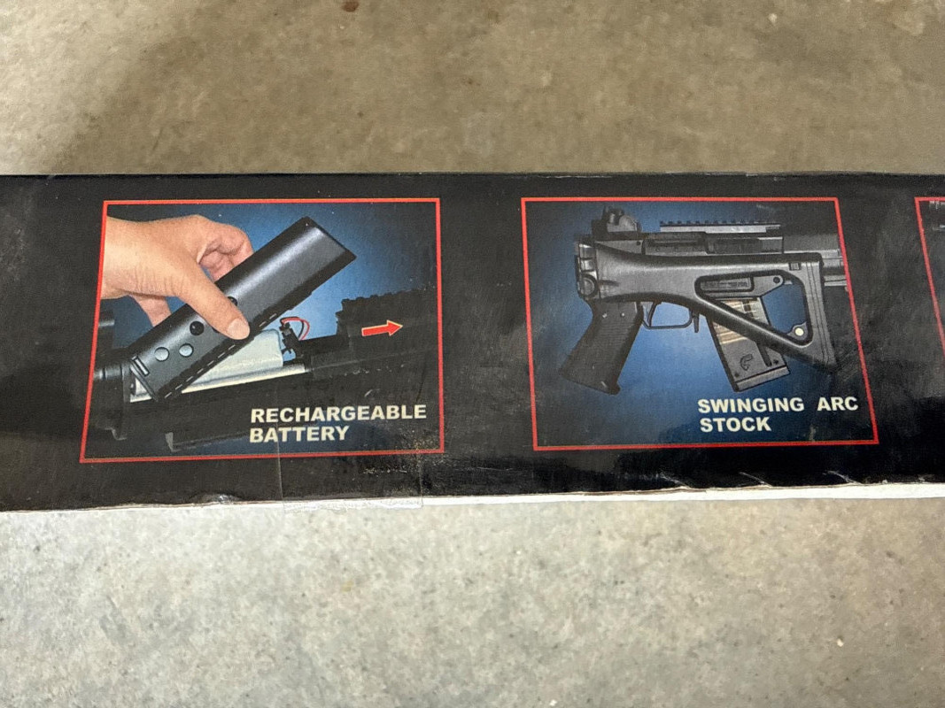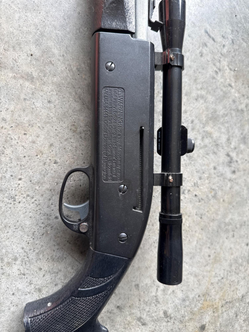 The main item is a black air rifle or BB gun with a long silver barrel.