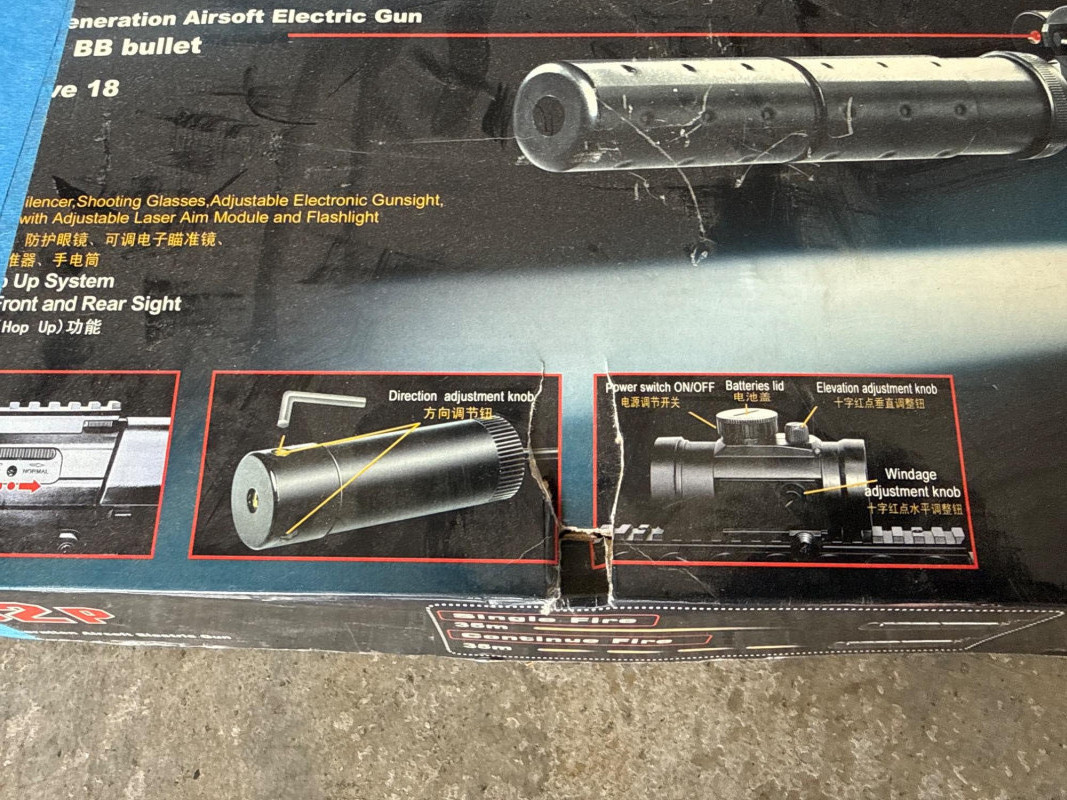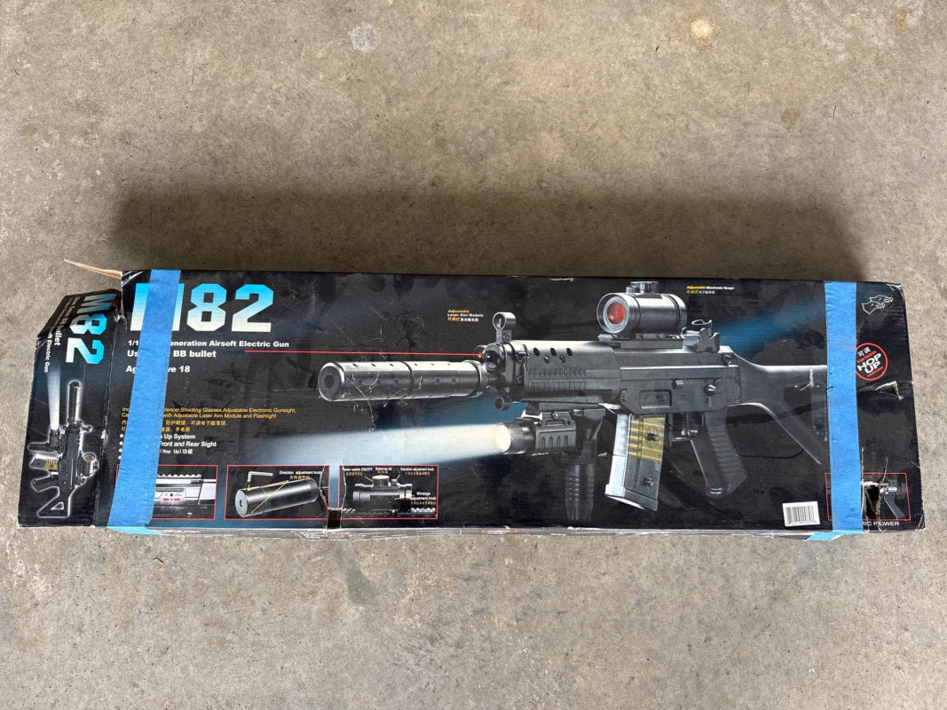 The barrel is metallic silver, contrasting with the darker body. The overall design resembles a lightweight, entry‑level airsoft or BB rifle rather than a high‑powered pellet gun. 2. The box is for Air Soft gun, model name “M82” is prominently displayed in bold lettering. Airsoft‑Style Rifle, black plastic toy or airsoft‑style rifle with a long, slender barrel.